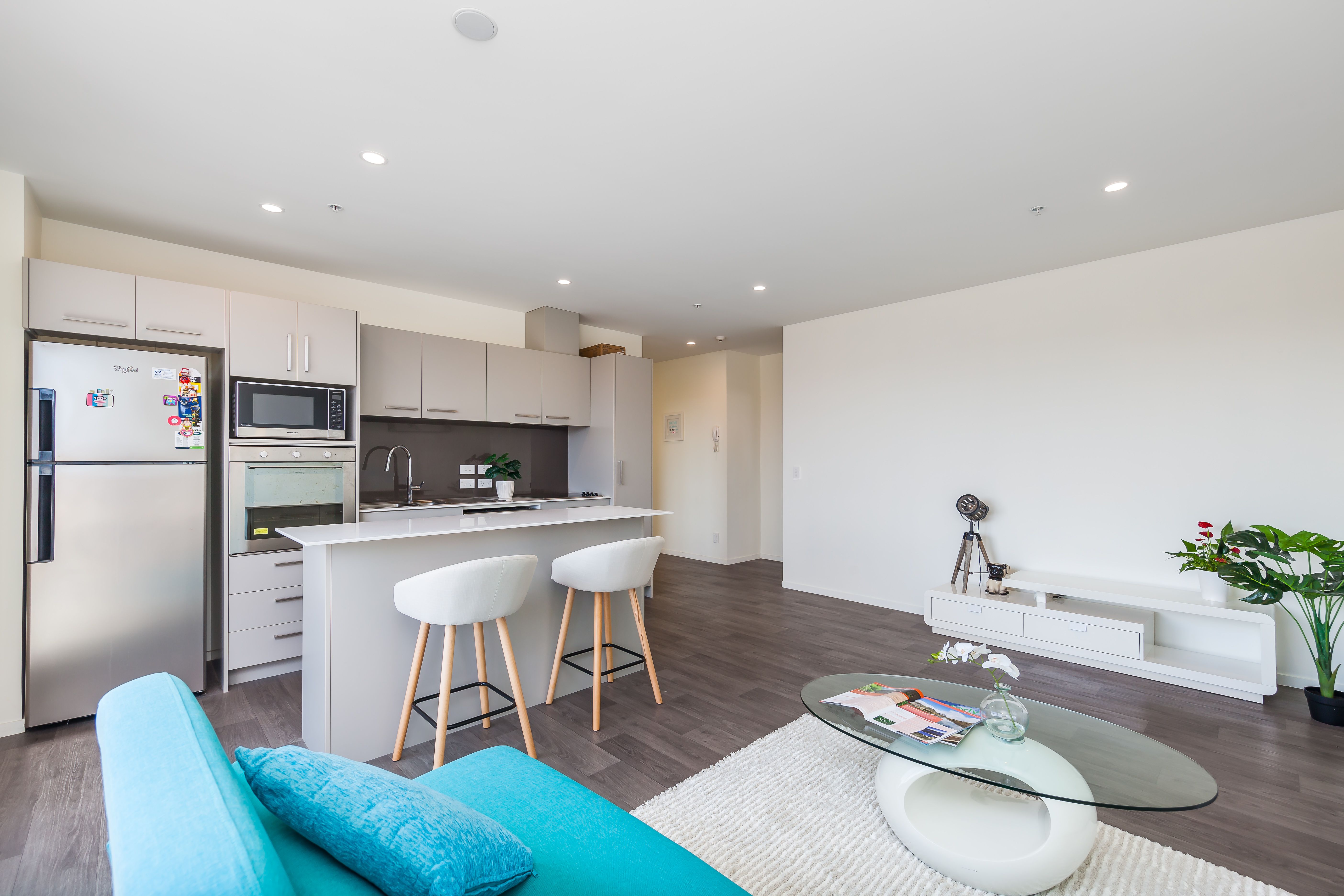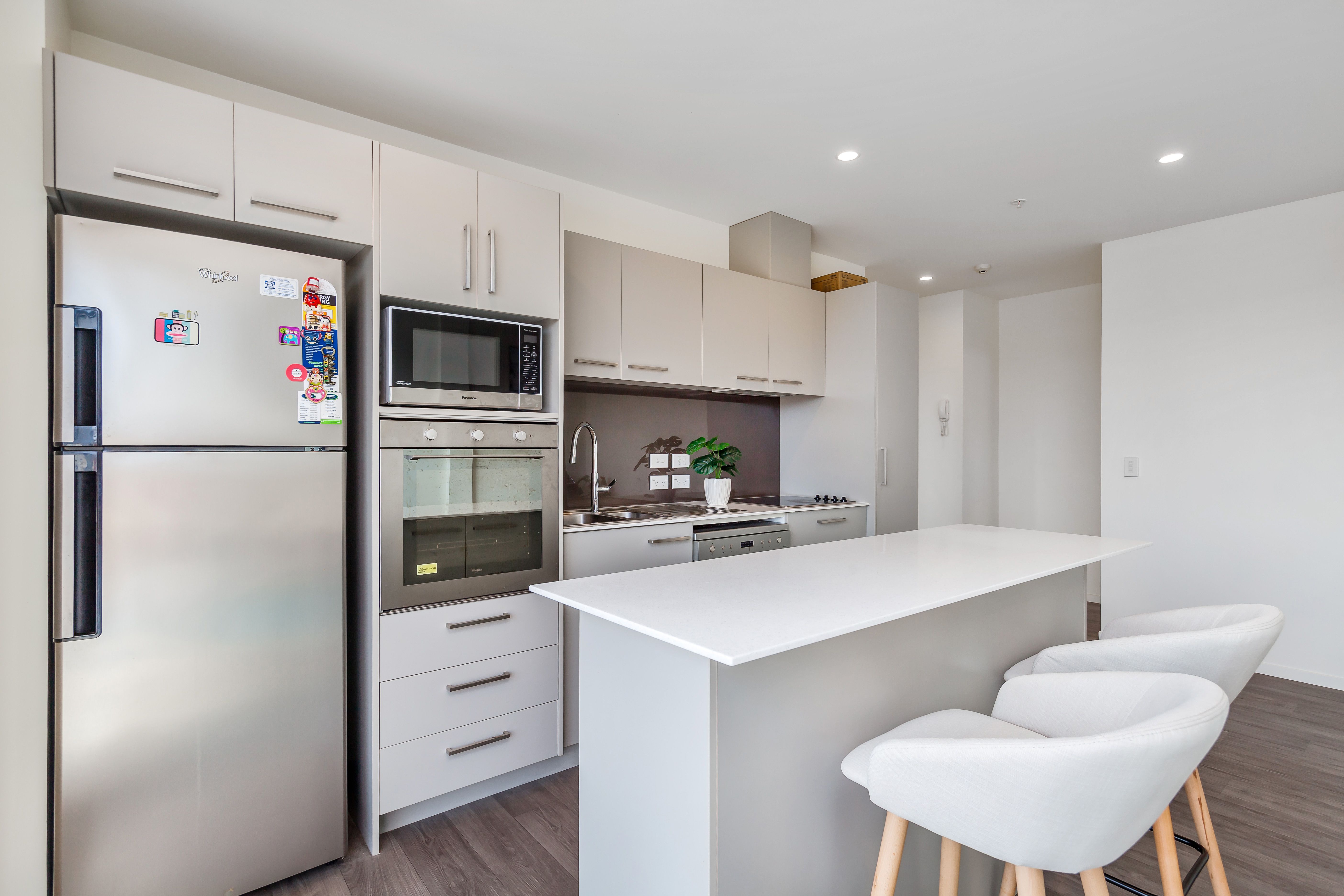 This modern design apartment has an open plan kitchen that blends seamlessly into the spacious and comfortable living and dining areas, with sliding doors that extend directly onto the sunny northwest facing balcony. A large bar in the kitchen makes it easier to communicate with family or visiting friends while cooking.
