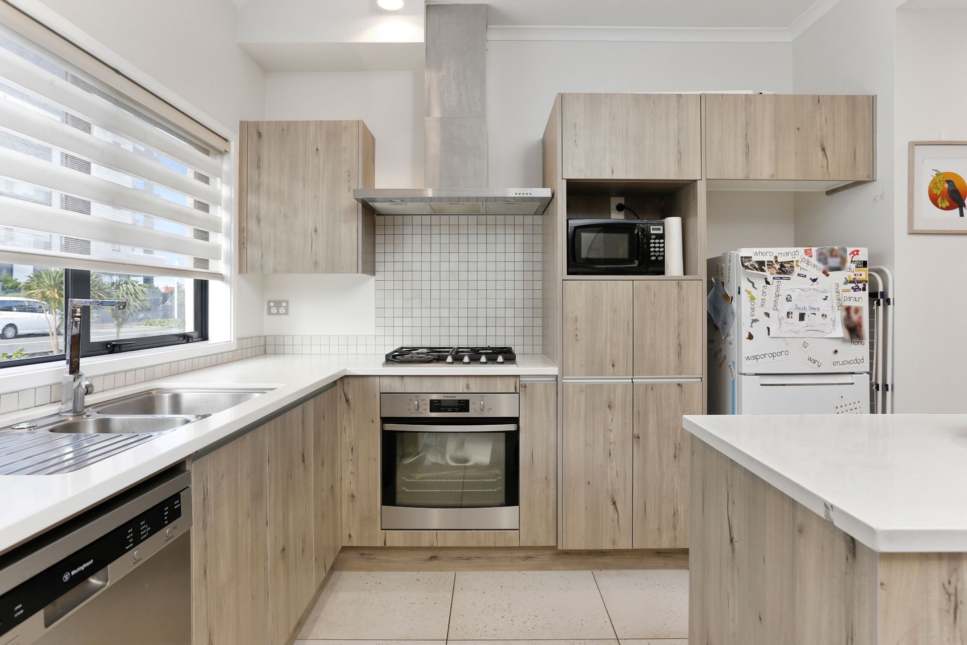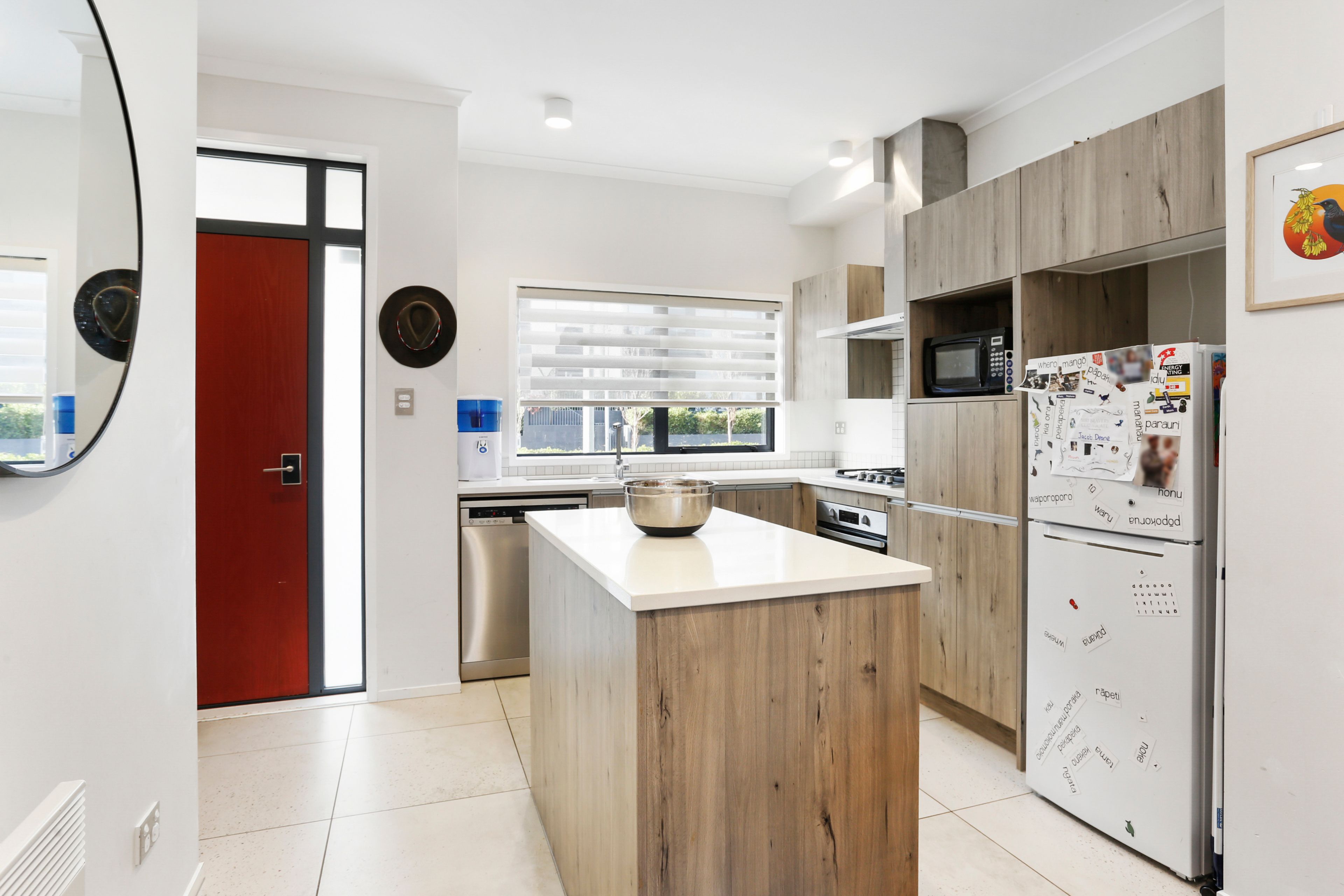 The ground level is completely open plan from the stylish and well-equipped kitchen with an island bench and engineered