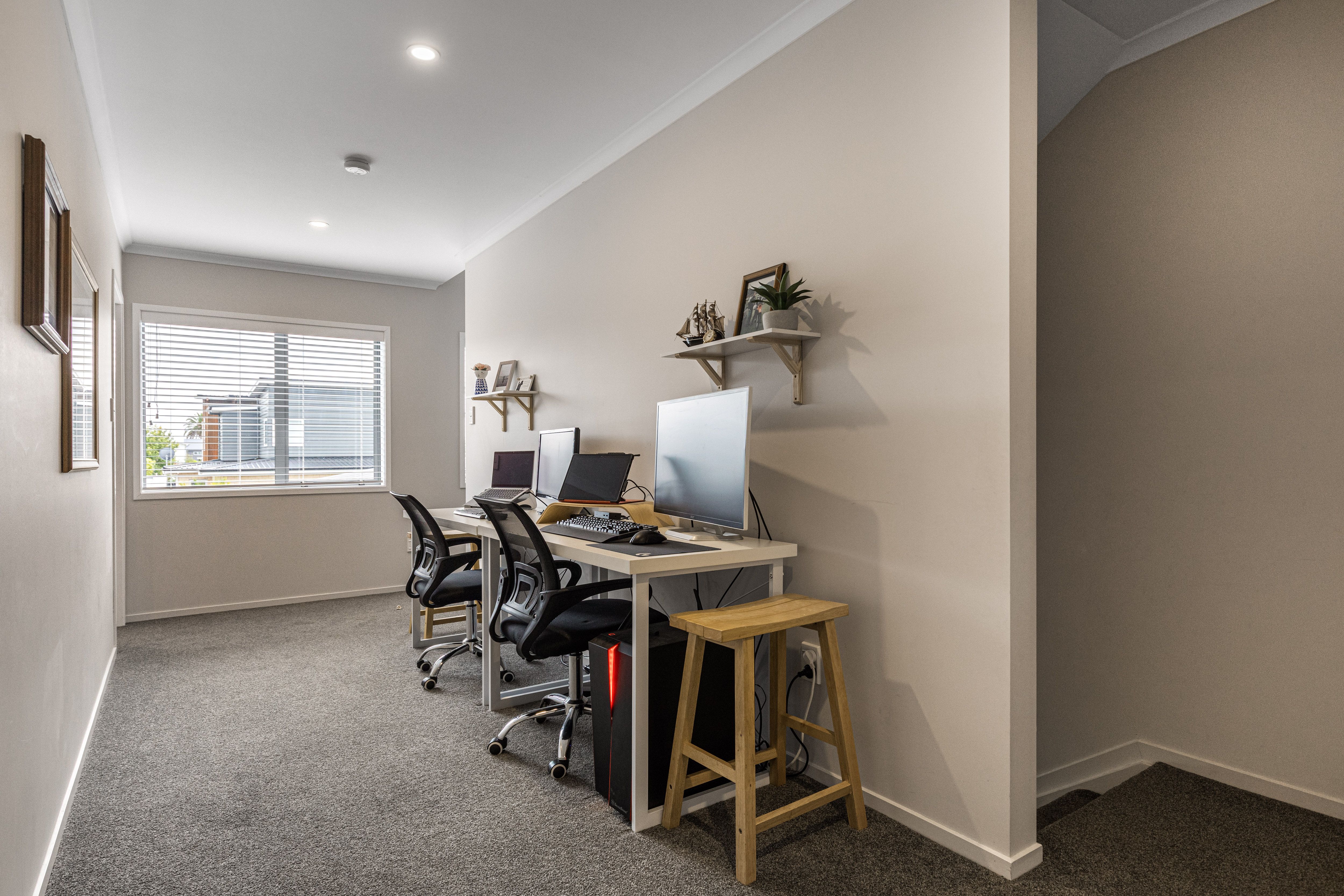 The middle floor has a landing area. It can be another living area, an office or a library? Off the landing, there are two large bedrooms with built-in robes, another sizeable bathroom, plus MORE storage space.