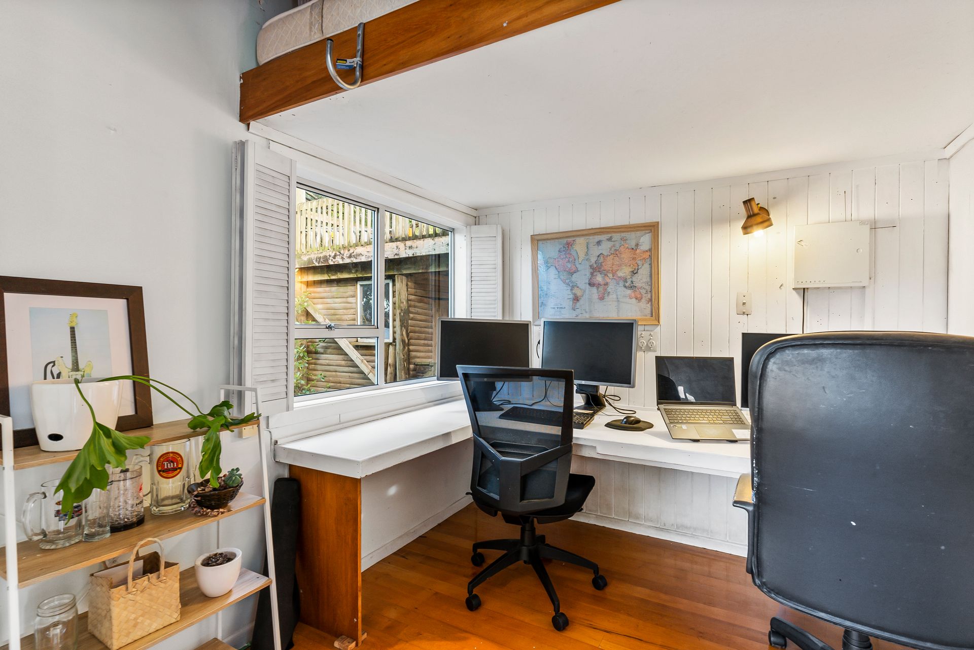 Retreat upstairs to the loft style master bedroom, with high beamed ceilings and a beautiful bay window seat featuring views that stretch over the green blanket of the Waitakere's - a perfect place to relax, escape and read a book. The private area also has its own ensuite for full functionality.