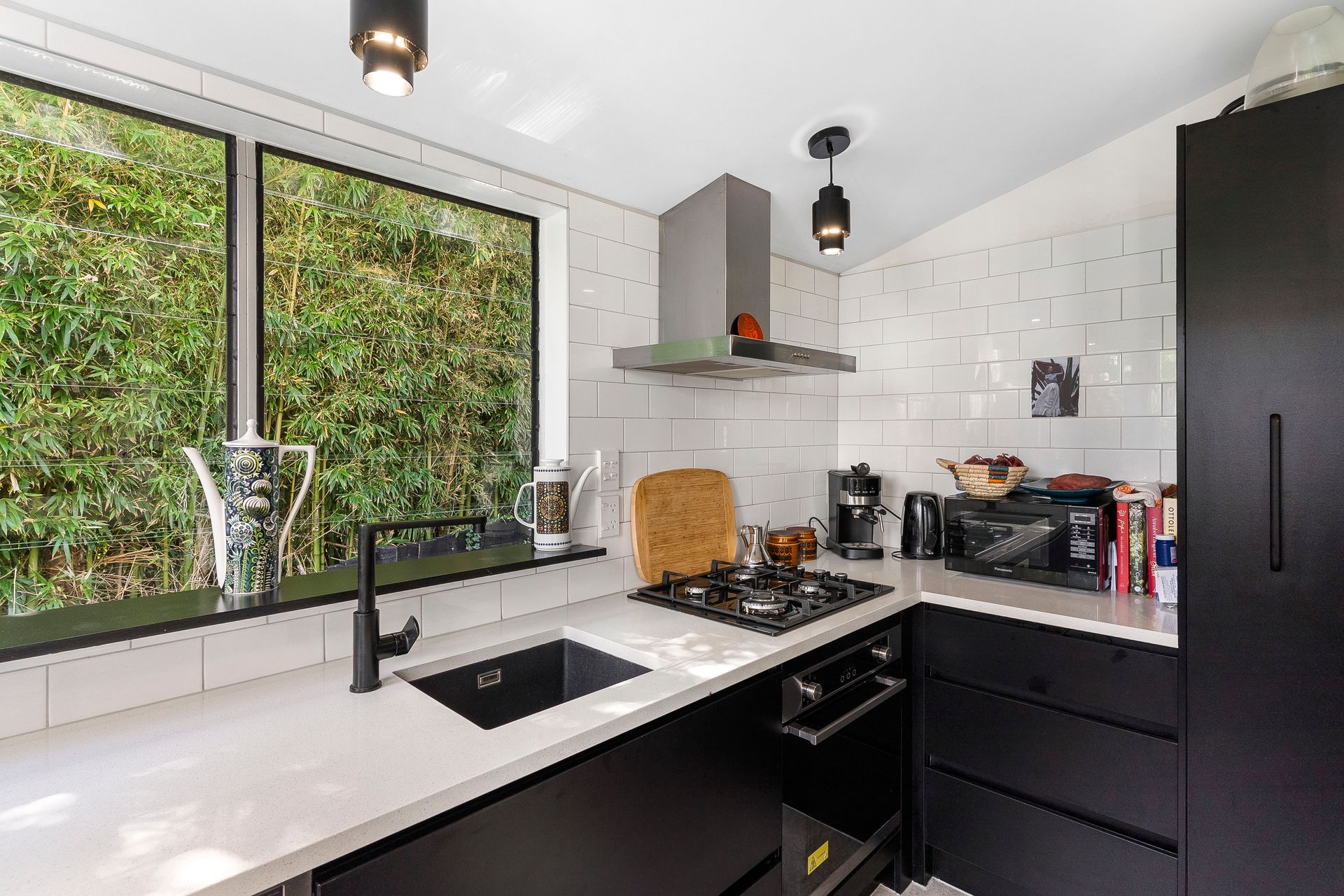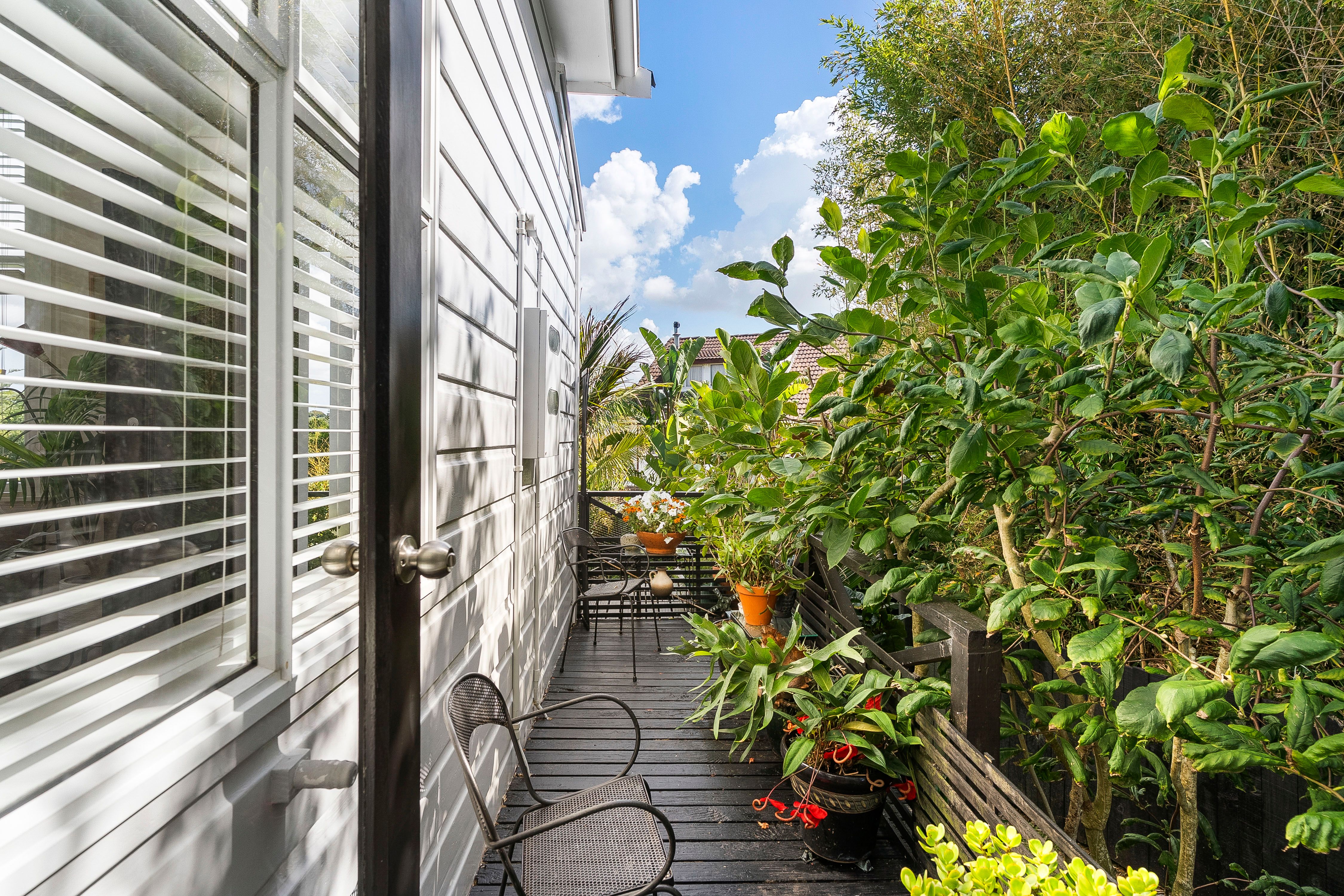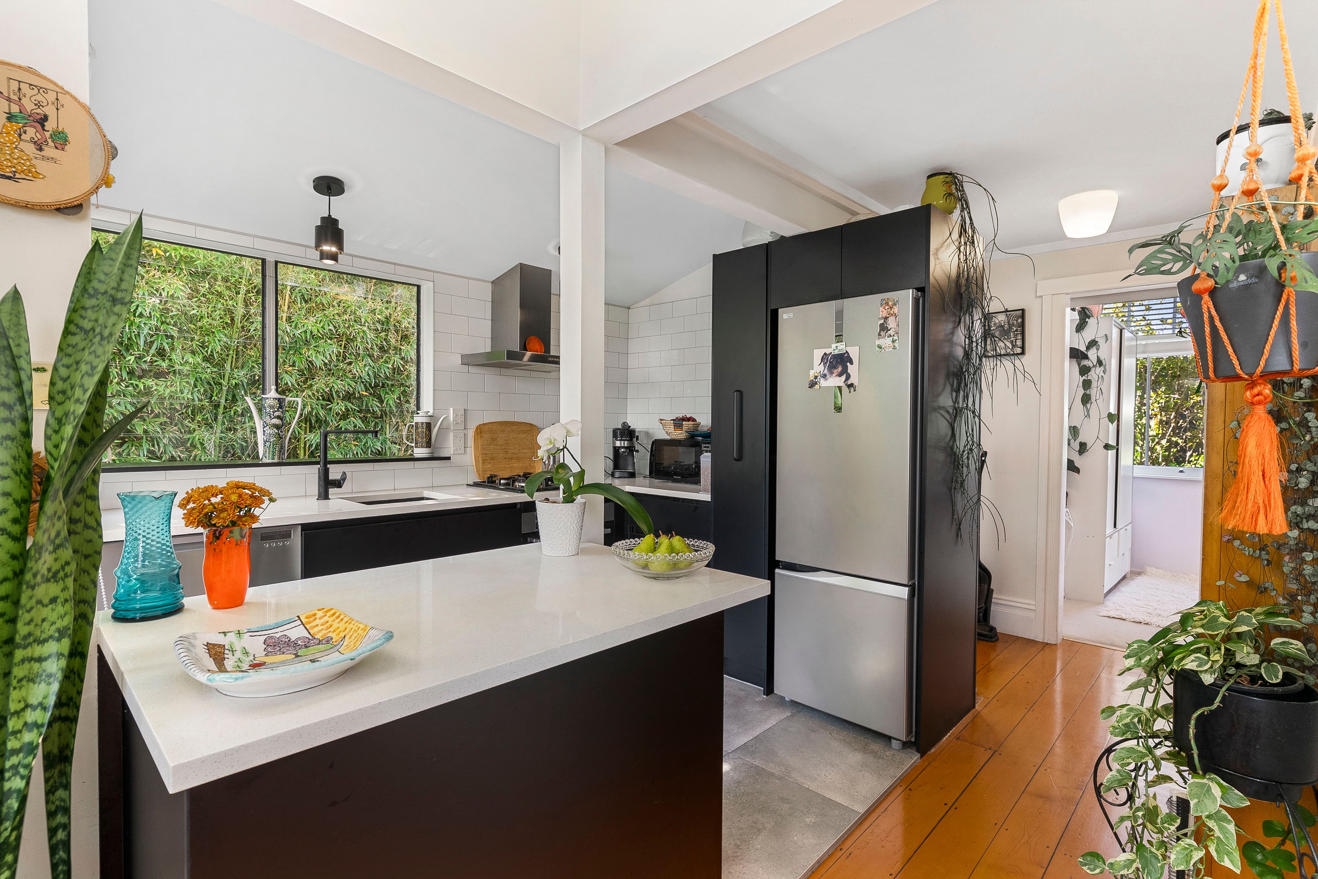 The home is discreetly positioned down a private ROW, facing north for sun, warmth and wellbeing. Once inside; you'll love the show-stopper kitchen, beautifully designed, black-and-white themed, with gas cooking. The very stylish louvered glass windows enhance the space, plus there's a handy side door opening to the deck.
