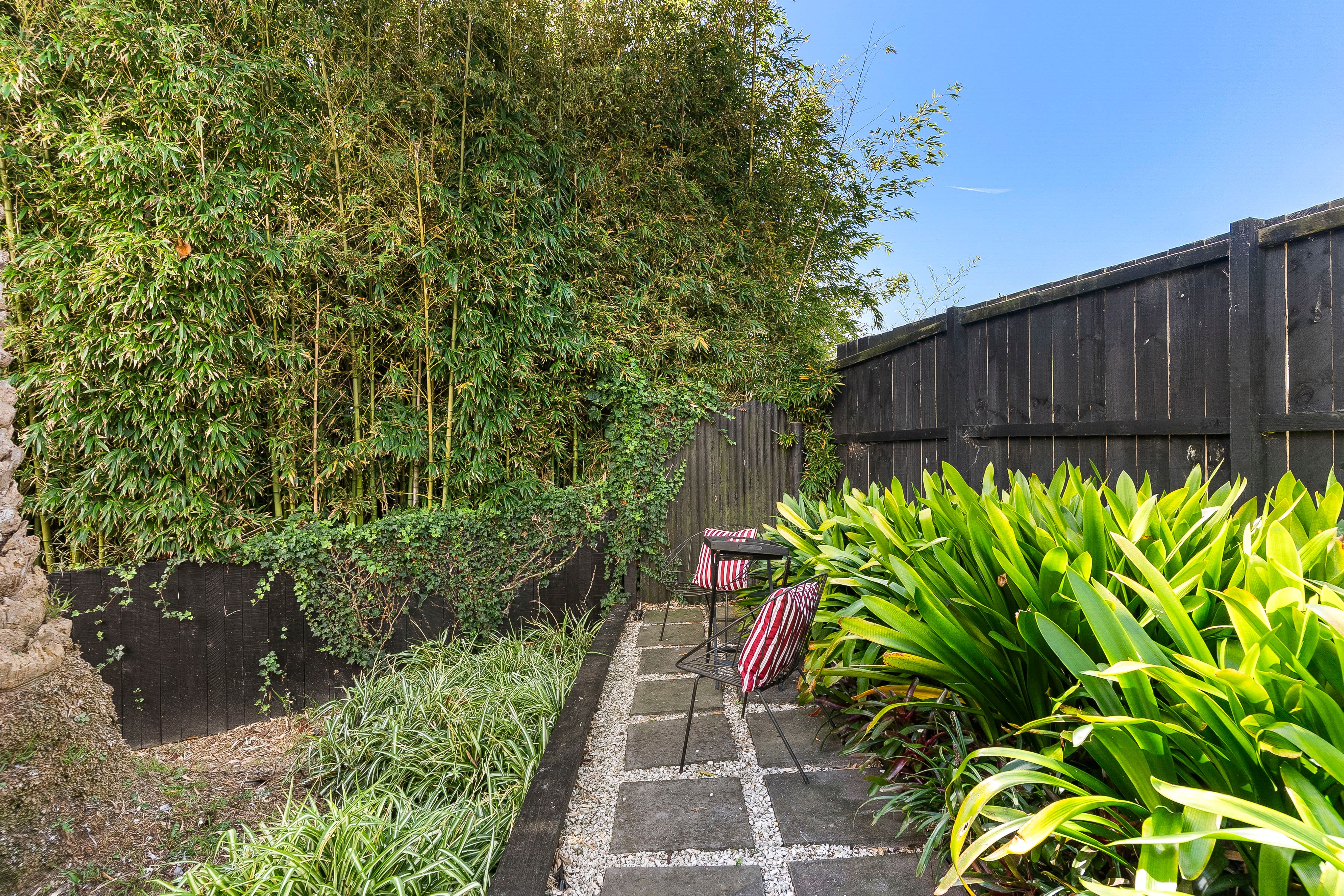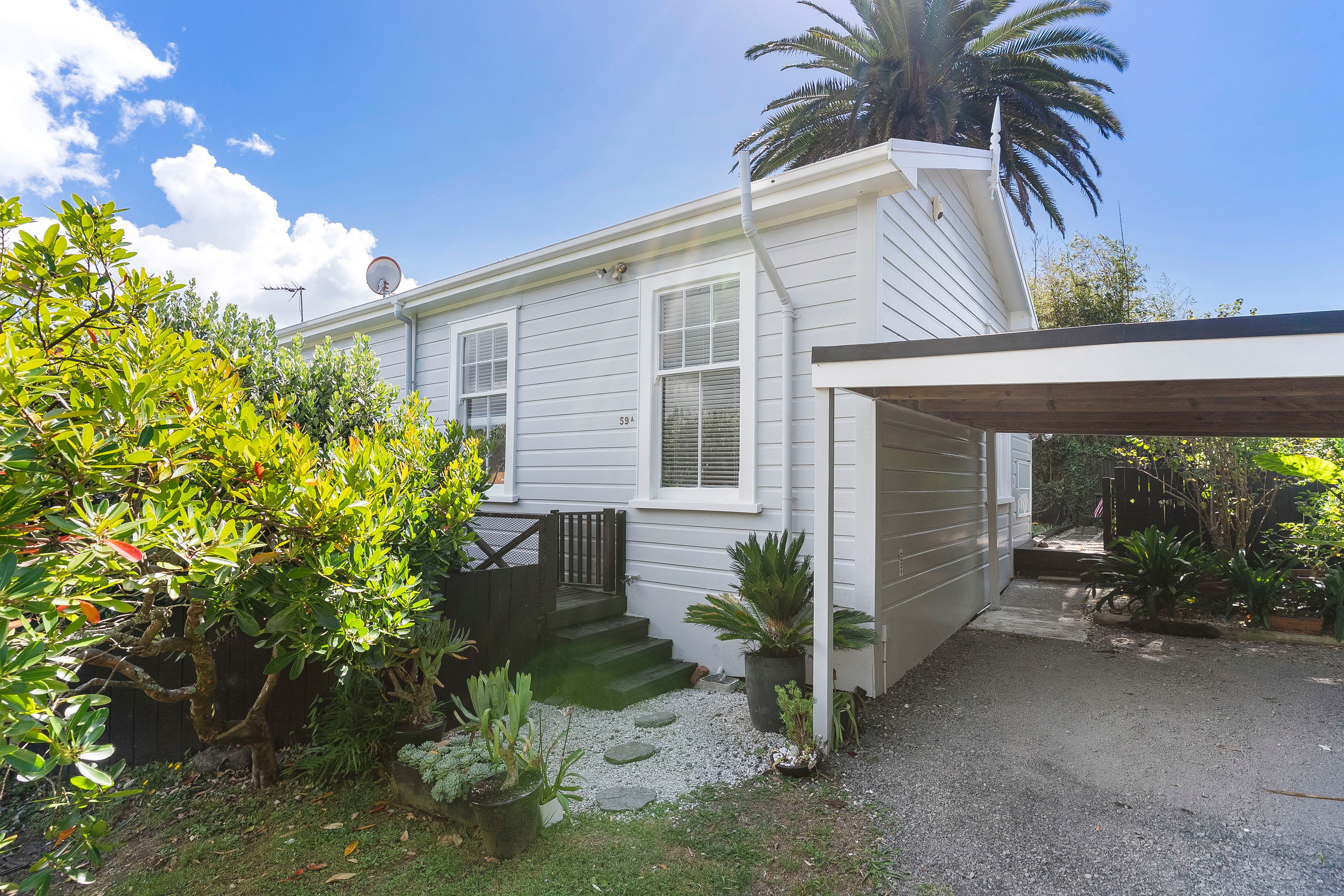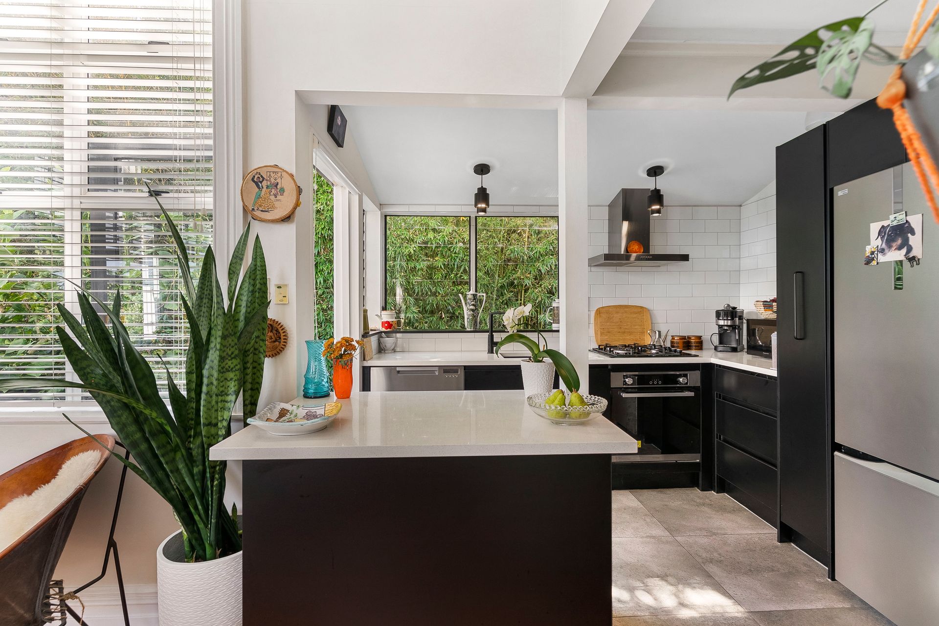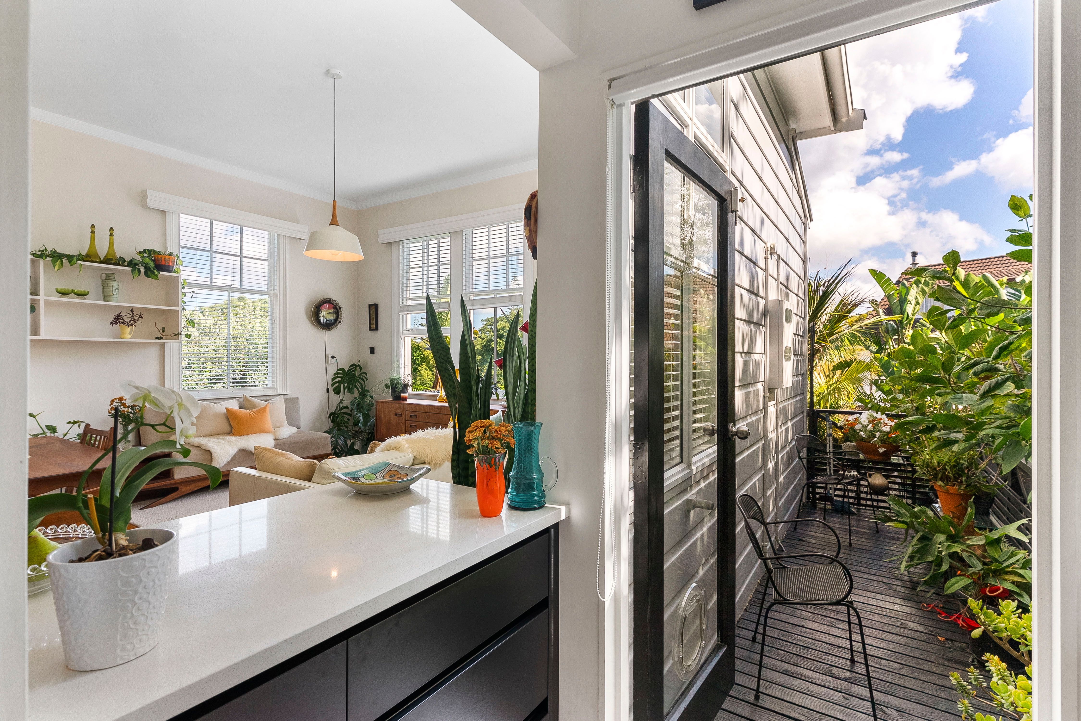 The home is discreetly positioned down a private ROW, facing north for sun, warmth and wellbeing. Once inside; you'll love the show-stopper kitchen, beautifully designed, black-and-white themed, with gas cooking. The very stylish louvered glass windows enhance the space, plus there's a handy side door opening to the deck.