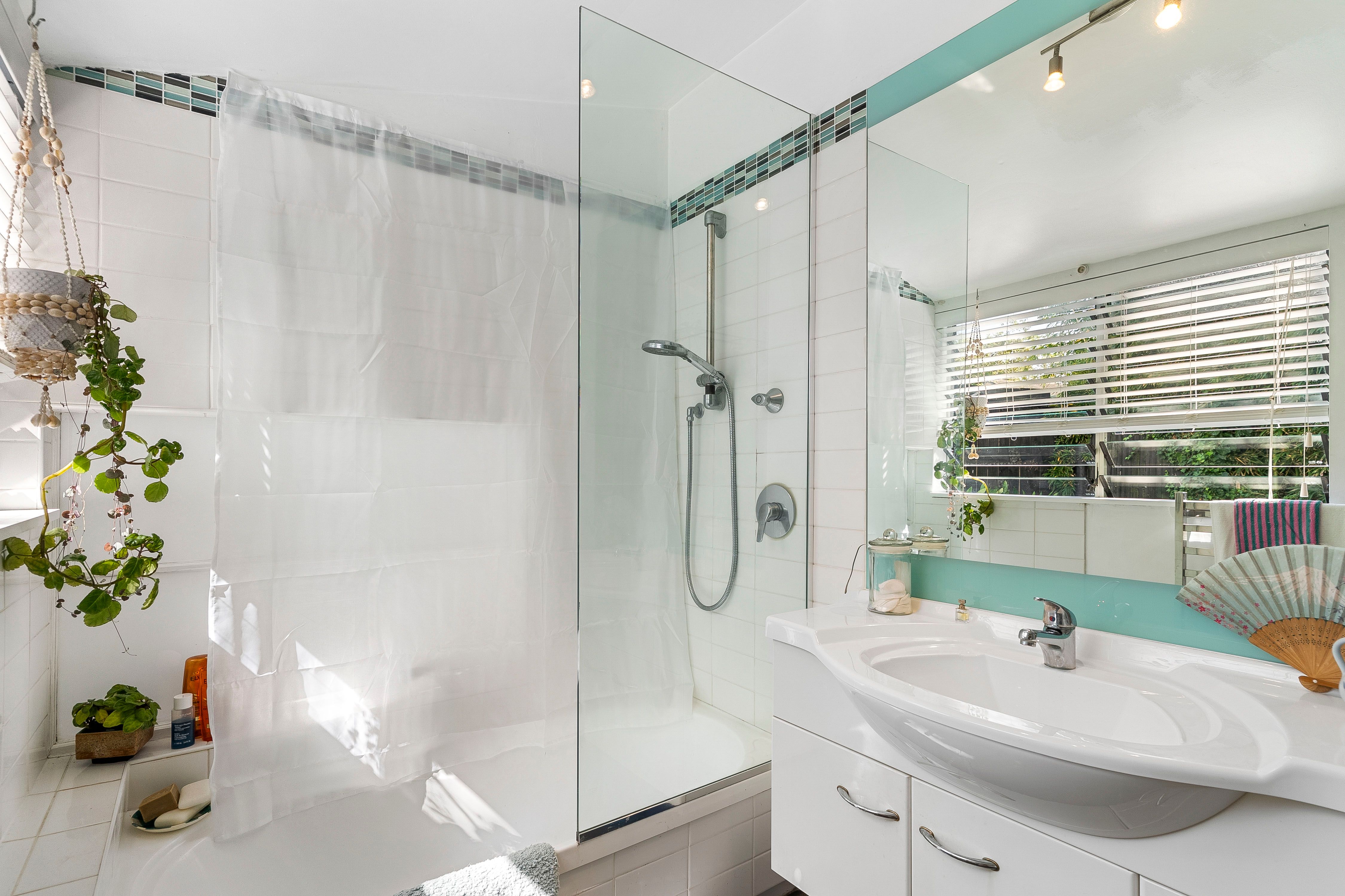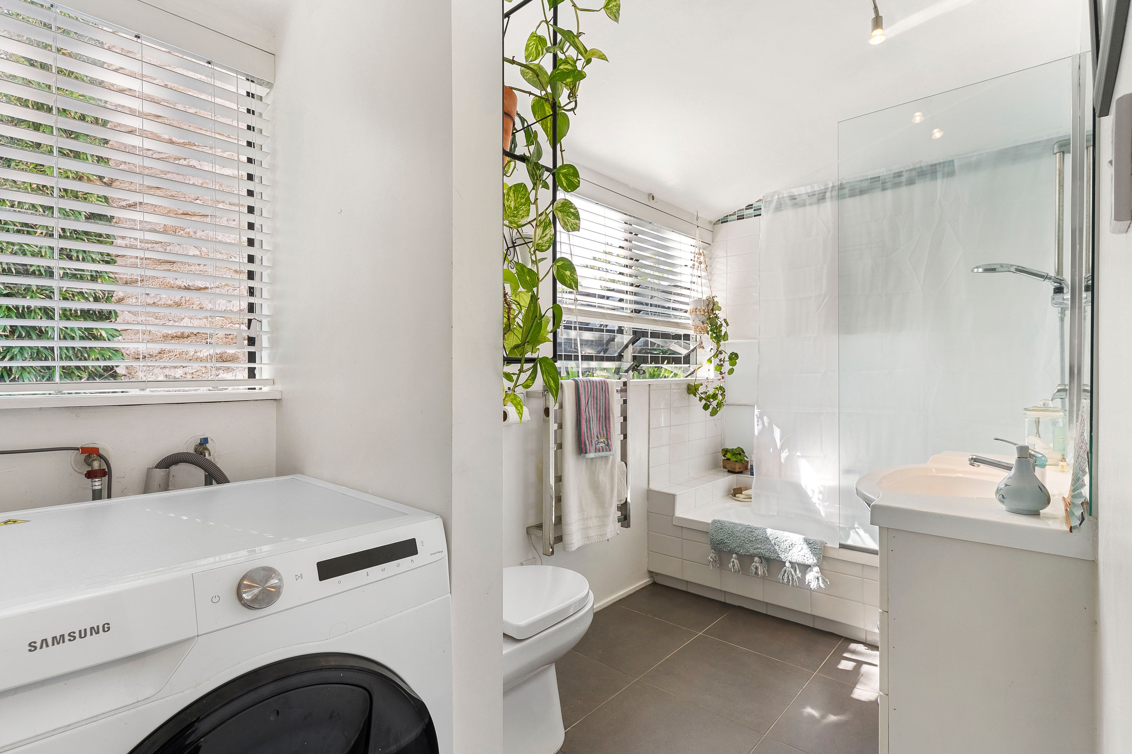 The family bathroom is generous in size, with shower-over-bath, a combined laundry, and stylish glass louvered windows.