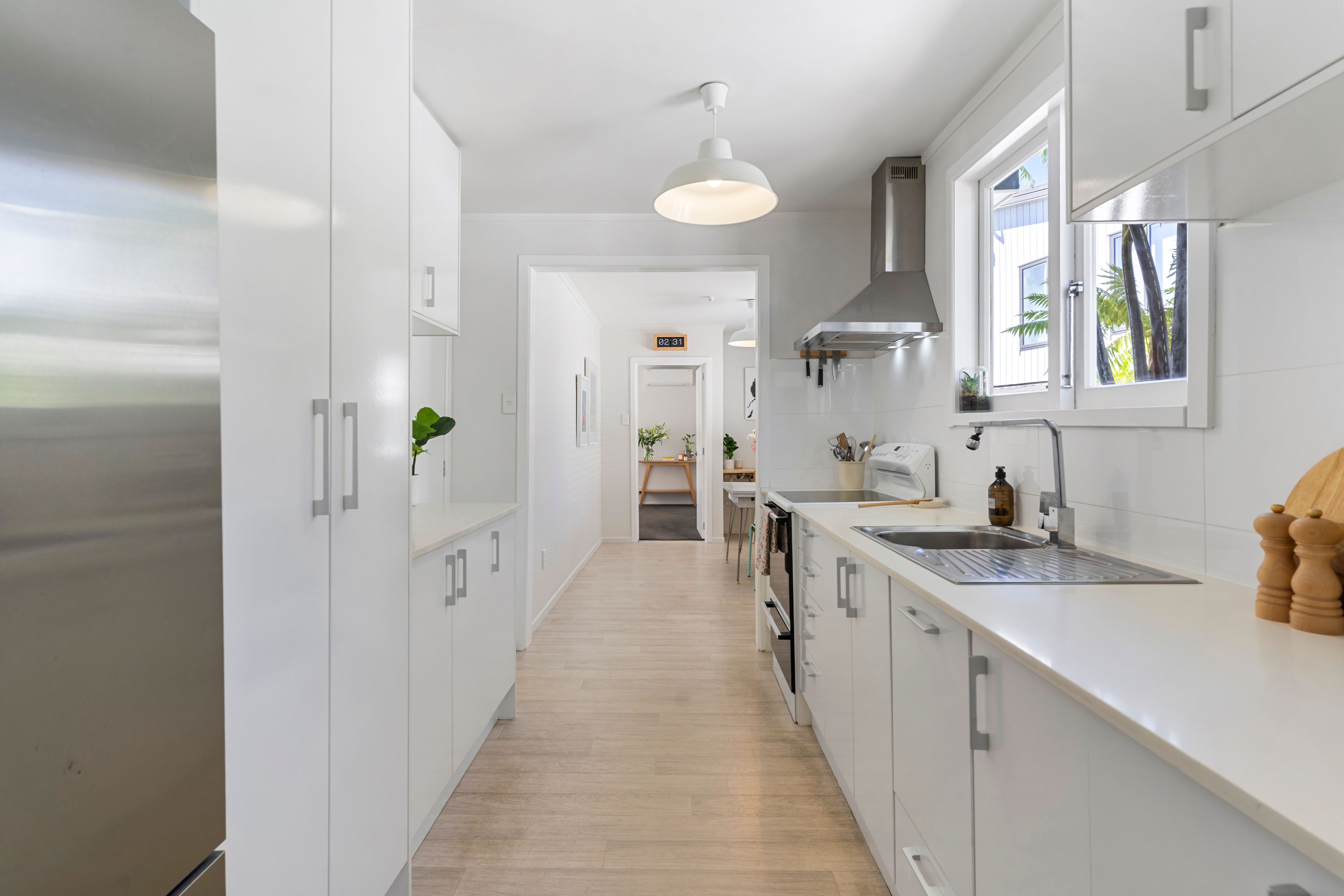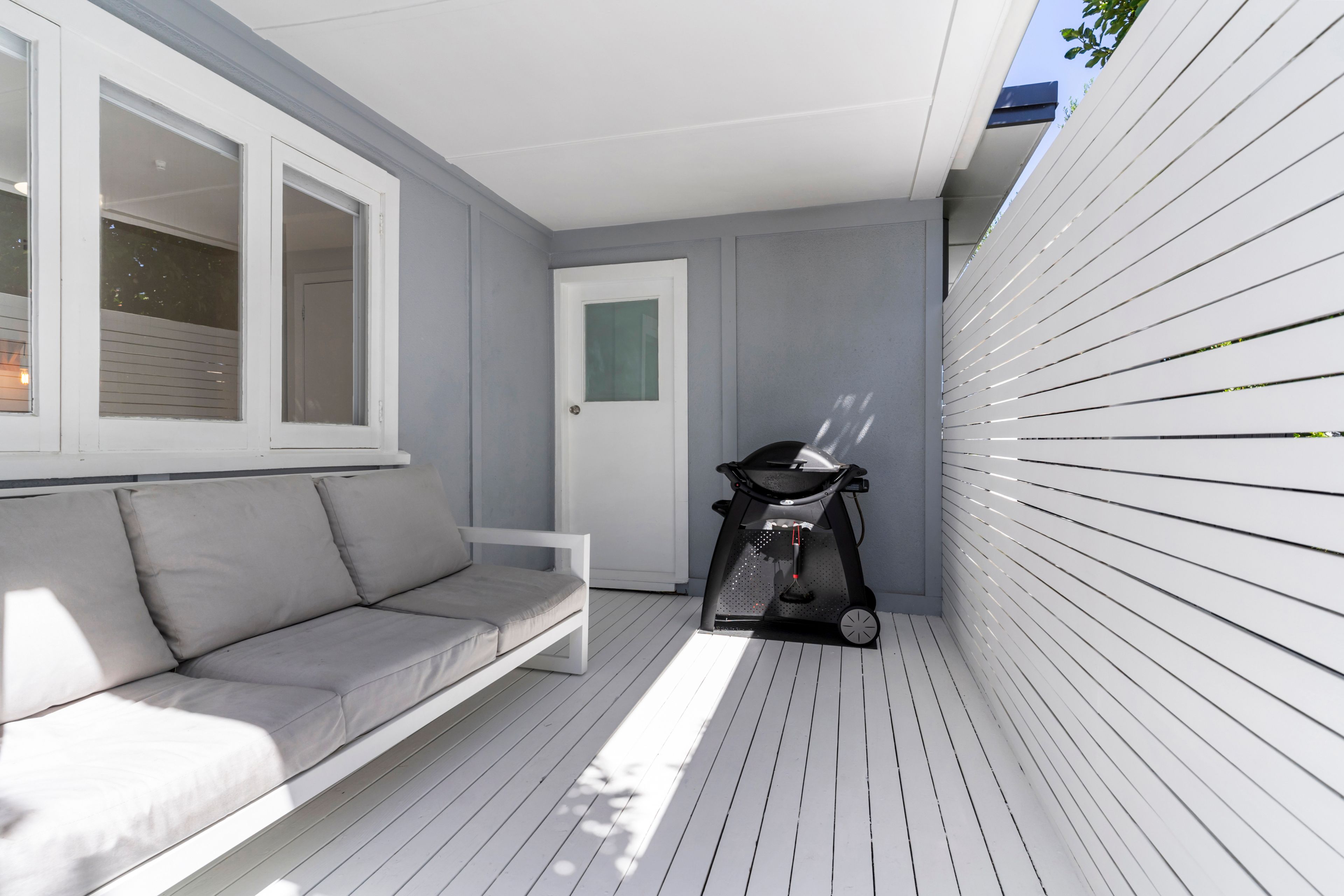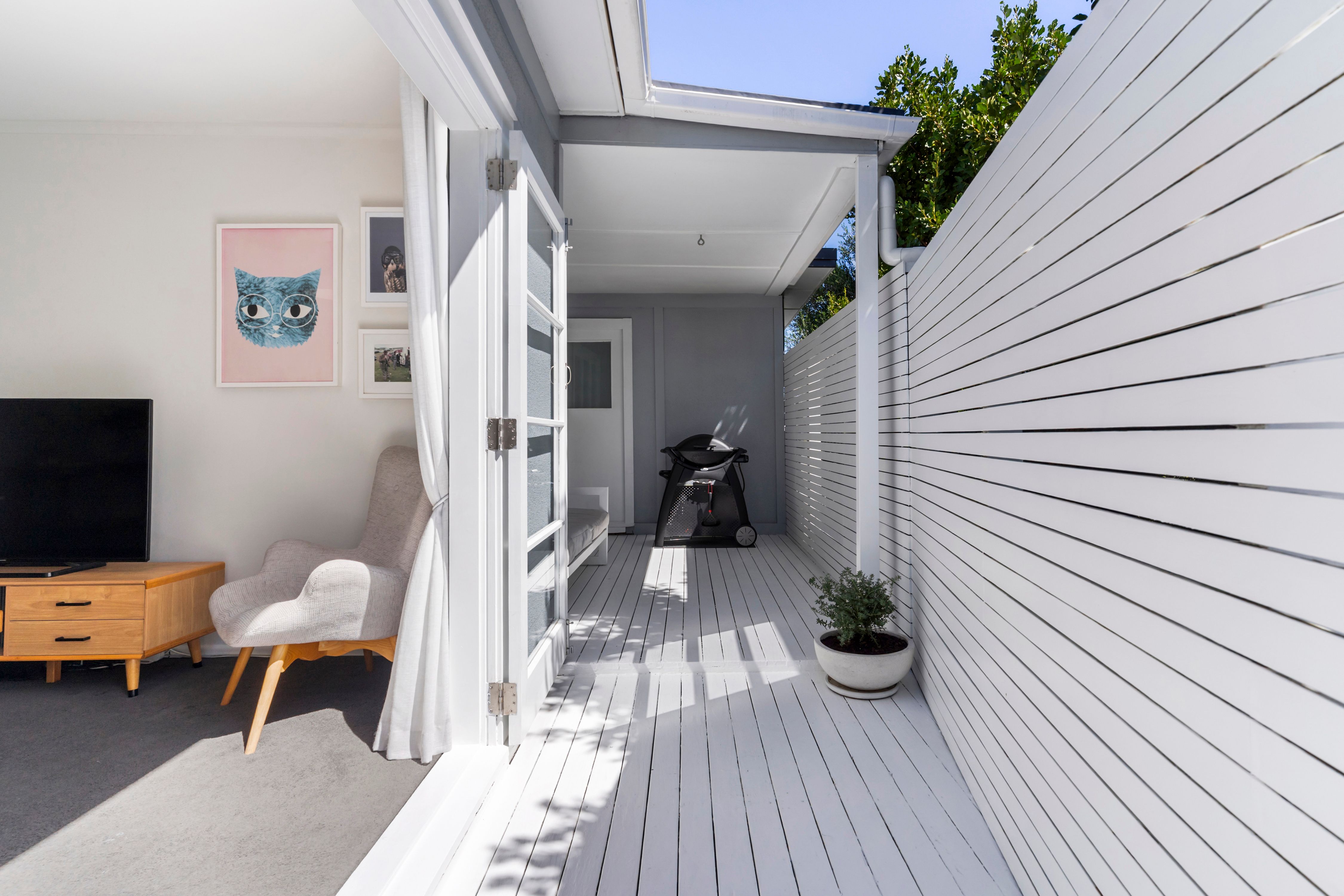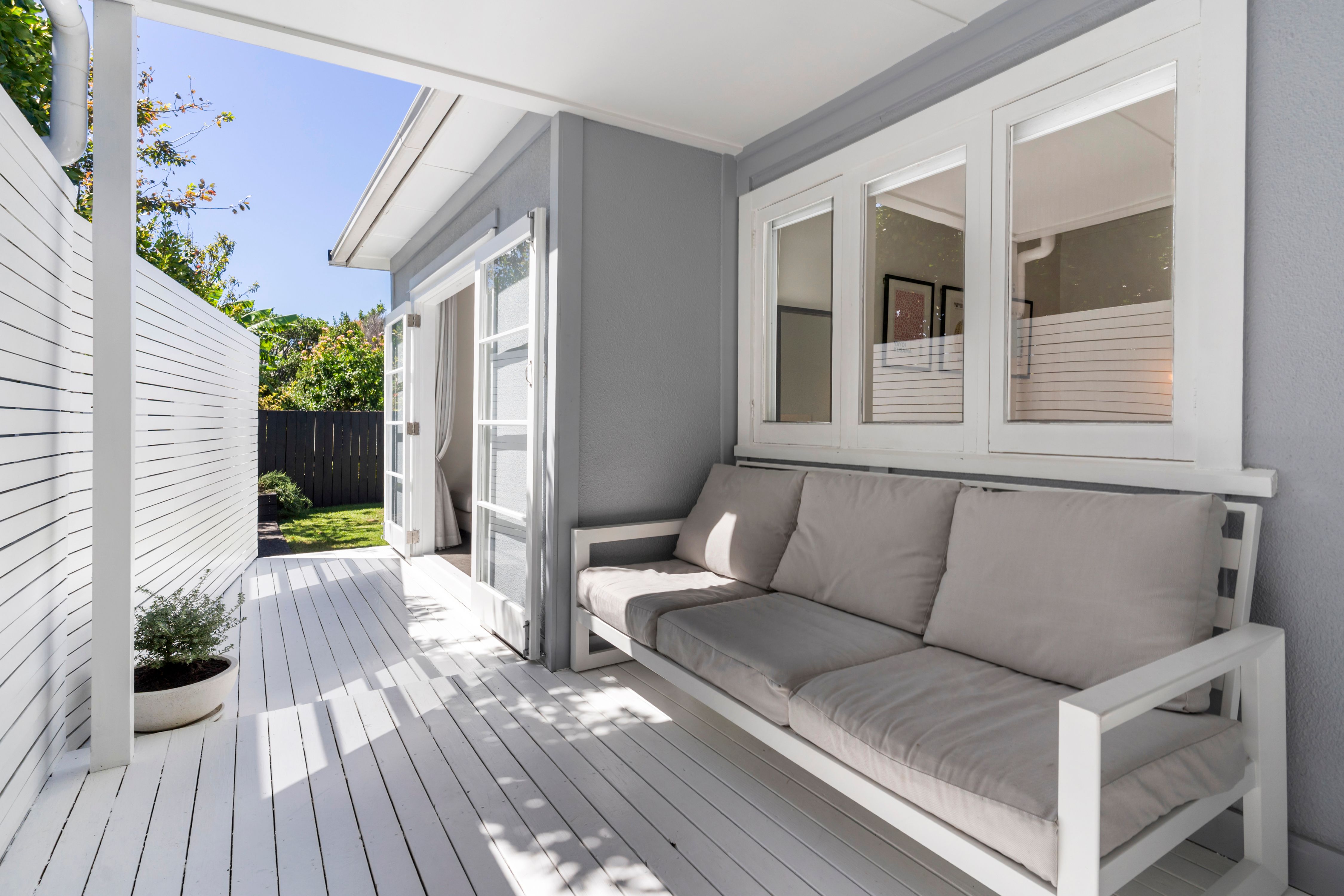 A contemporary entrance with striking double doors marks the threshold and provides entry into a light-filled interior with a modern neutral palette. The floor plan is both practical and inviting. The living room flows outward through classic French doors, providing a level transition to a covered west facing deck and the garden beyond. The kitchen is well sized and reaches to a light filled laundry in one direction and a sunny dining area in the other. The double bedrooms and the bathroom sit along a separate hallway, away from the entertaining areas.