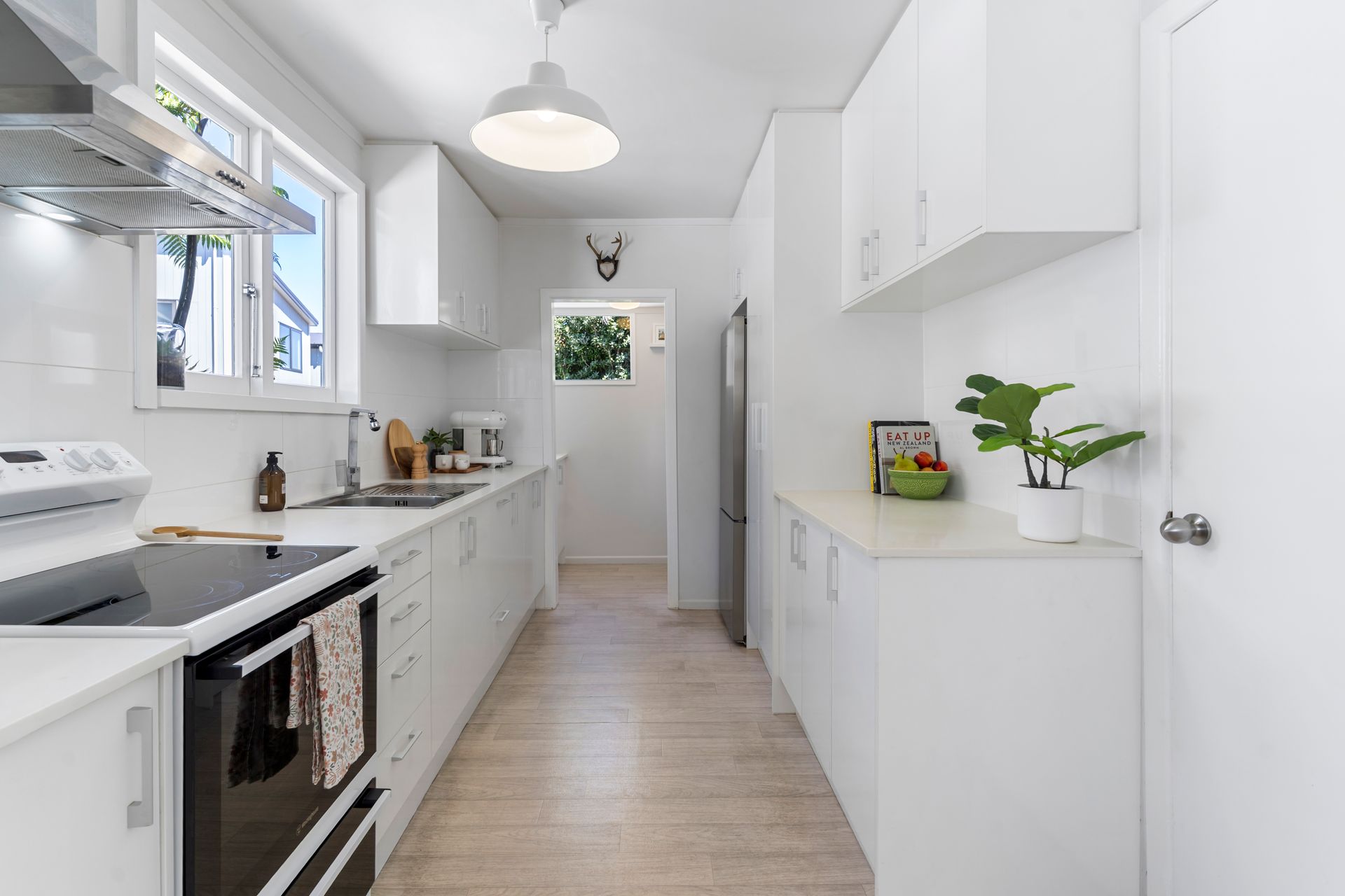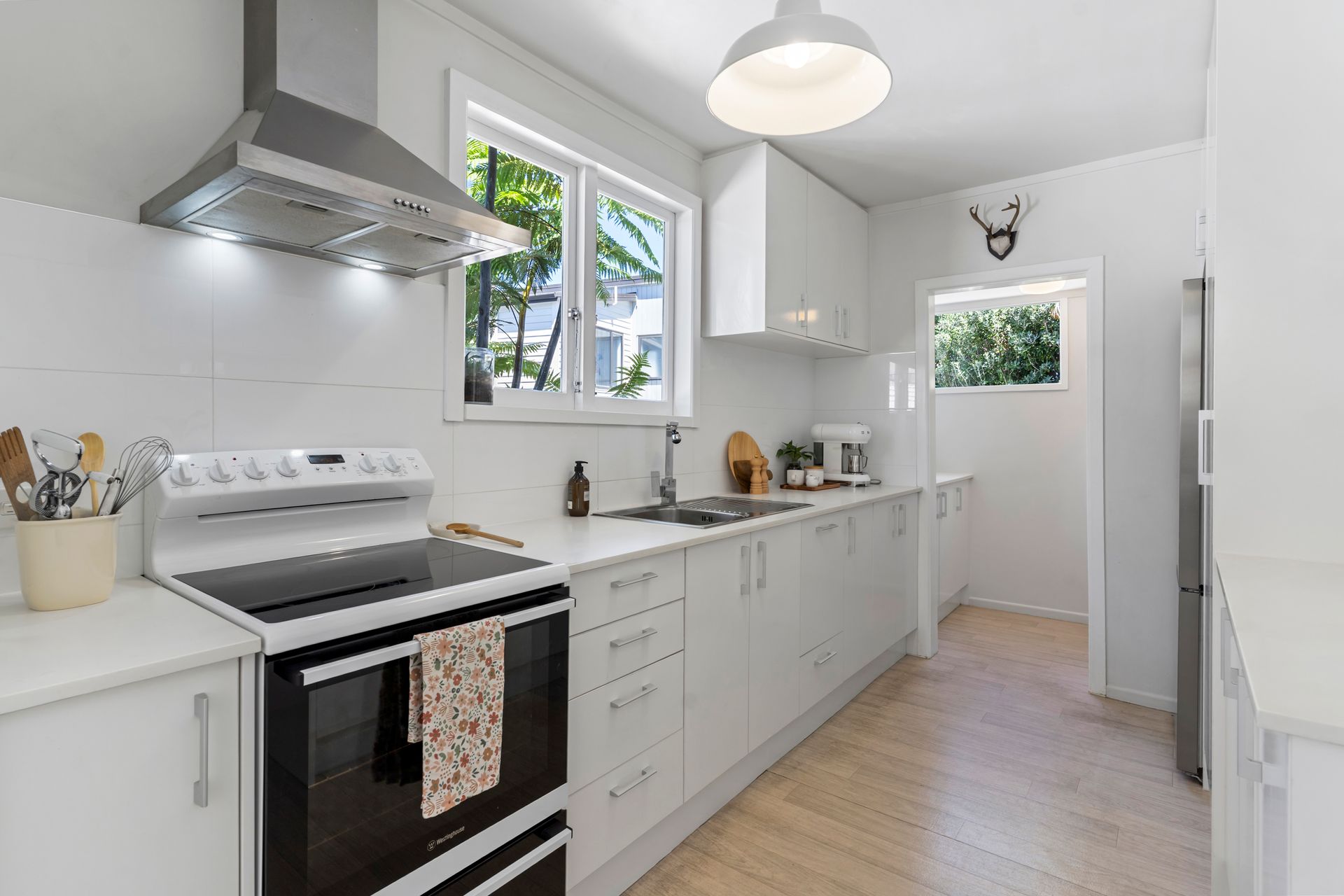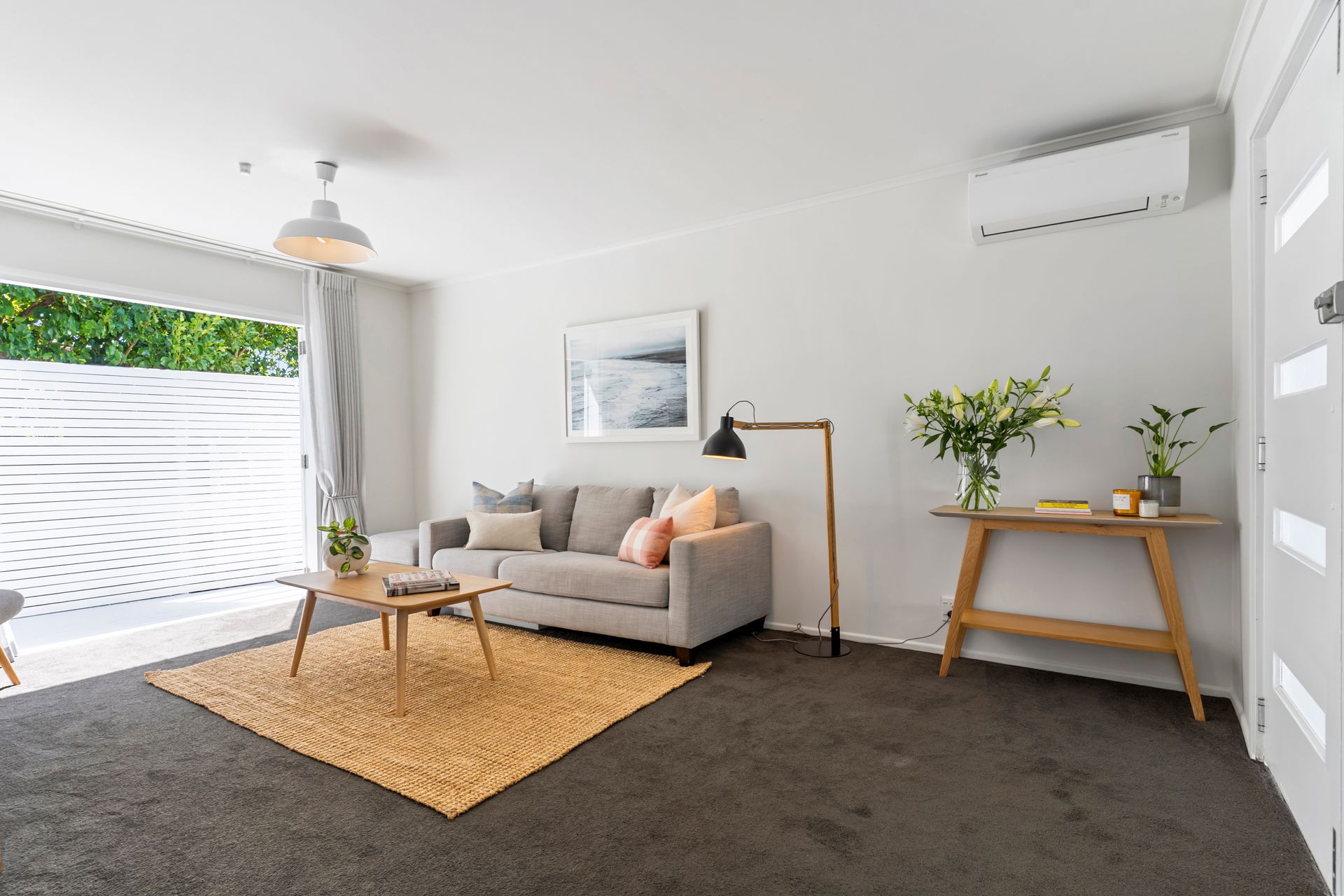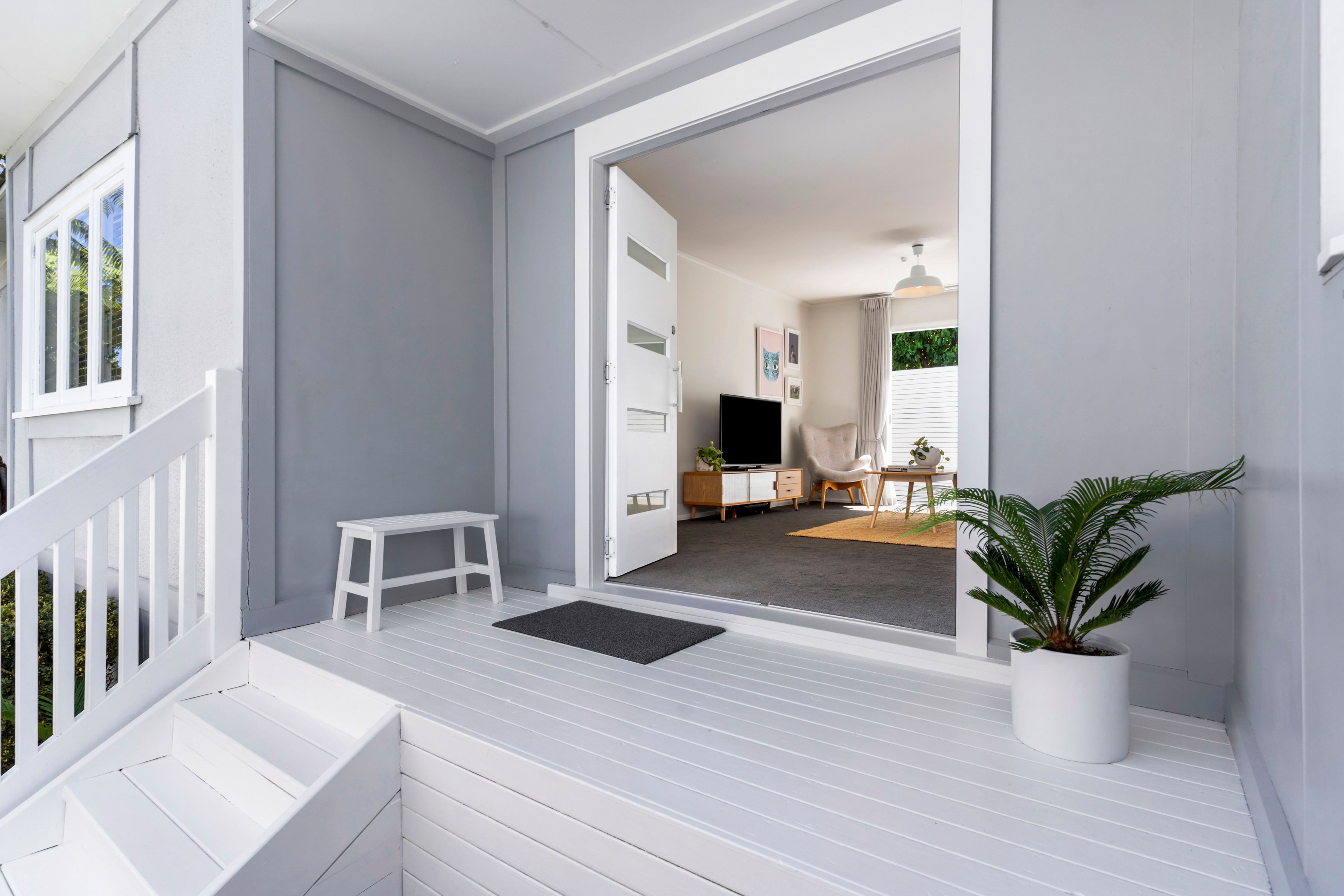 A contemporary entrance with striking double doors marks the threshold and provides entry into a light-filled interior with a modern neutral palette. The floor plan is both practical and inviting. The living room flows outward through classic French doors, providing a level transition to a covered west facing deck and the garden beyond. The kitchen is well sized and reaches to a light filled laundry in one direction and a sunny dining area in the other. The double bedrooms and the bathroom sit along a separate hallway, away from the entertaining areas.