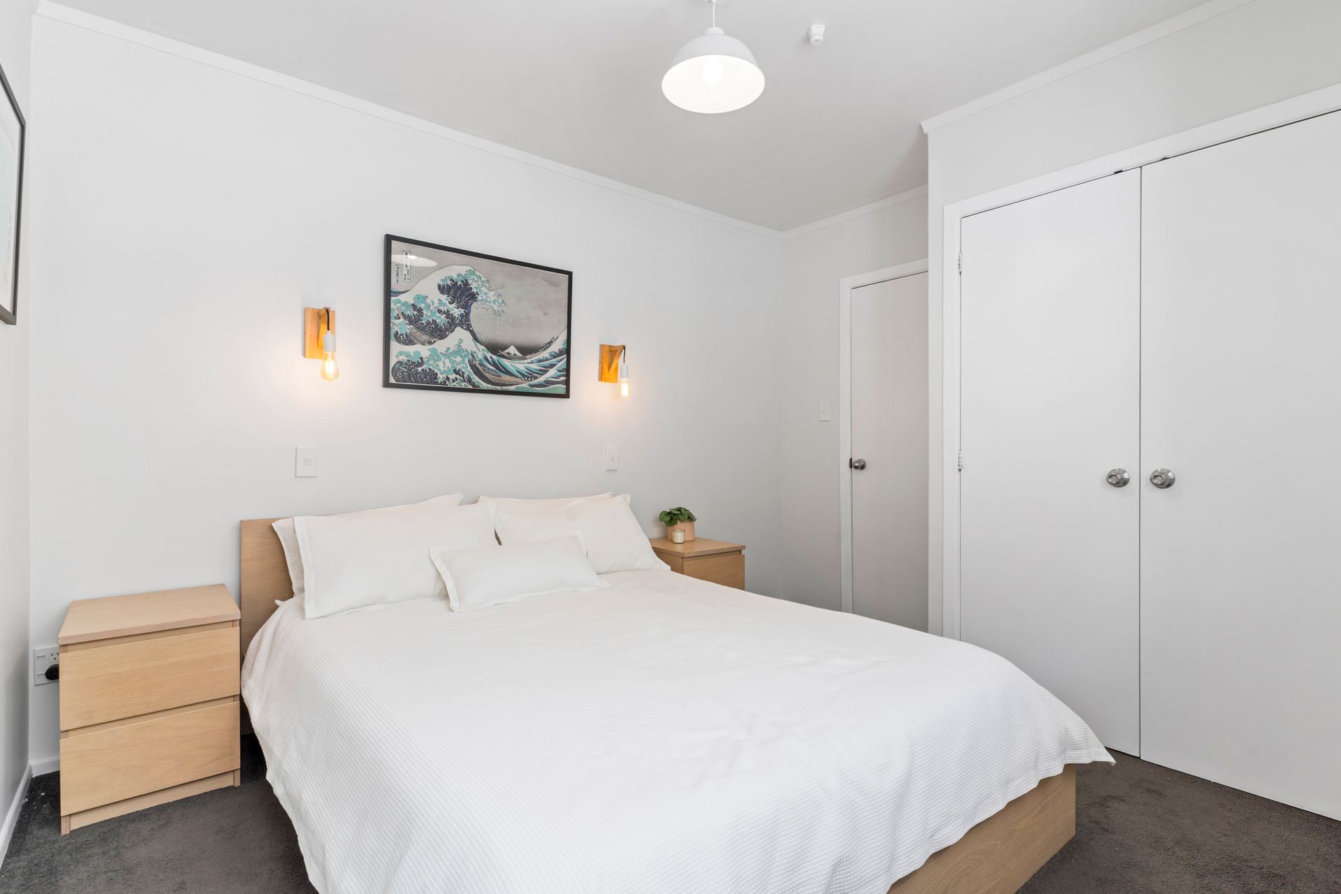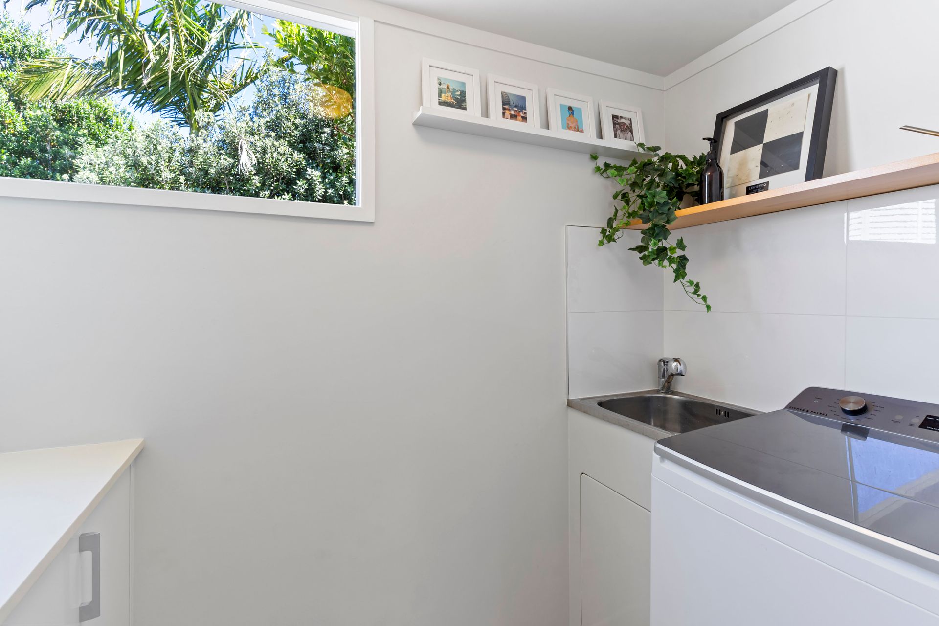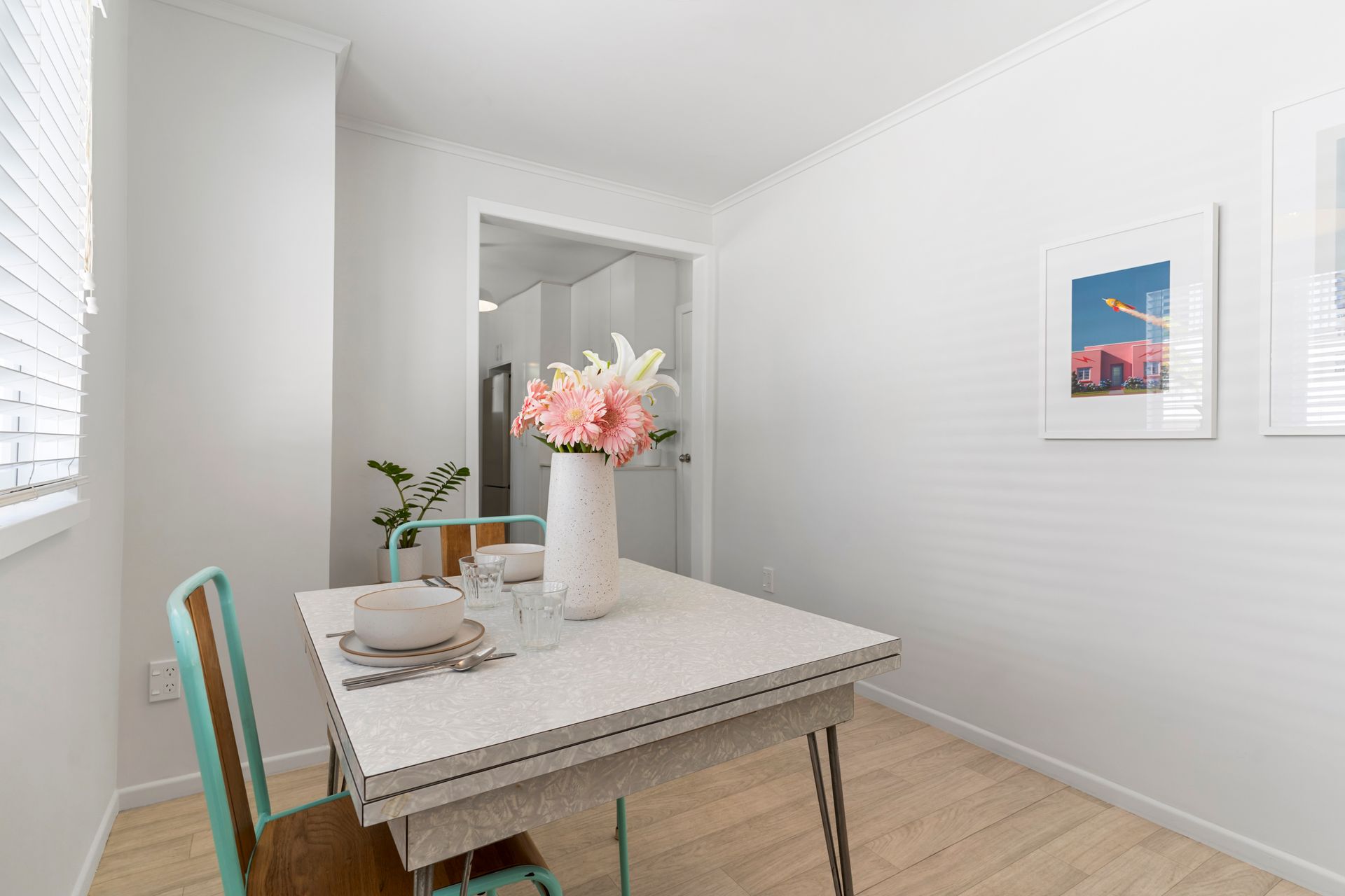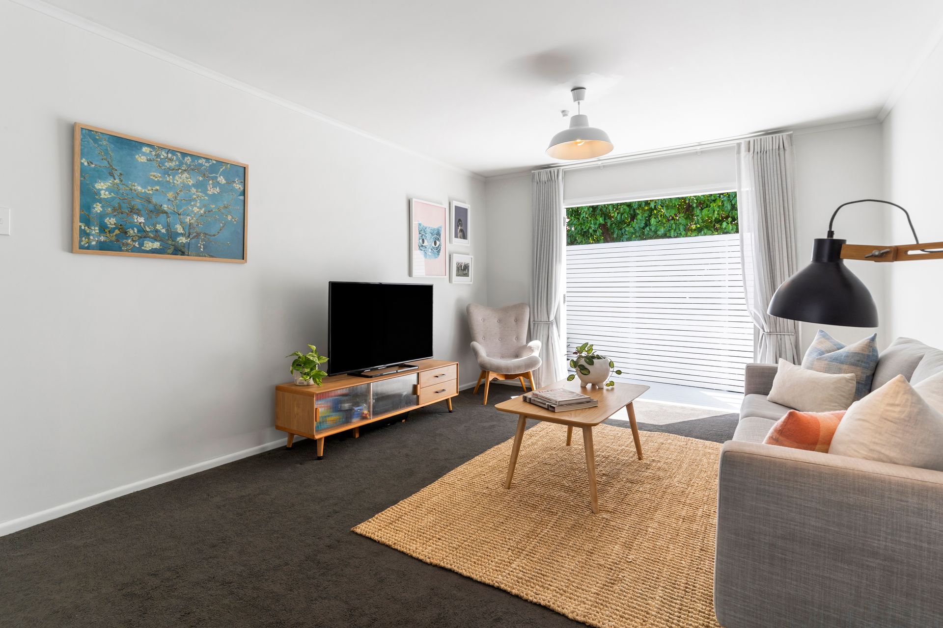 A contemporary entrance with striking double doors marks the threshold and provides entry into a light-filled interior with a modern neutral palette. The floor plan is both practical and inviting. The living room flows outward through classic French doors, providing a level transition to a covered west facing deck and the garden beyond. The kitchen is well sized and reaches to a light filled laundry in one direction and a sunny dining area in the other. The double bedrooms and the bathroom sit along a separate hallway, away from the entertaining areas.