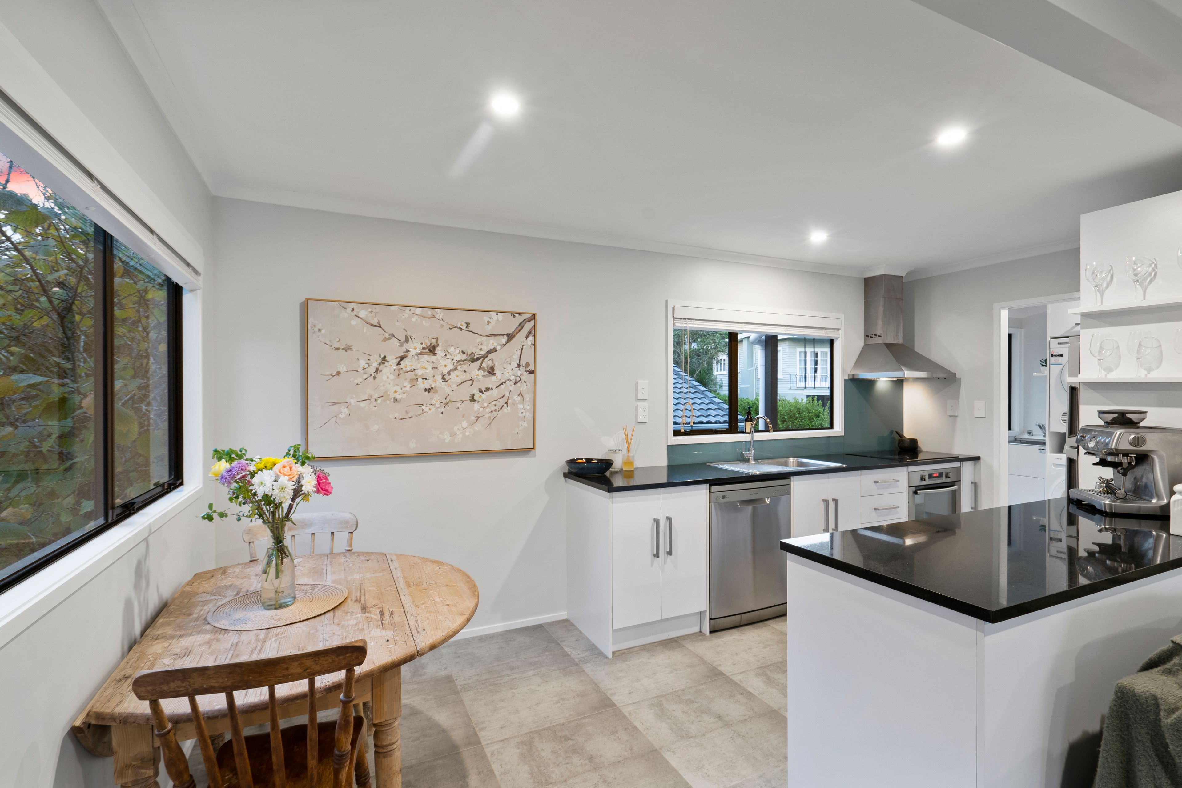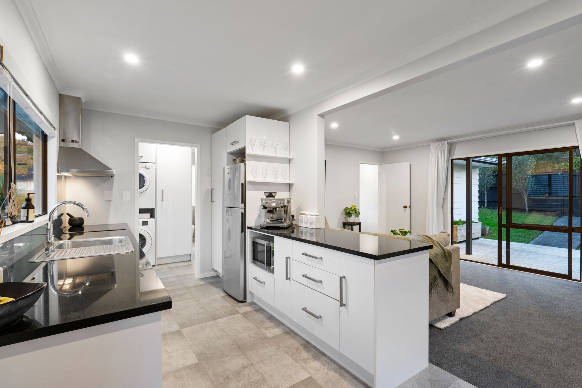 The spacious contemporary kitchen flows seamlessly to a dining area and then around to the cosy lounge - which effortlessly pours out onto the sizeable front deck. Then at the rear of the house, you find a more private setting with another generously proportioned (north-east facing) patio - which possesses clean lines and landscaped design - both spaces perfect for alfresco dining.