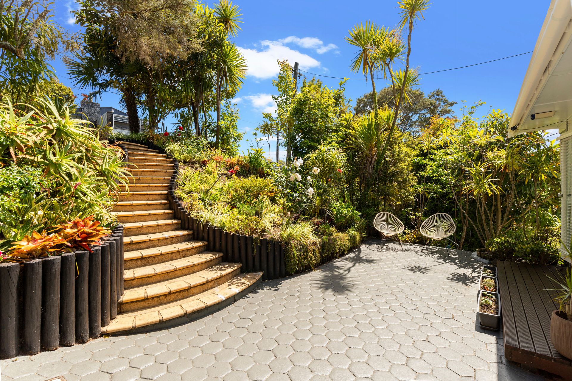 The inviting north-facing, frontage features cascading steps leading down through a well-maintained front garden. Enjoy your morning coffee in the sun, soaking in the