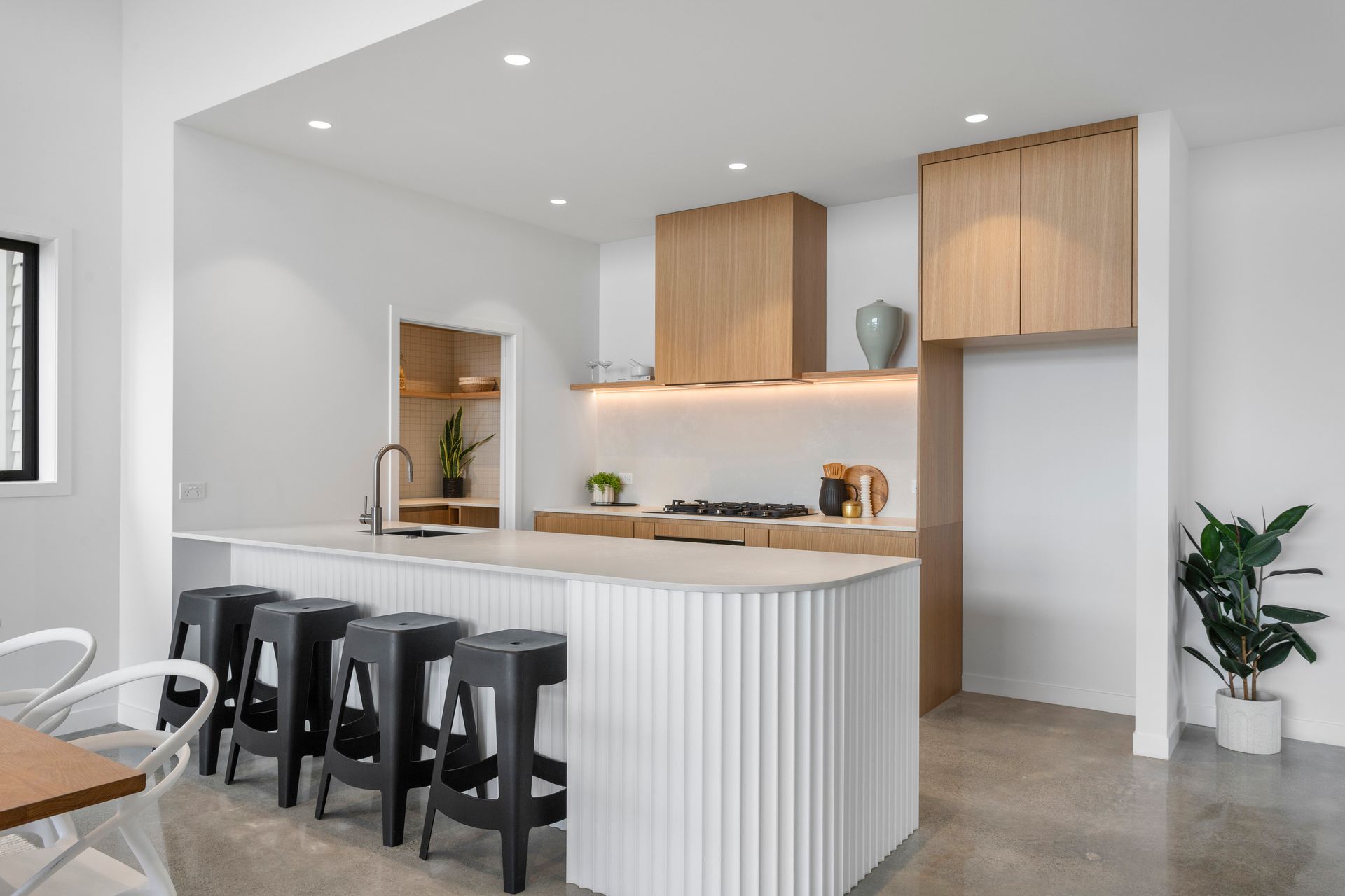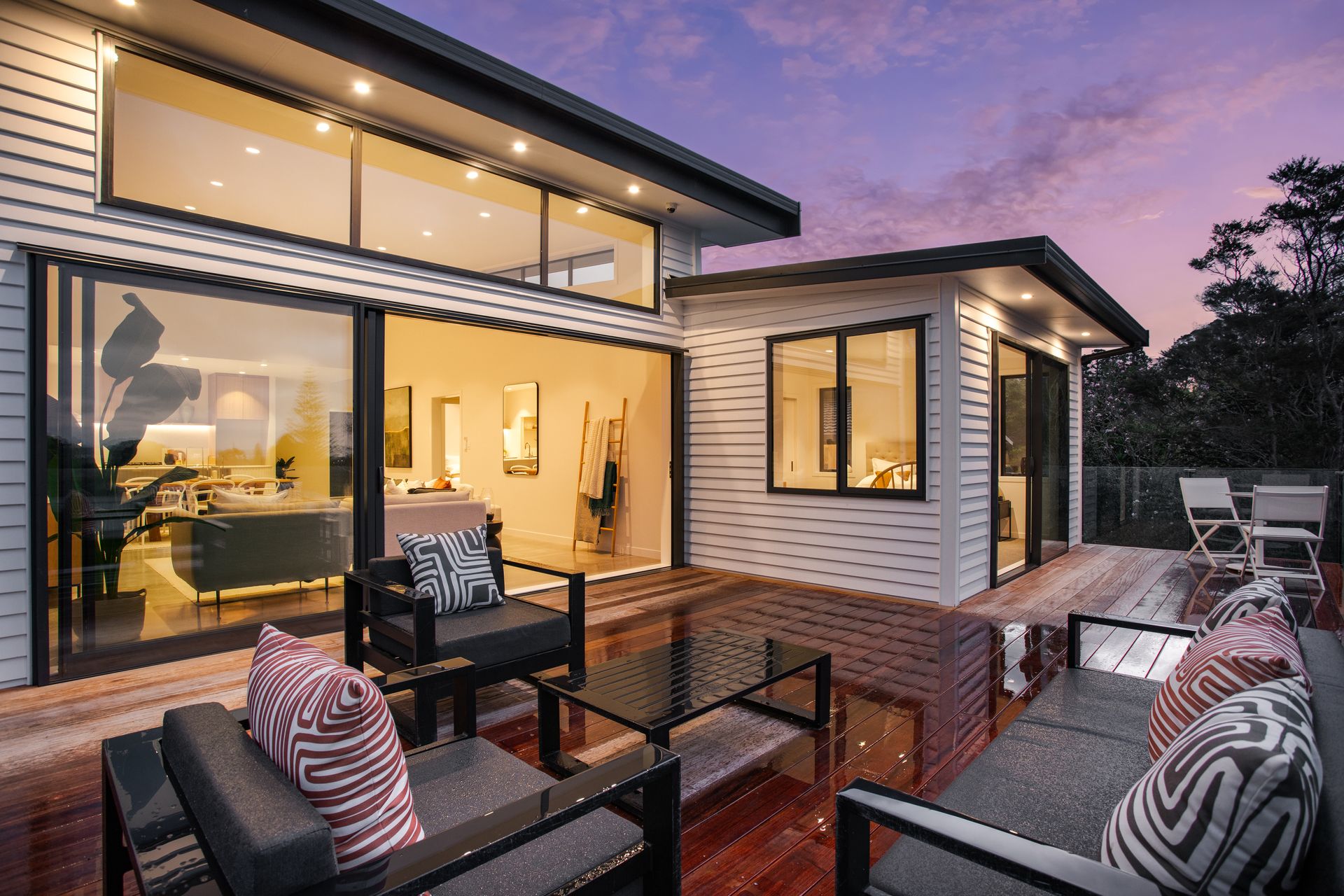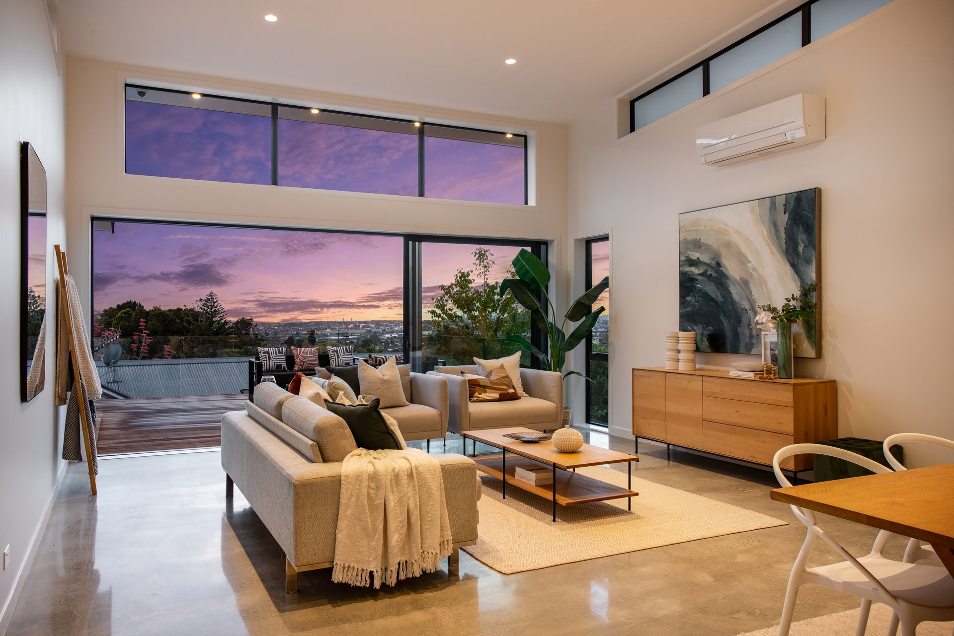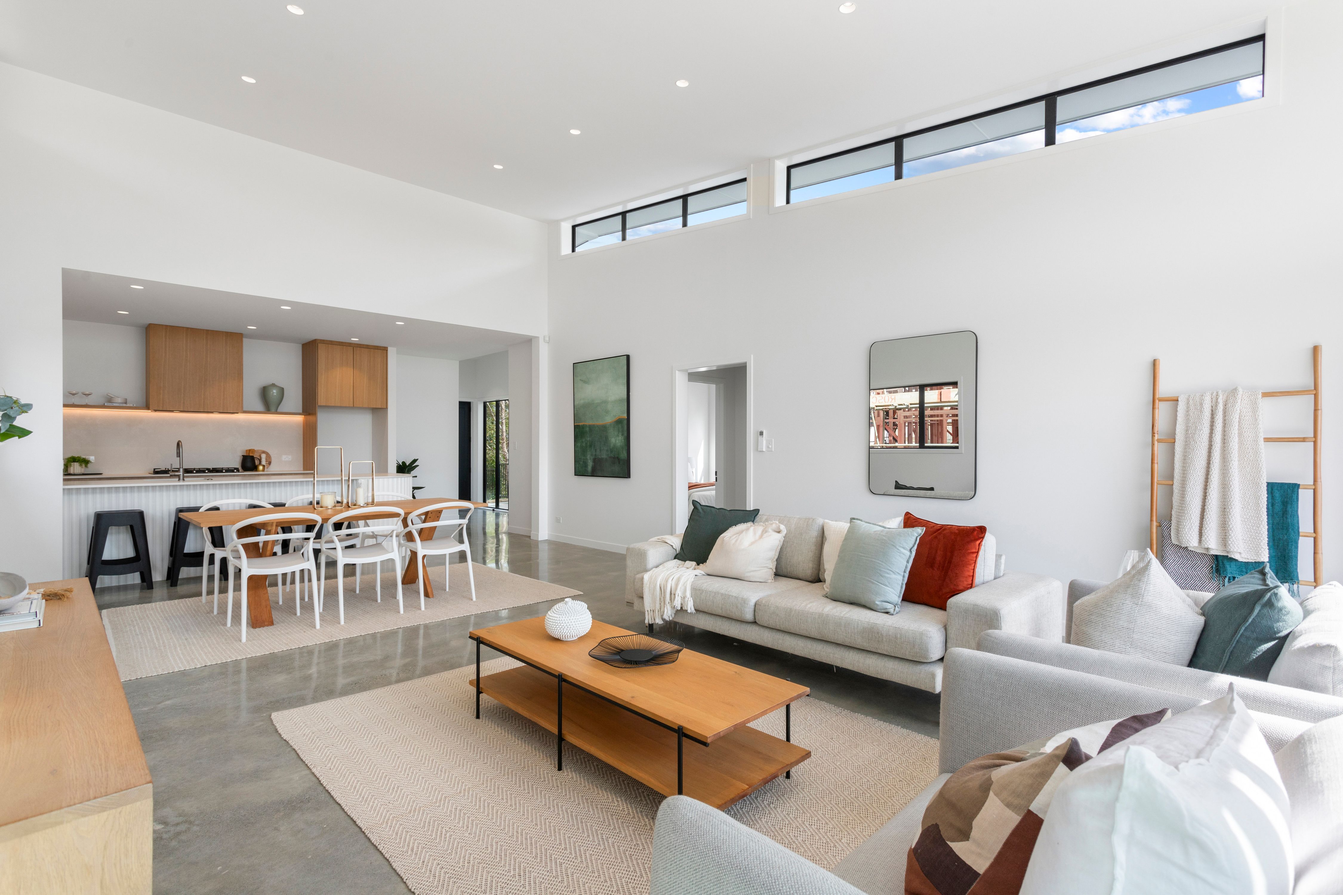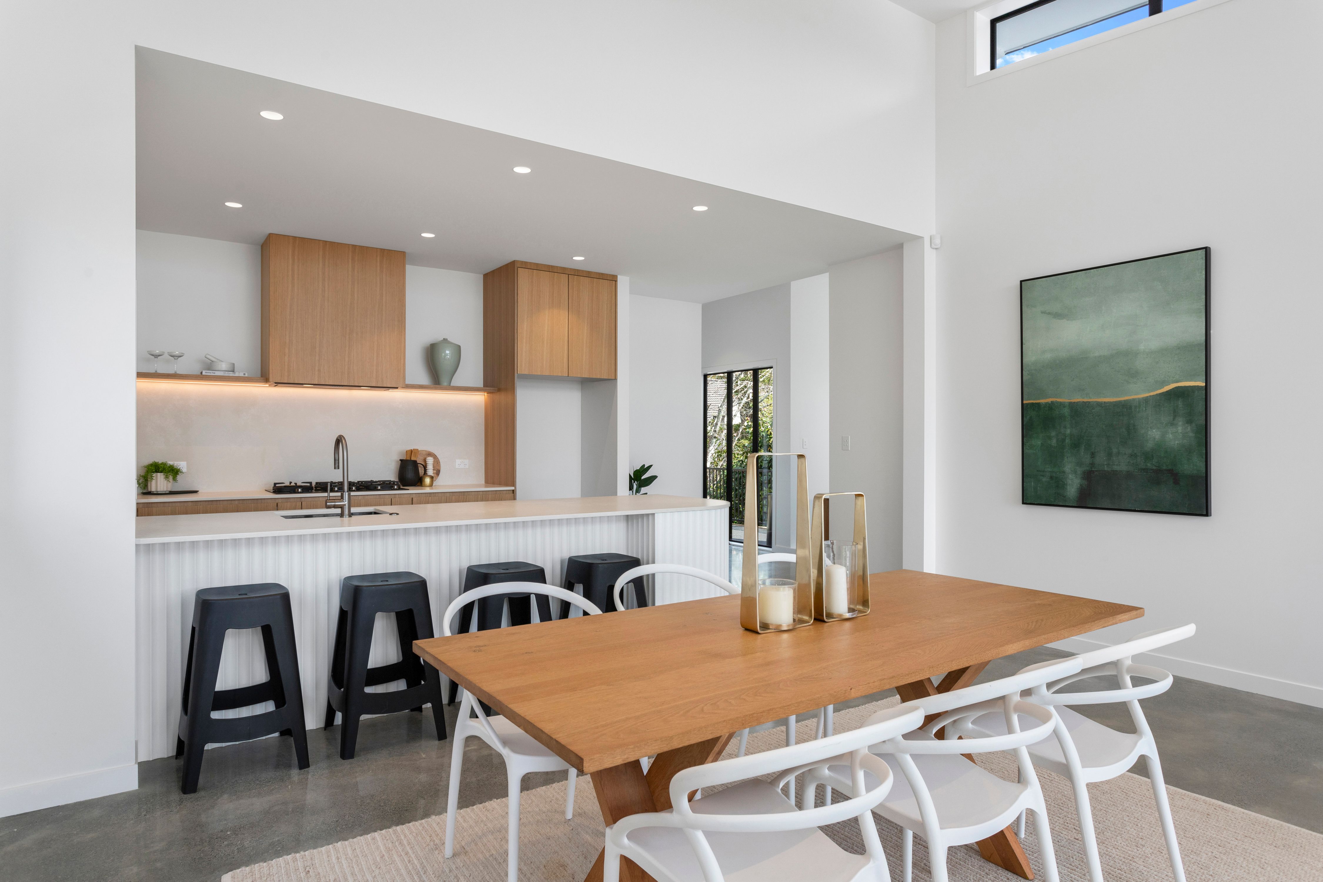 Downstairs offers a self-contained space with a chic open-plan living area, a sleek kitchenette, polished concrete floors, stunning bathroom, and two more double bedrooms, one with its own walk-in wardrobe. Enjoy effortless indoor-outdoor flow to a private deck, perfect for entertaining.