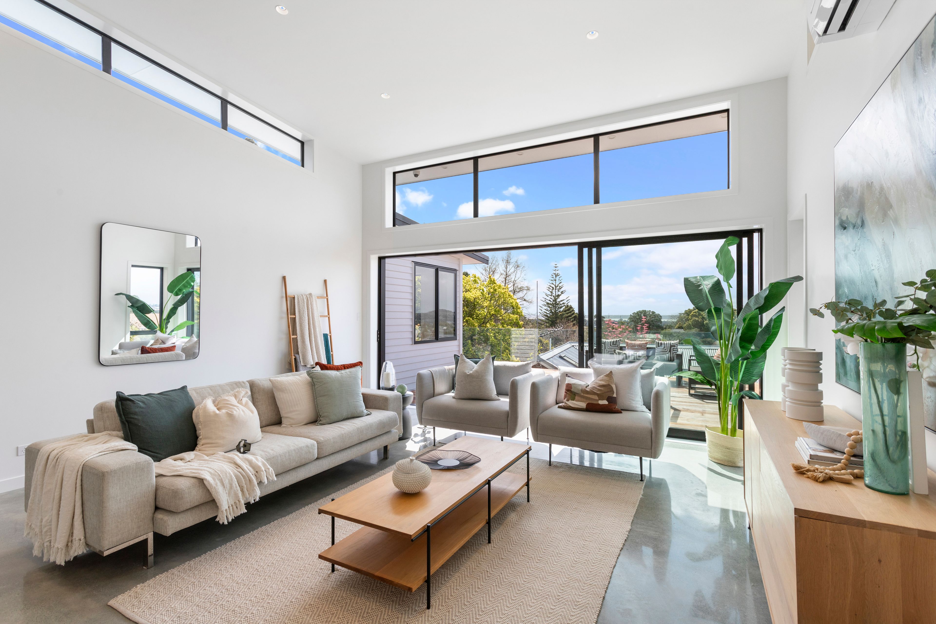 As you step into the grand foyer, you'll be captivated by sweeping, elevated views stretching across Auckland and out to the city skyline. The expansive open-plan living area is accentuated by soaring high-pitched ceilings, adding a touch of luxury and spaciousness. This space seamlessly flows to a sunny north-facing deck - an idyllic spot to unwind with a glass of wine and take in the breathtaking views. The stylish, trend-setting kitchen, complete with a butler's pantry, is perfect for those who love to entertain.