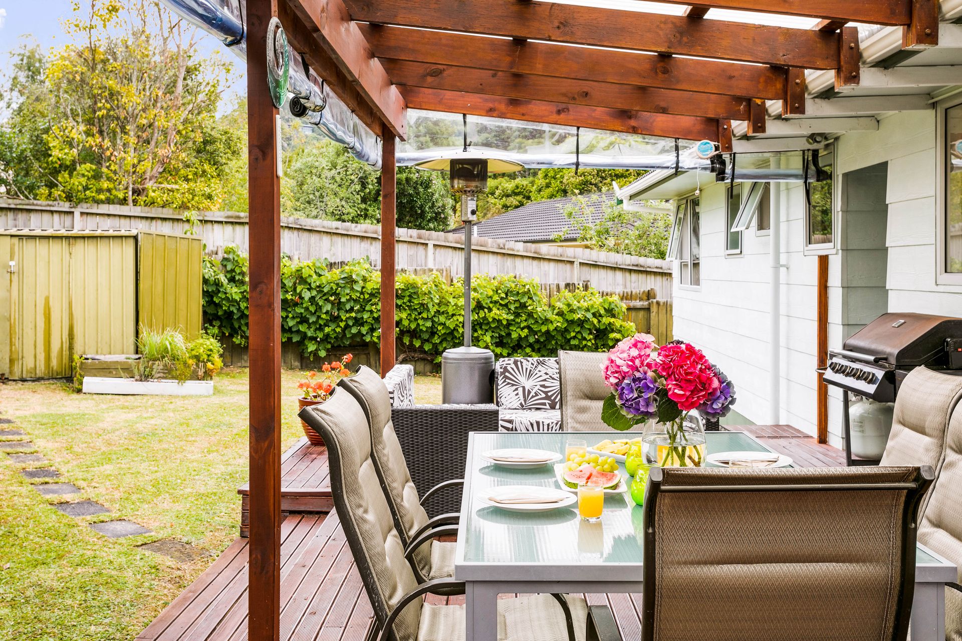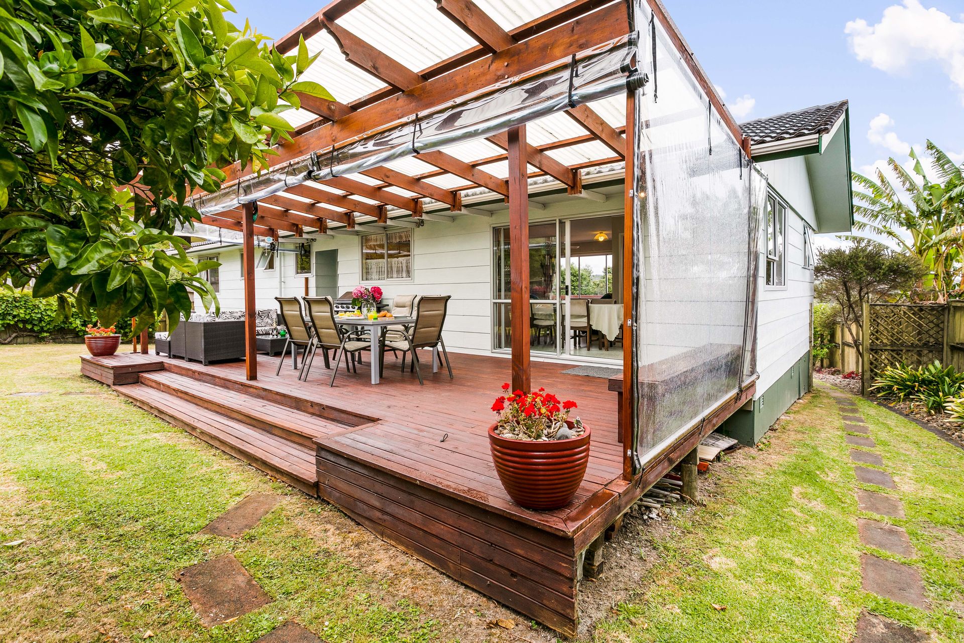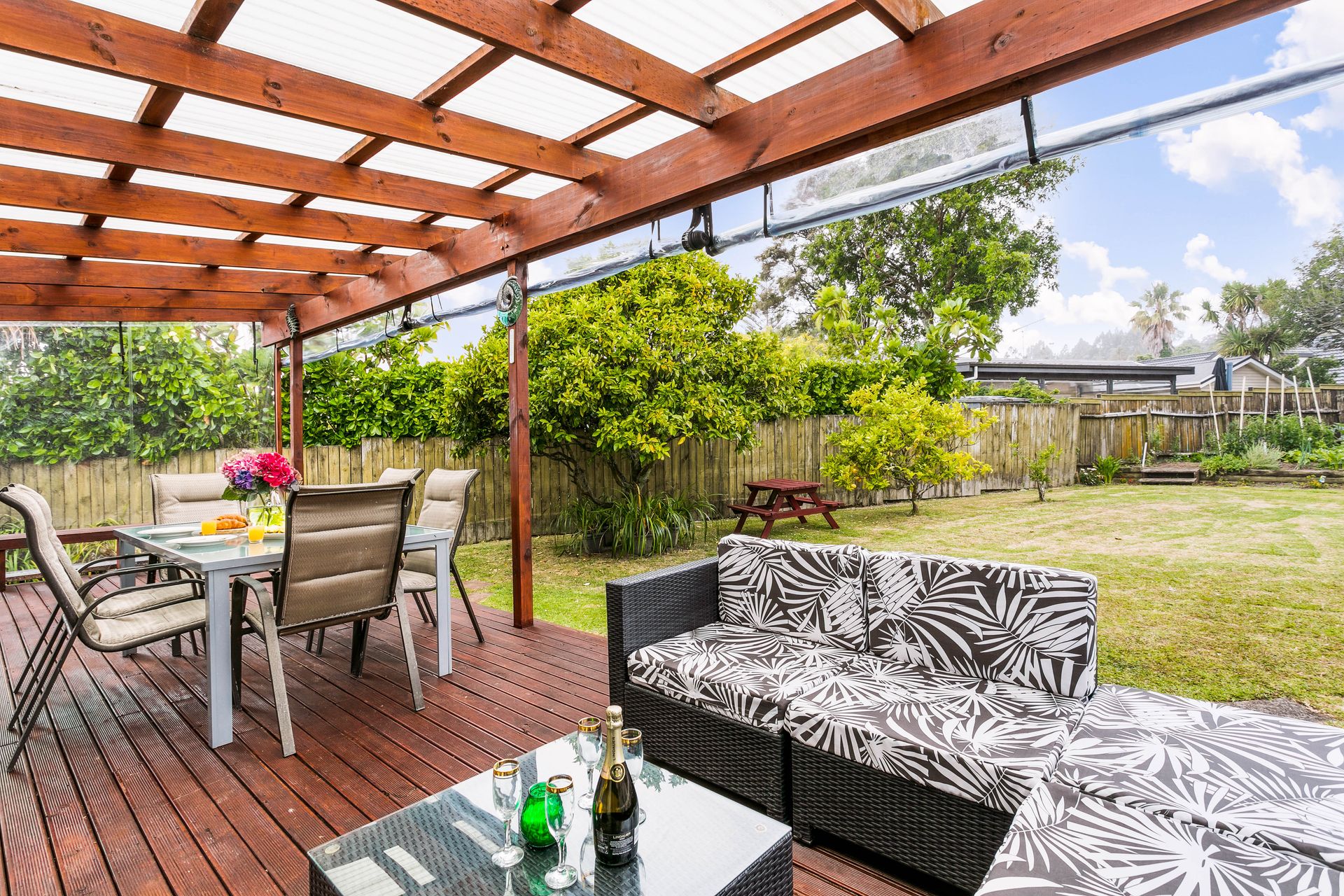 Seamless indoor outdoor flow to an ample size deck that is level with the grass giving a perfect flow to entertain on. There's even cafe drop down blinds to extend your outside living over the cooler months.