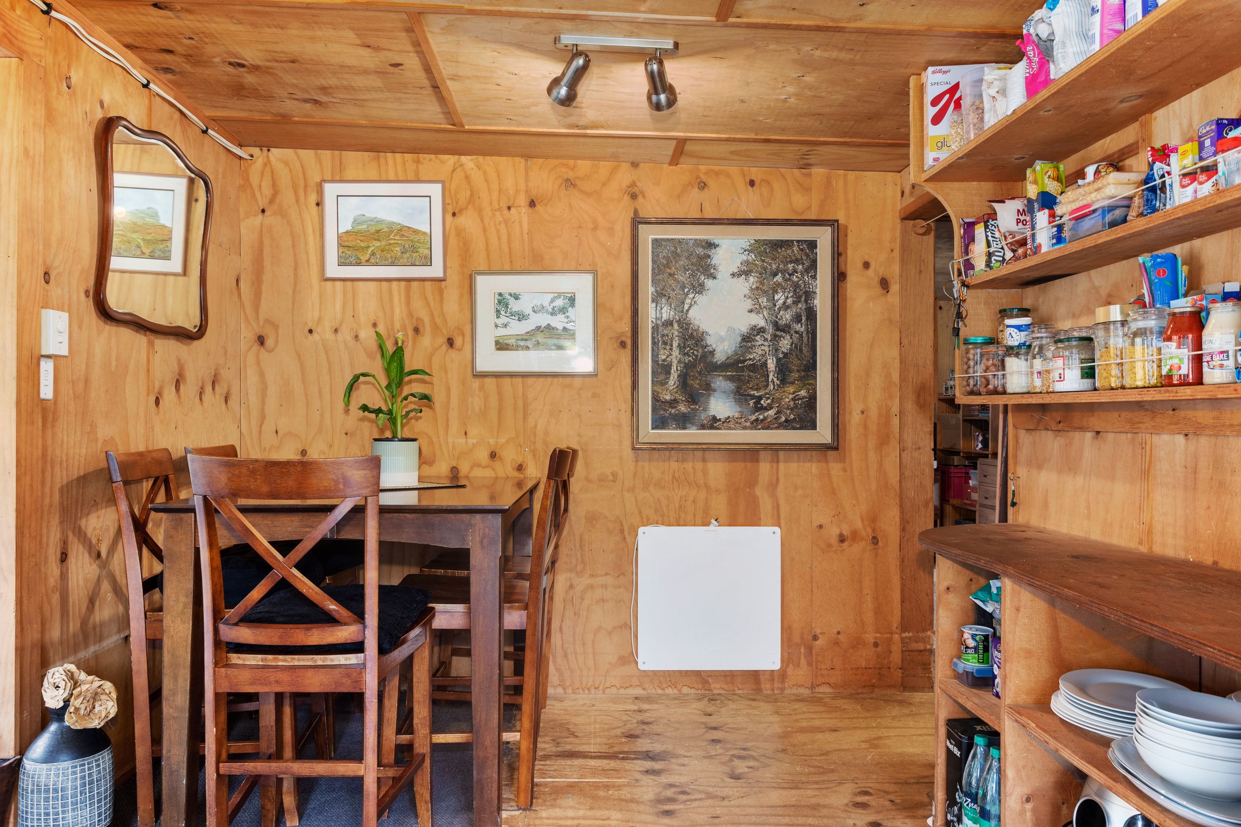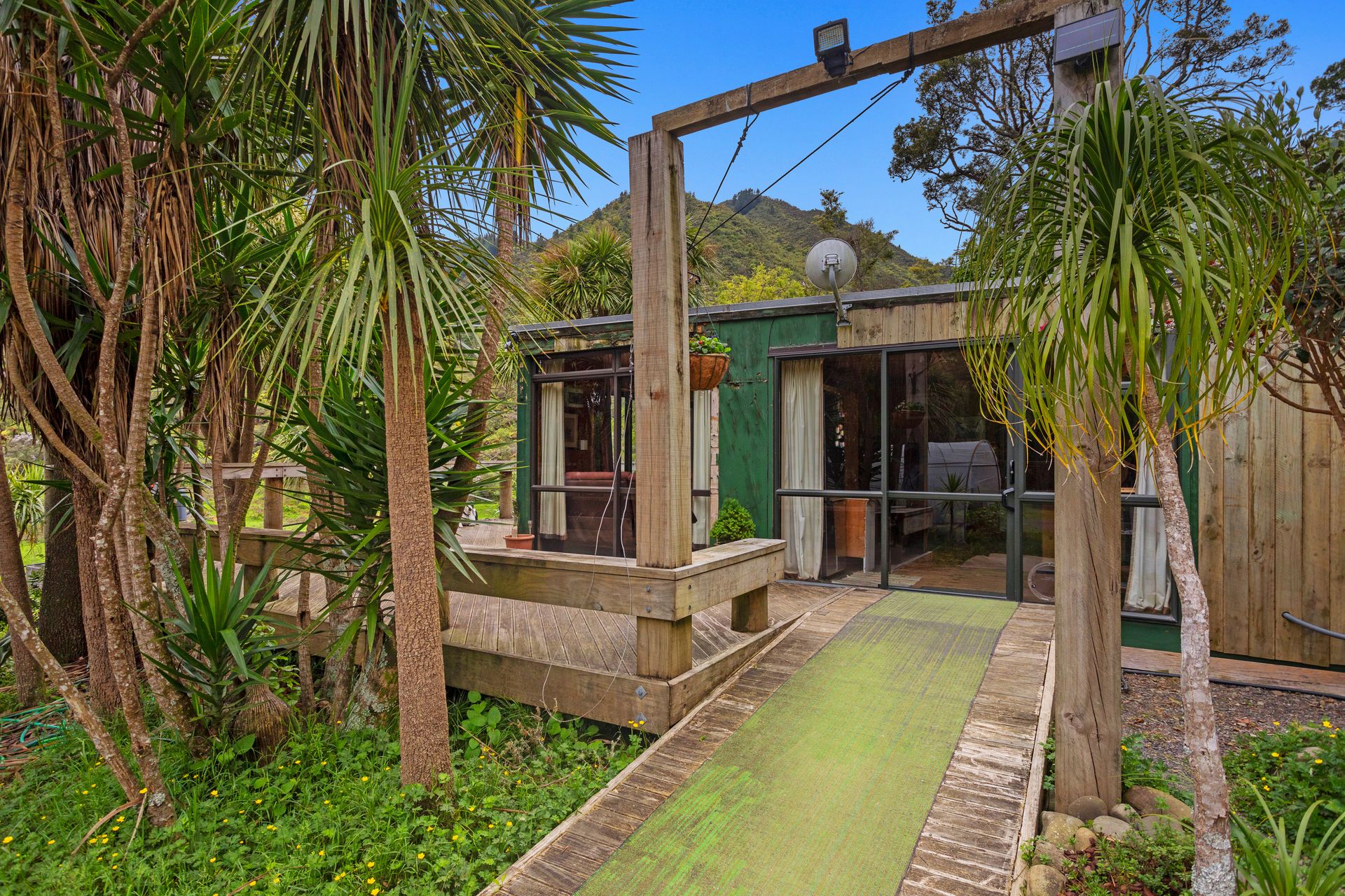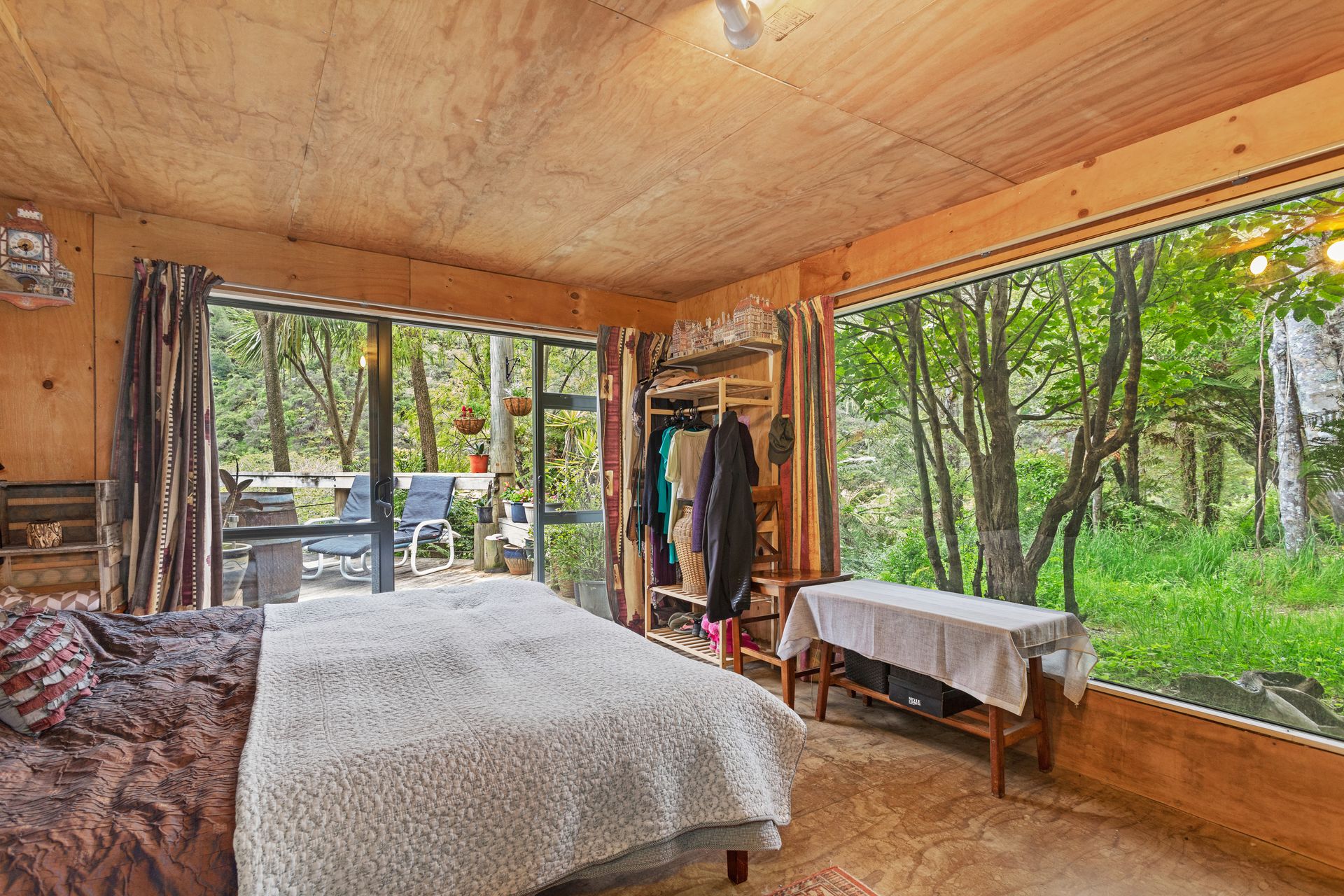 This cute two bedroom quirky cabin offers unique charm with it's open-plan living and expansive views of the Pakihi Valley. The large deck that wraps the north and west side is sunny, private and quiet. The natural spring fills the tank providing fresh spring water. As an added bonus Wifi is available via a neighbouring tower. A separate shipping container will