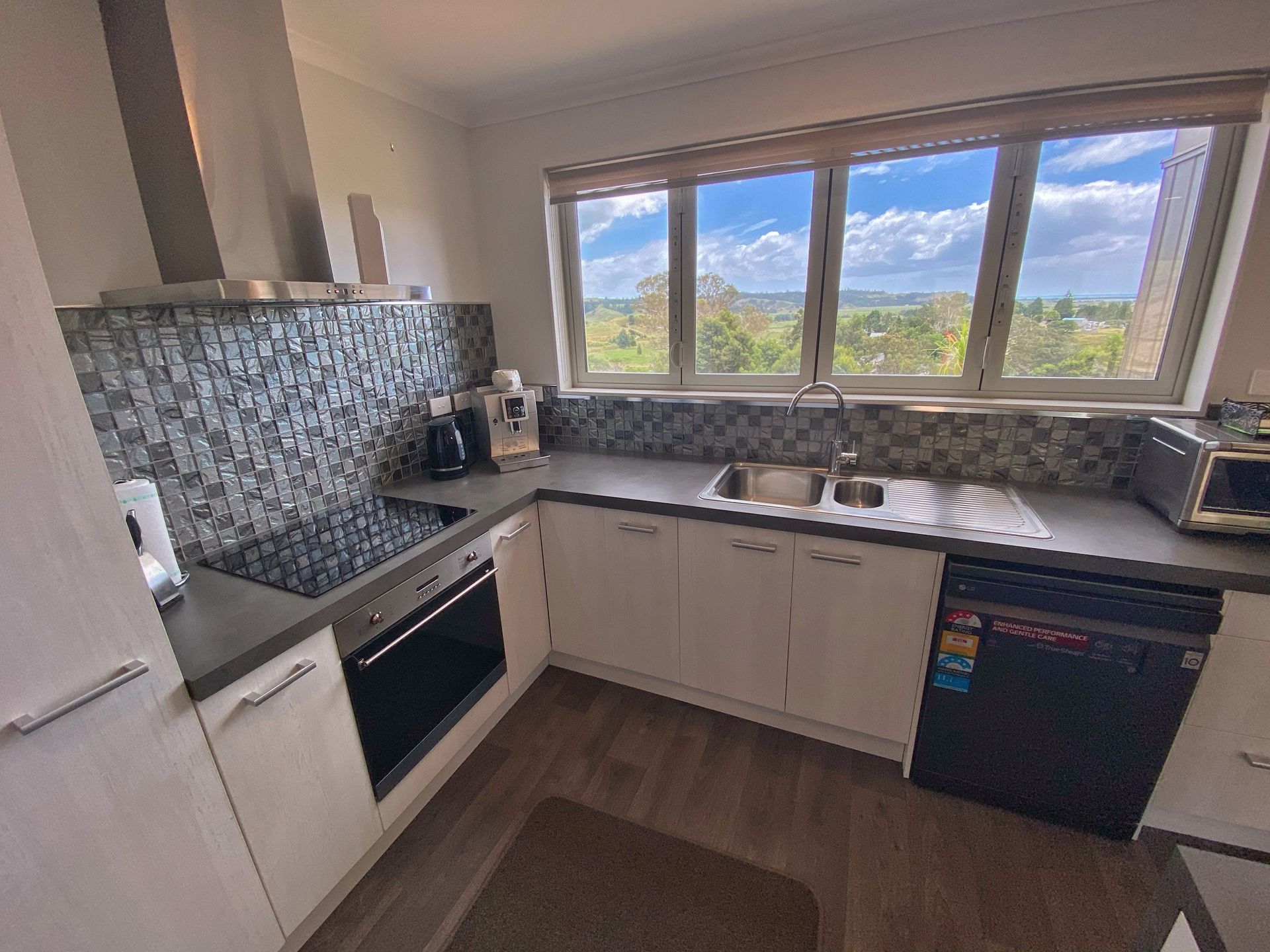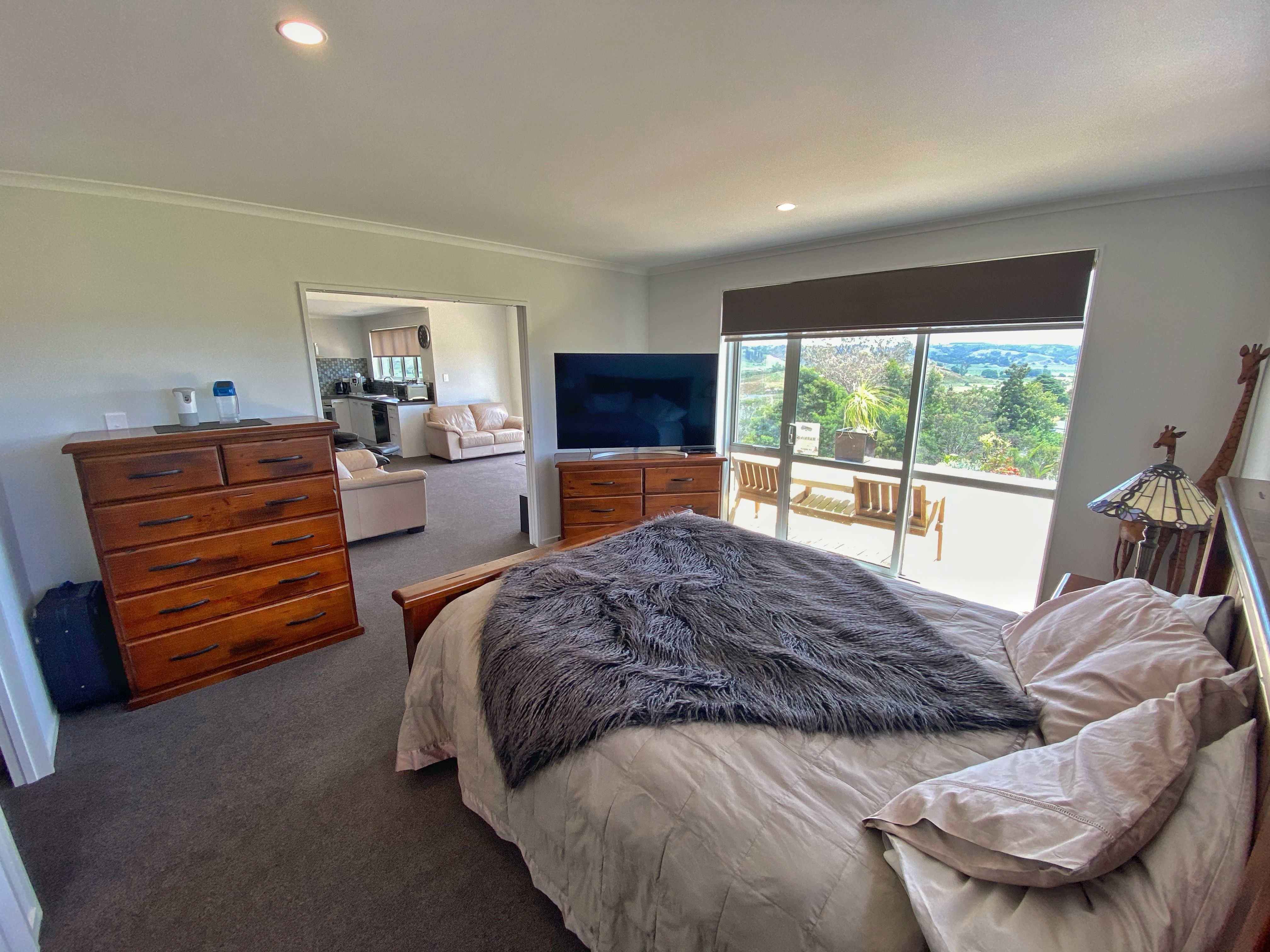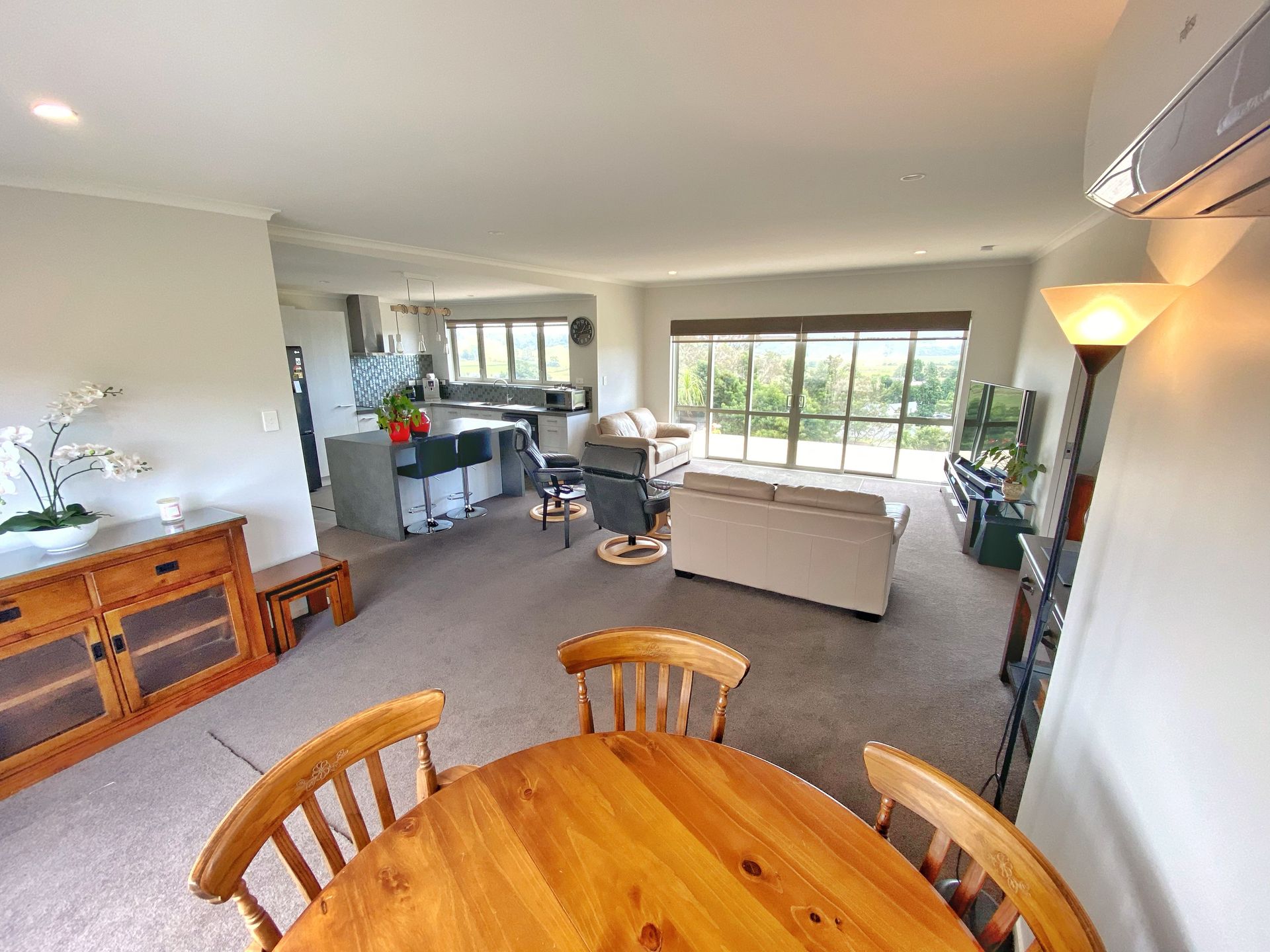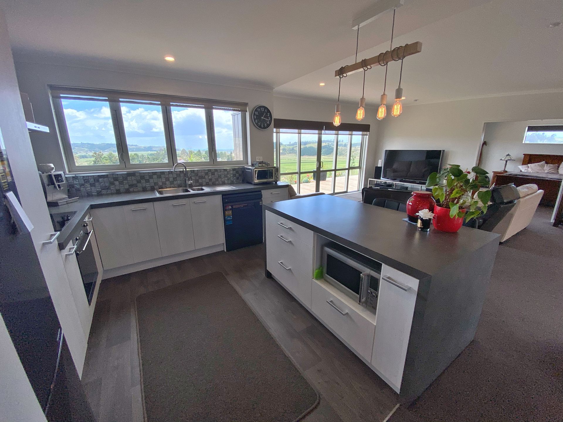 The contemporary kitchen has pride of place and is equipped with a socially orientated island bench. The bi-fold windows above the sink open out, maximising the view. Large slider doors in the living area and two of the bedrooms provide a seamless flow out on to the super sized deck where you can admire the unobstructed outlook.