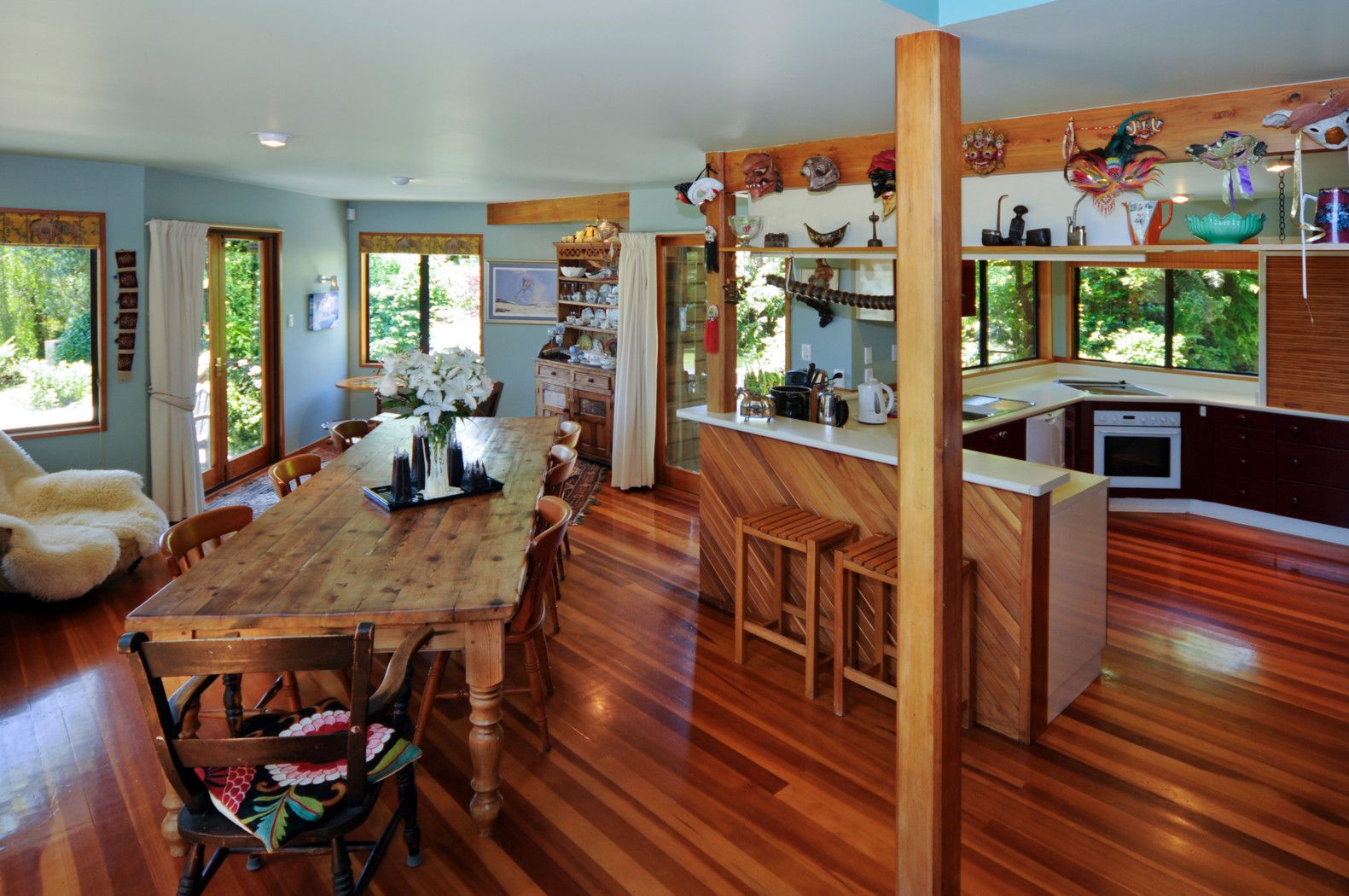 Superbly sculptured in timber and glass this 5 bedroom 2 living home has been built to high specification. This is a home that has features too numerous to mention but is tasteful and intriguingly different. Built to capture the sun, harnessing and storing heat throughout the winter months whilst maintaining cool air throughout summer.