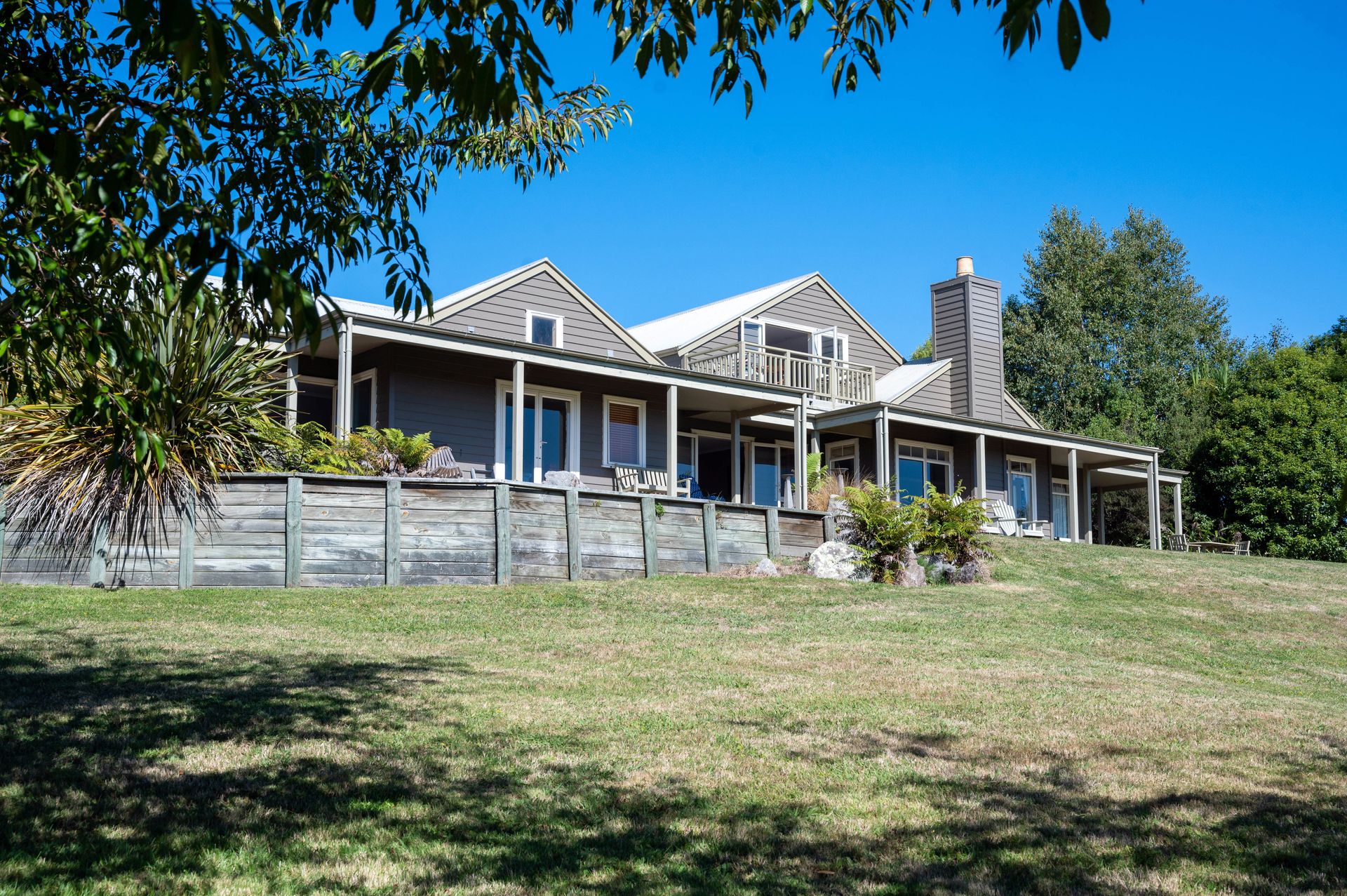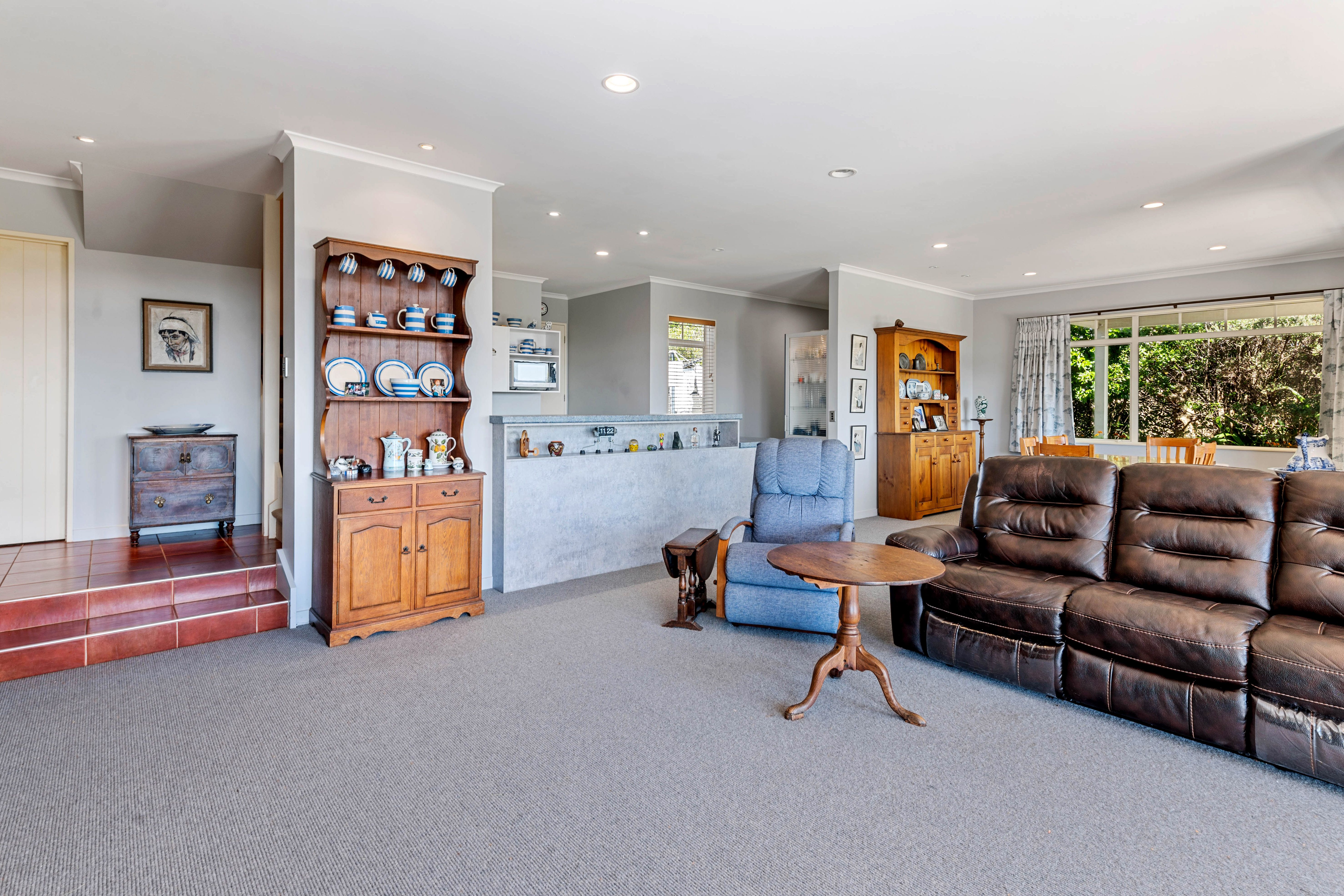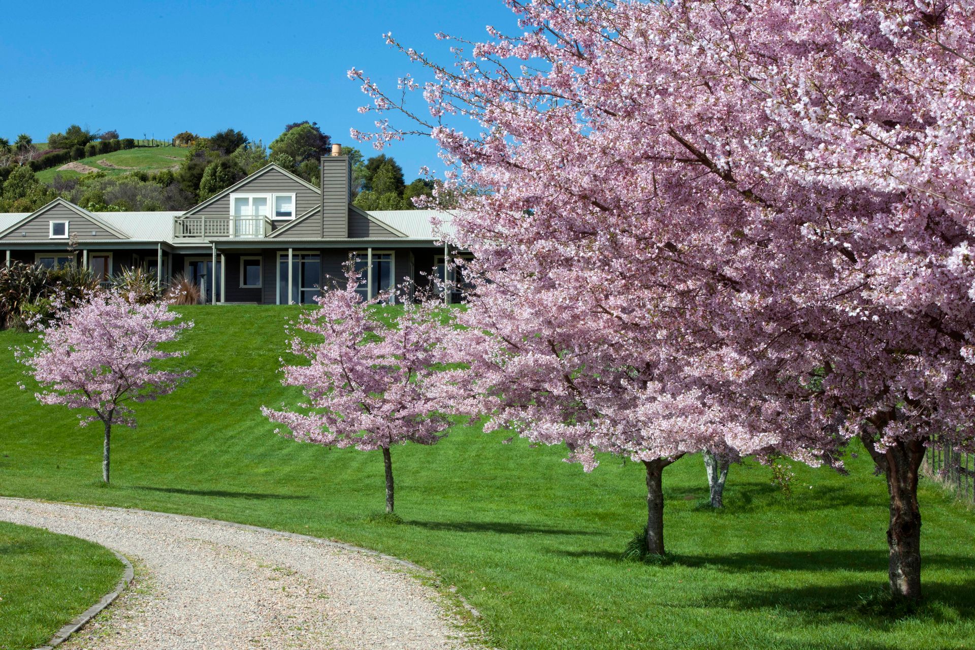 Cherry blossom trees line the driveway that meanders up to the home nestled amongst the ambience of trees & bird life. You are greeted with generous parking space and a home that celebrates the widespread vistas with decking that wraps around much of the house. Entry to the home is equally impressive. Double doors lead directly into a foyer that separates the main living area from a private wing with three double bedrooms, plus a lounge with outdoor access and a kitchenette.