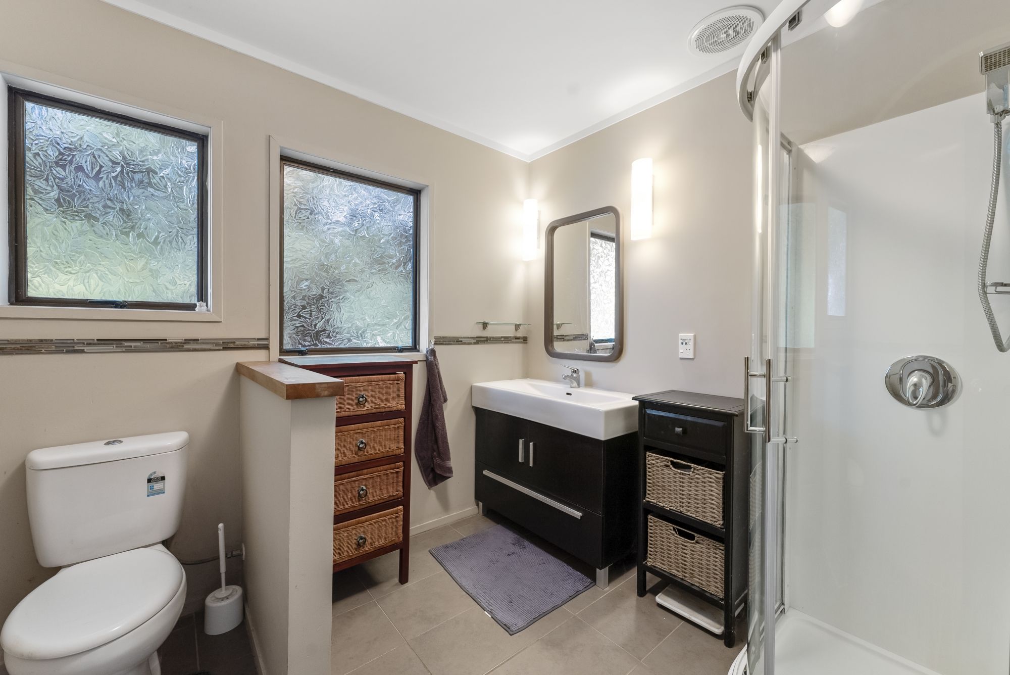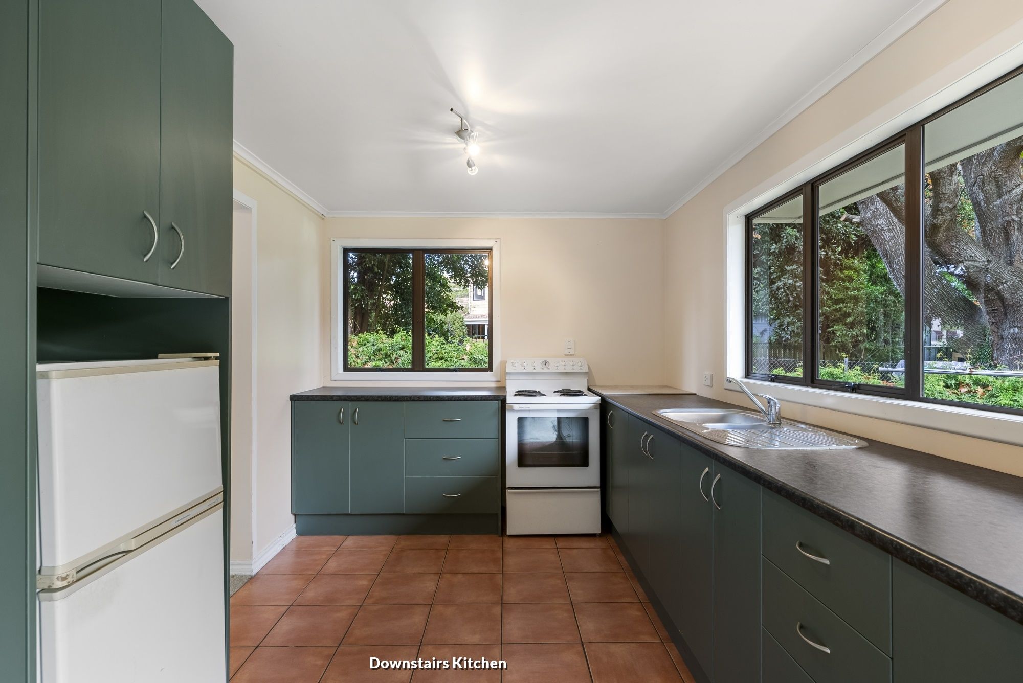 Downstairs, the property showcases a one-bedroom self-contained 64 sqm granny flat with a spacious lounge, full kitchen, dining area, and bathroom that features a walk-in shower and mobility rail. The kitchen is fully functional and offers ample cupboard space. The dining room opens onto a sizable deck, providing the option of outdoor dining or tranquil garden views.