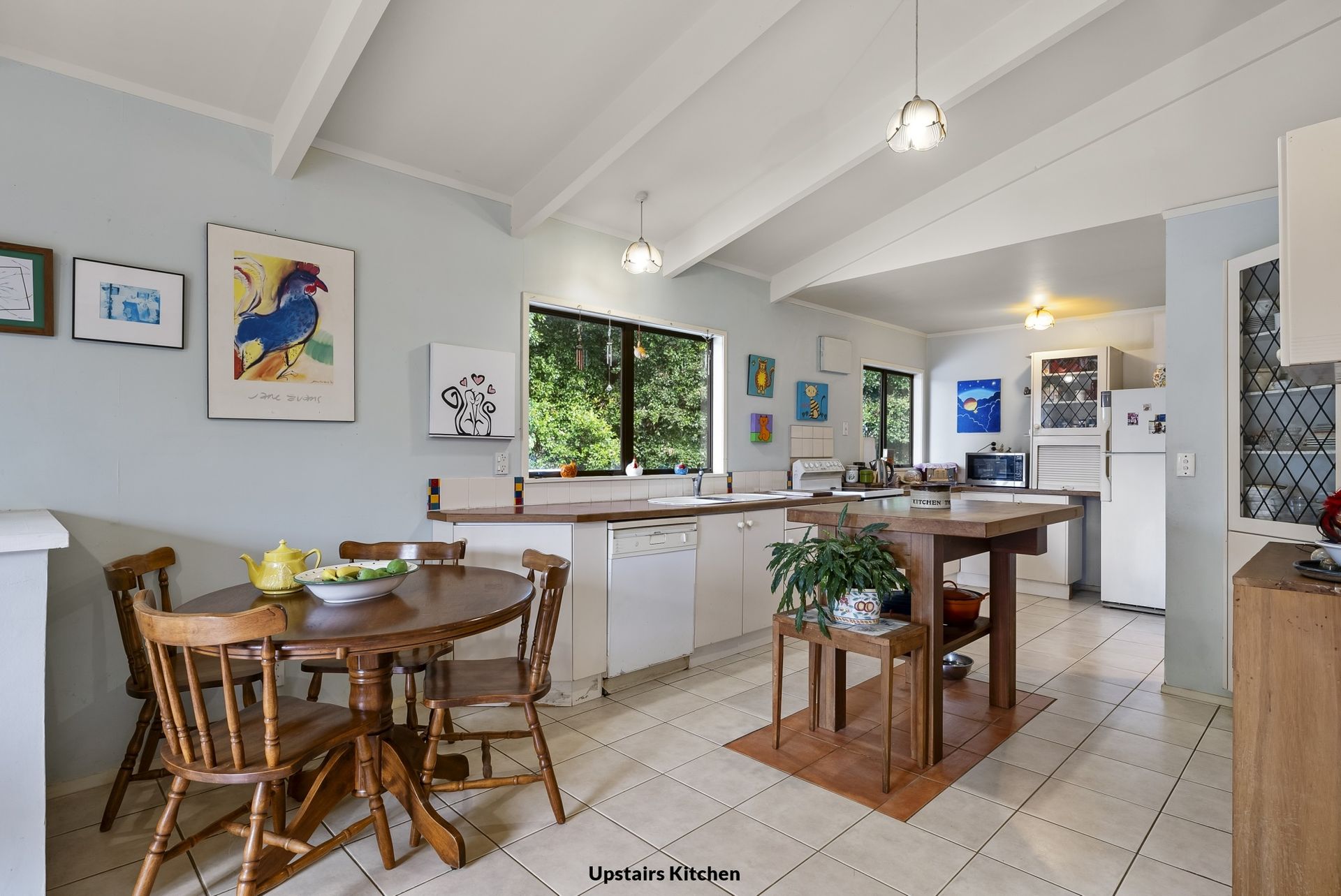 The two-story residence, built in the 1980s, features three spacious bedrooms upstairs, a large open kitchen ideal for gathering, and an inviting family/lounge room with a charming potbelly stove that adds warmth and charm during the colder months. The spacious front deck, which flows around the side of the house, provides multiple options for outdoor dining or entertaining, offering a delightful spot to unwind and enjoy the natural surroundings. The house is also fenced to ensure your comfort and privacy. The large flat section provides an abundant, well-established garden for entertaining or relaxing in your private sanctuary. The back garden is a haven with a large oak tree as the feature and beautiful cherry blossoms blooming from mid-September.