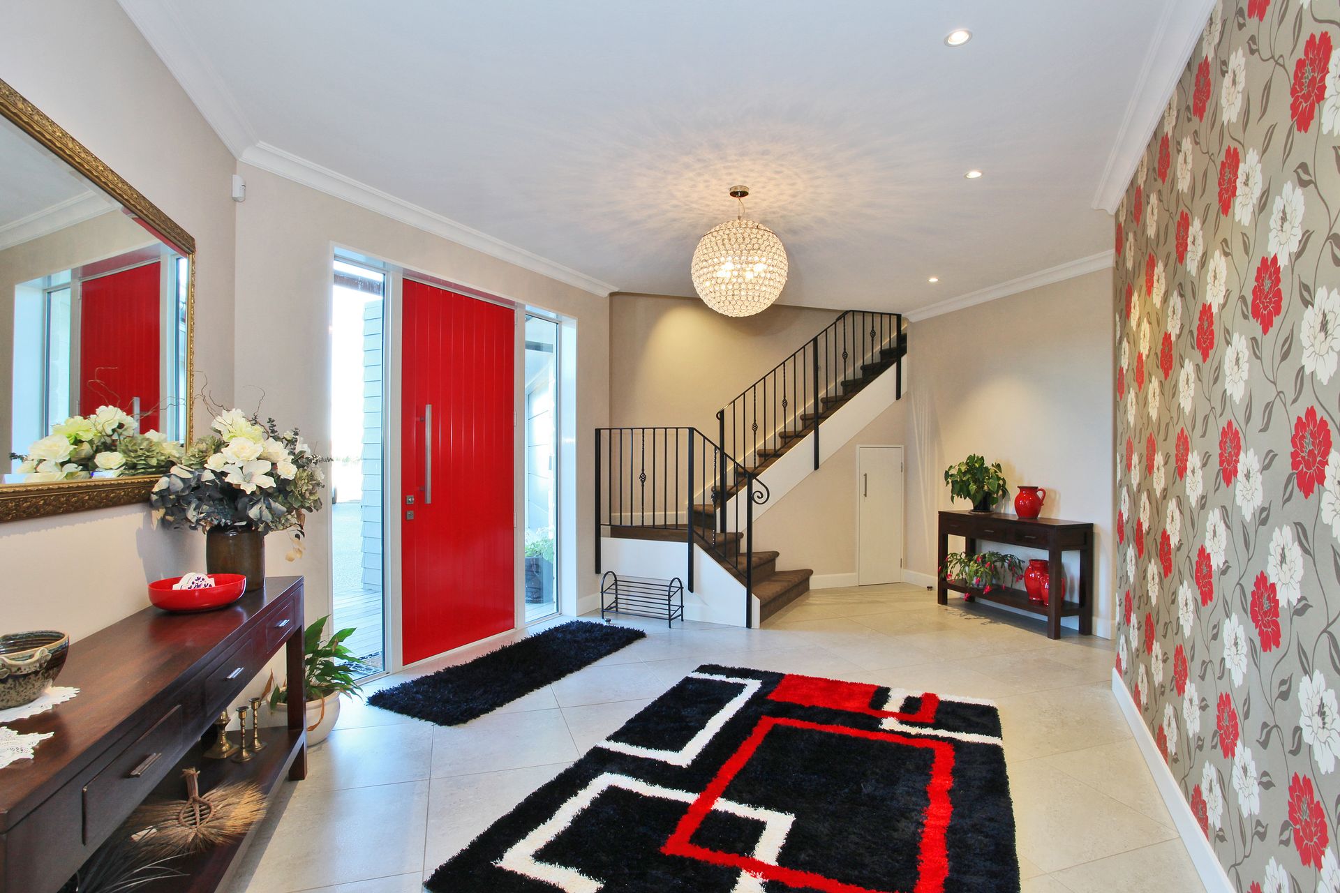 - Large foyer area with feature wall and lighting.