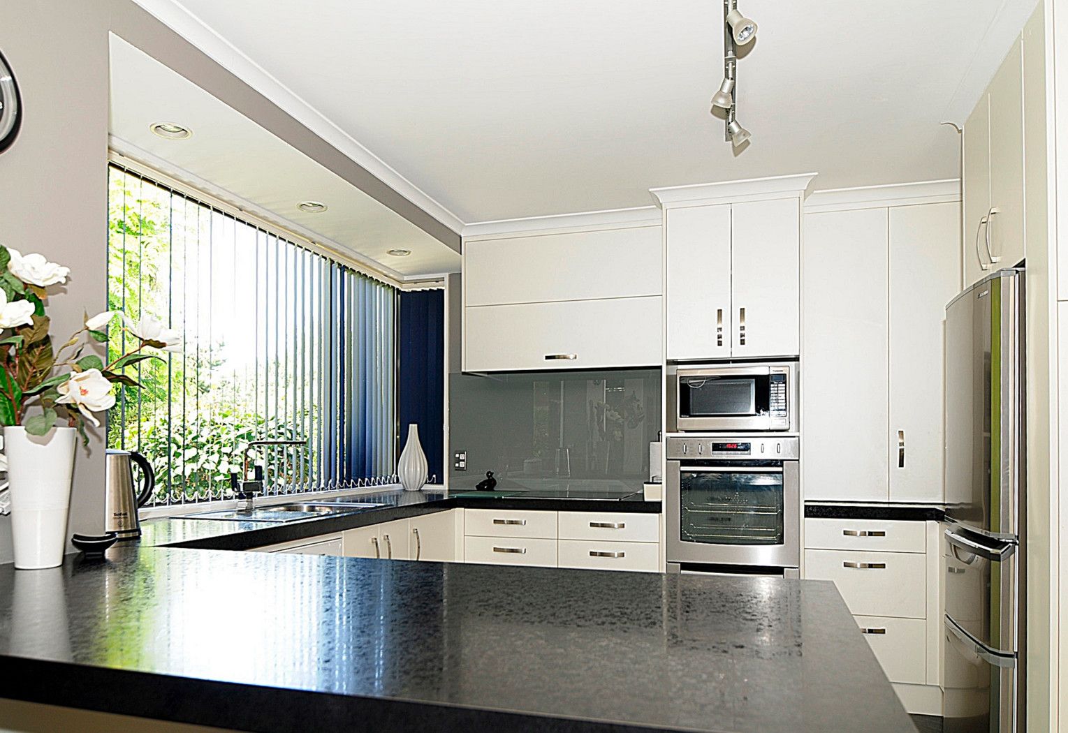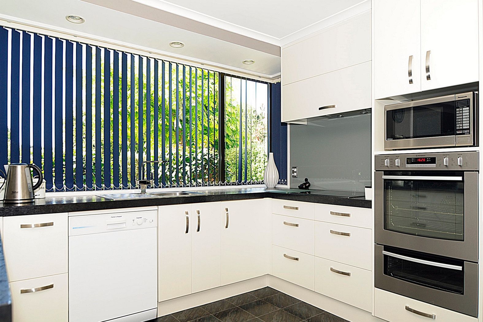 The modernized kitchen has the WOW FACTOR - with double wall oven, pantry and enclosed ironing board.