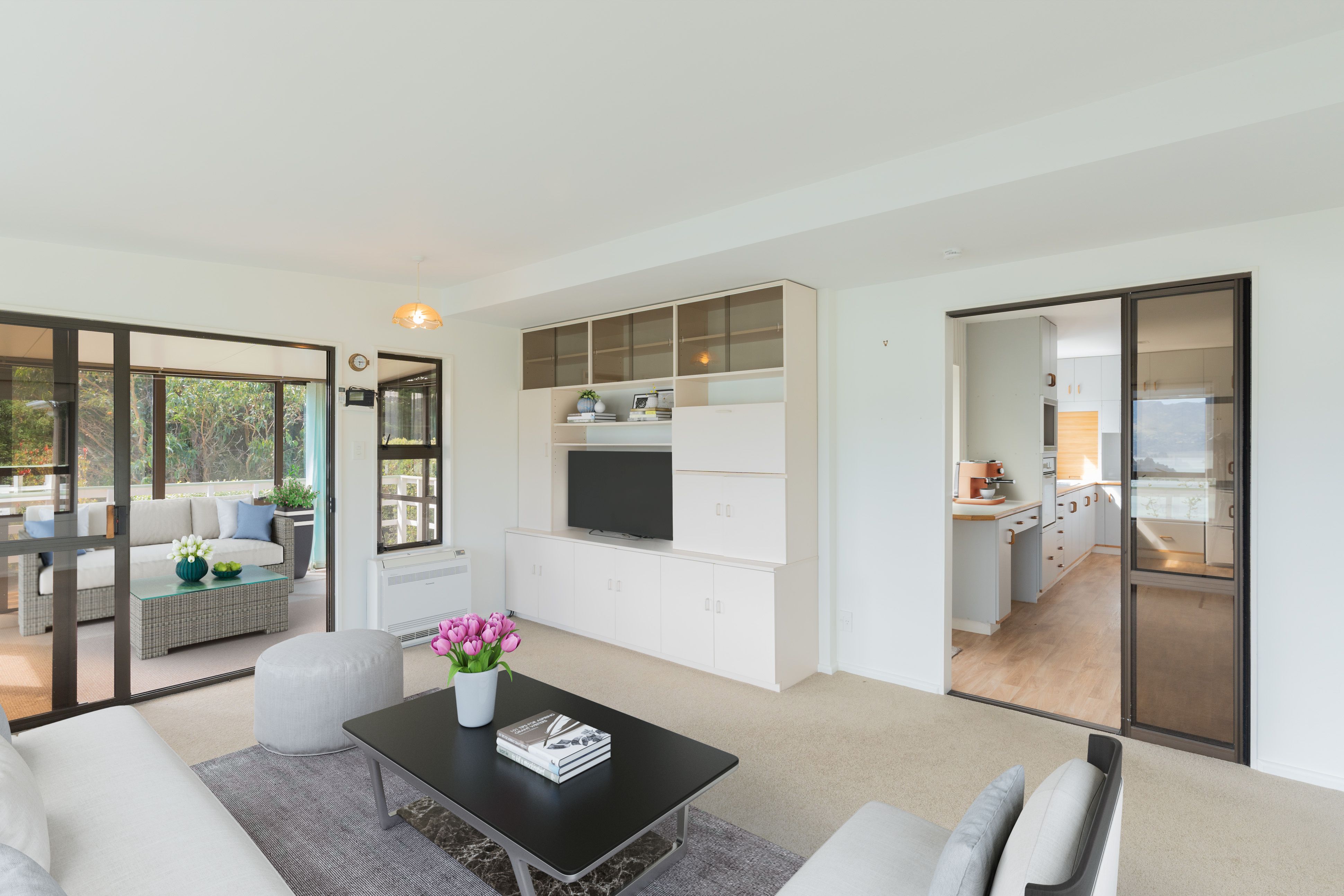 The home consists of 3 bedrooms, 2 bathrooms a well-equipped kitchen, loads of storage space and plenty of choices for living spaces, with a lounge, family room and two sunrooms. This home caters for all, families, weekenders, couples, it has the space to spread out but without feeling you need an intercom to communicate. Keep warm and cosy with winter nearly upon us with the log burner and heat pump.