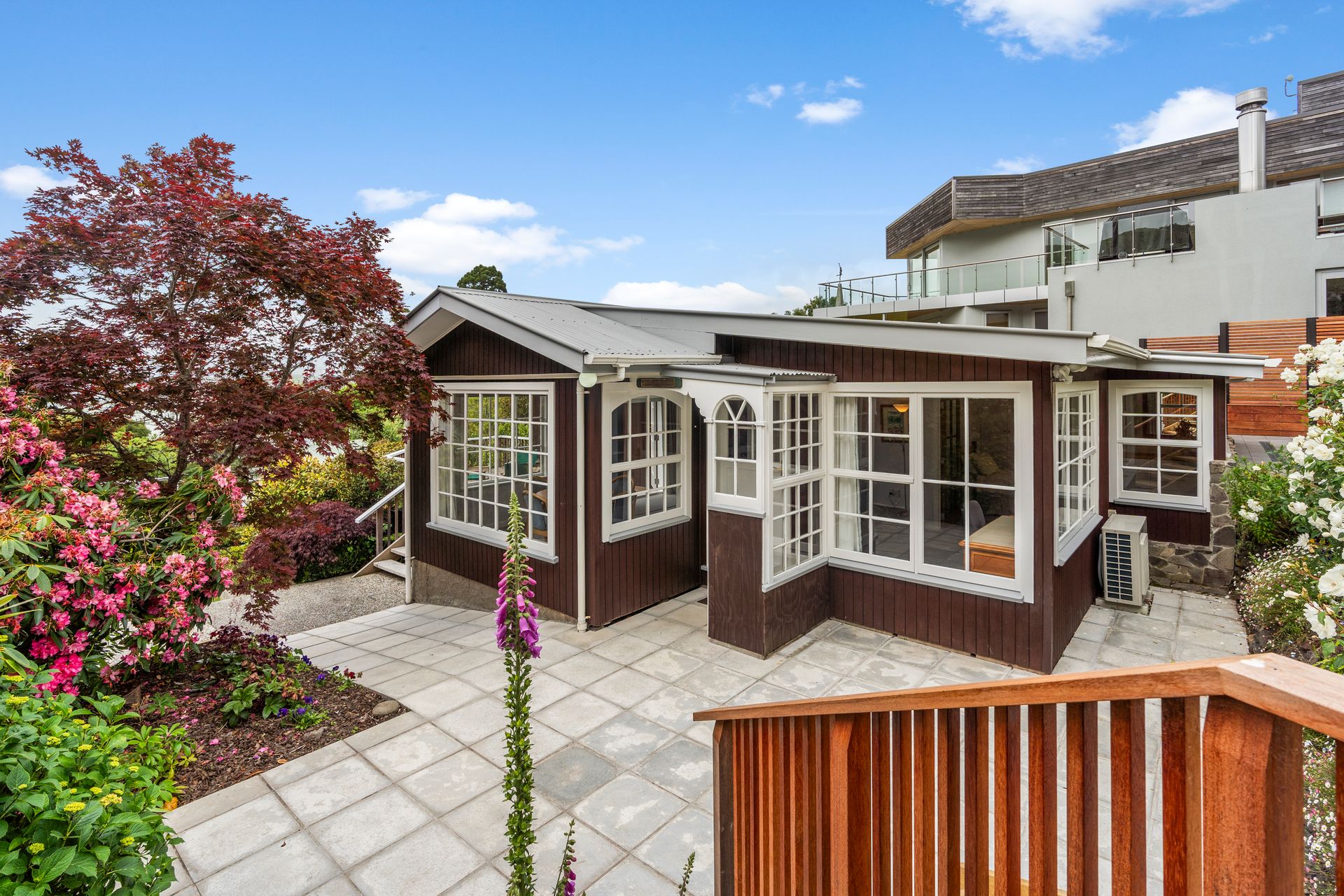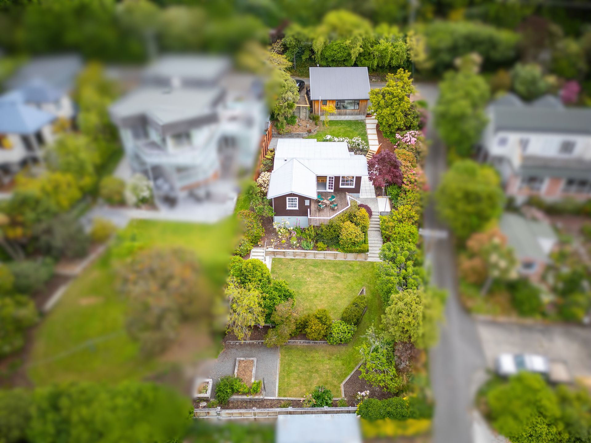 The Site: Established and landscaped, the generous section enjoys elevation to allow views. Terracing, a courtyard, and decking from the cottage take full advantage of the sun, the shelter, and the view.