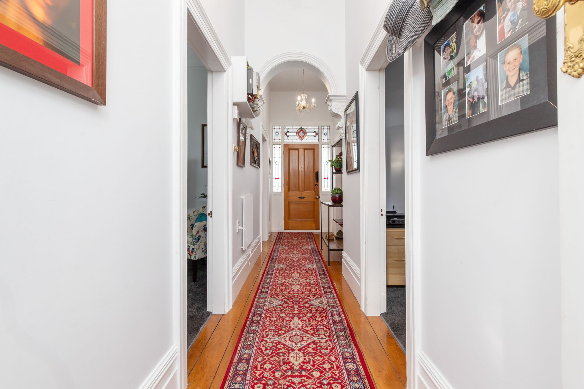 Upon entry, the hallway features native timber floors, an ornate plaster archway, and leadlight windows, anchoring the character here. High ceilings throughout, period skirtings and architraves, with Kauri doors, offer historical features you can't replicate today.