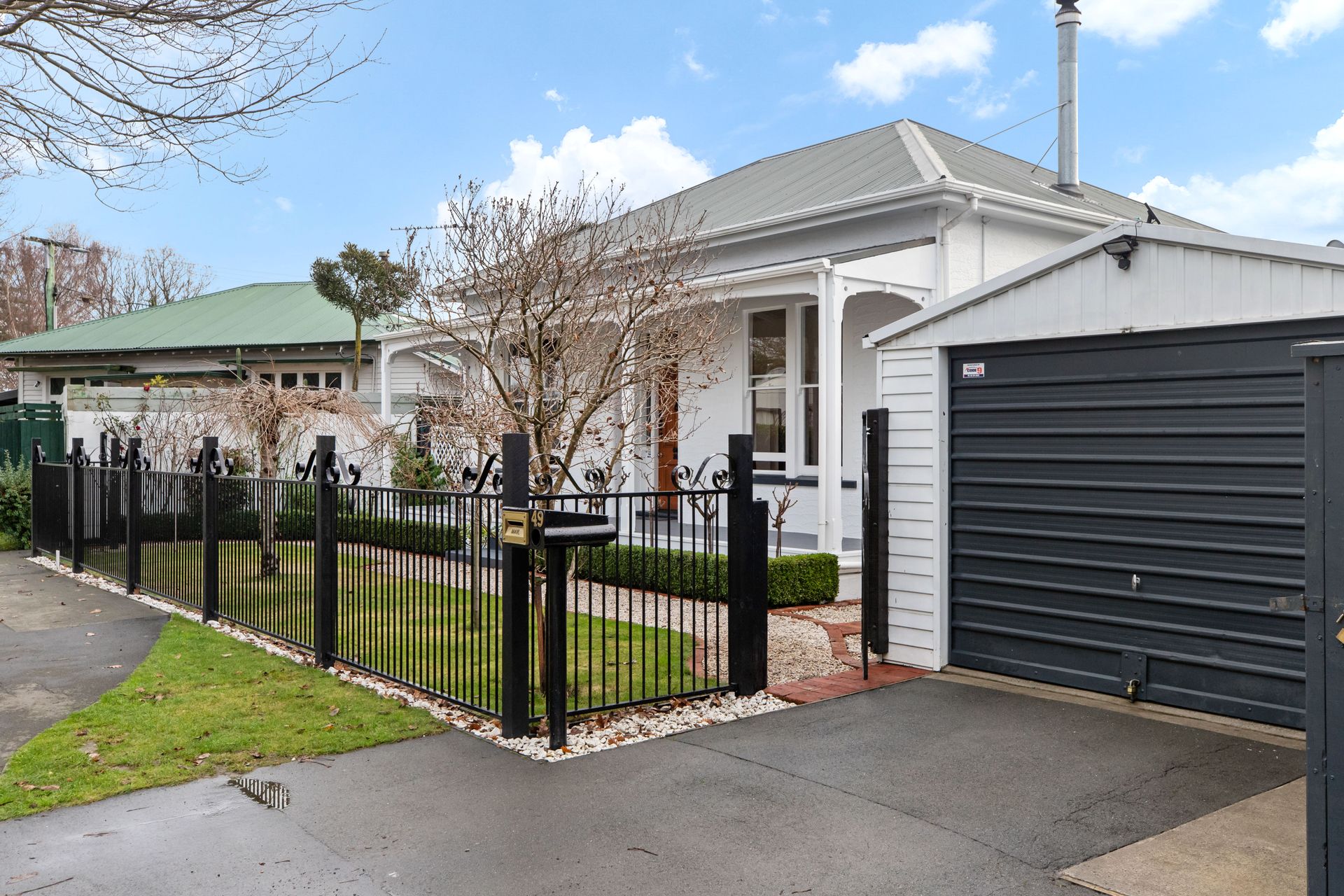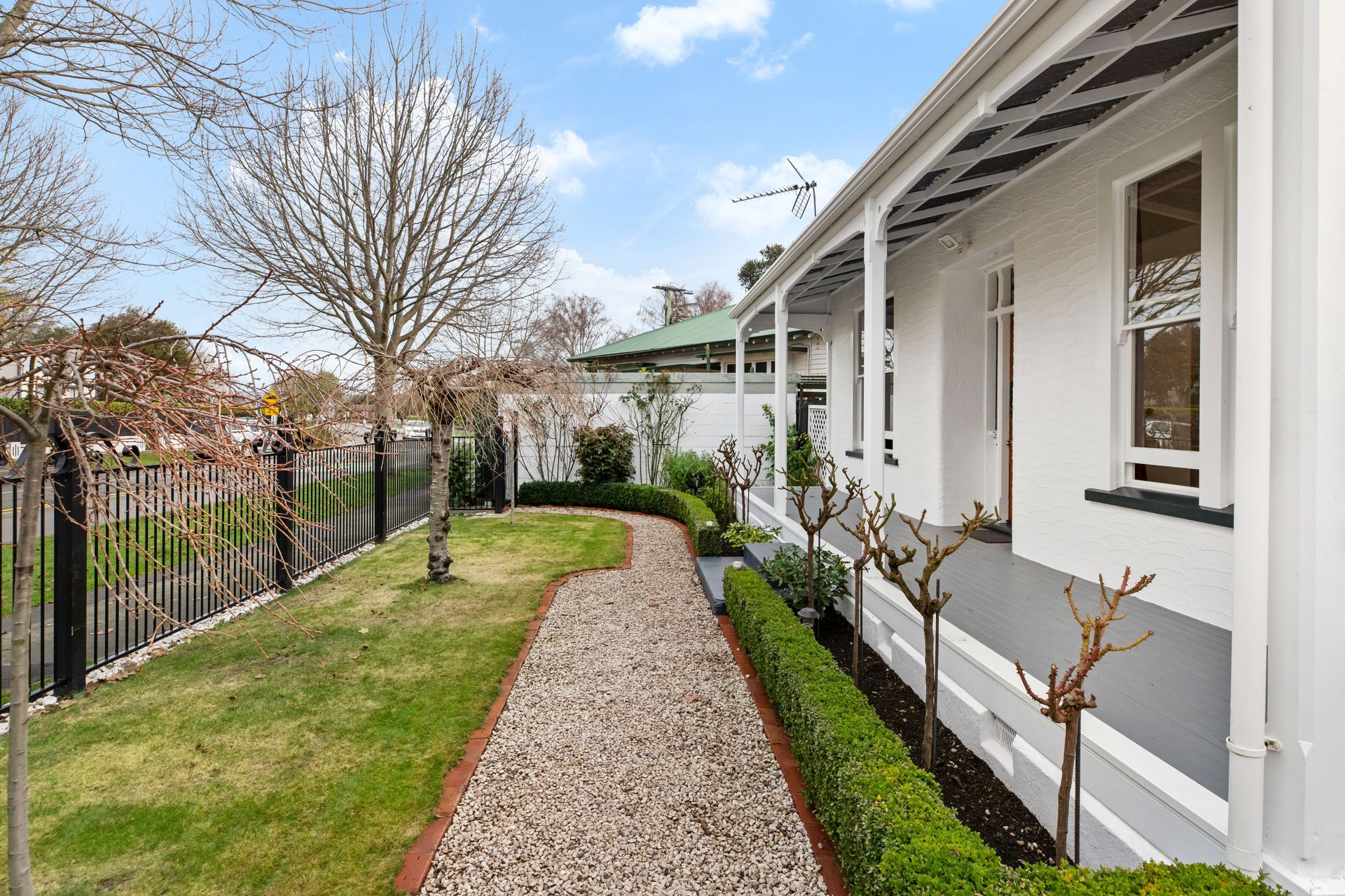 The rear of the Villa features the character filled kitchen that includes plentiful storage, granite benchtops, and an open plan dining room, with two sets of French doors out to the covered deck and sunny North facing courtyard. Brick paving showcases the stunning gardens that create different displays all year round, including multiple rose varieties, fruit trees and vegetable planters.