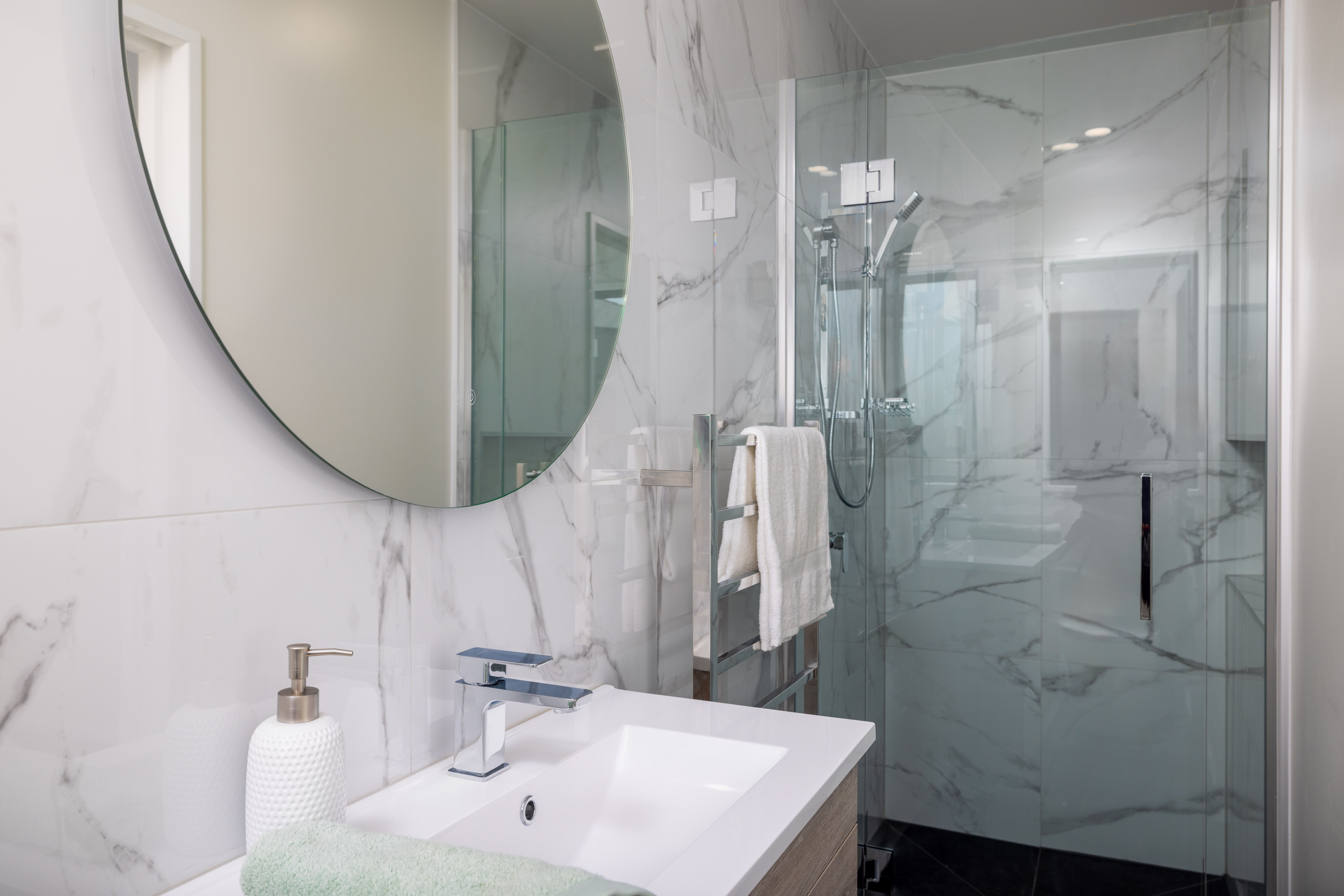 - Modern family bathroom with separate bath and shower