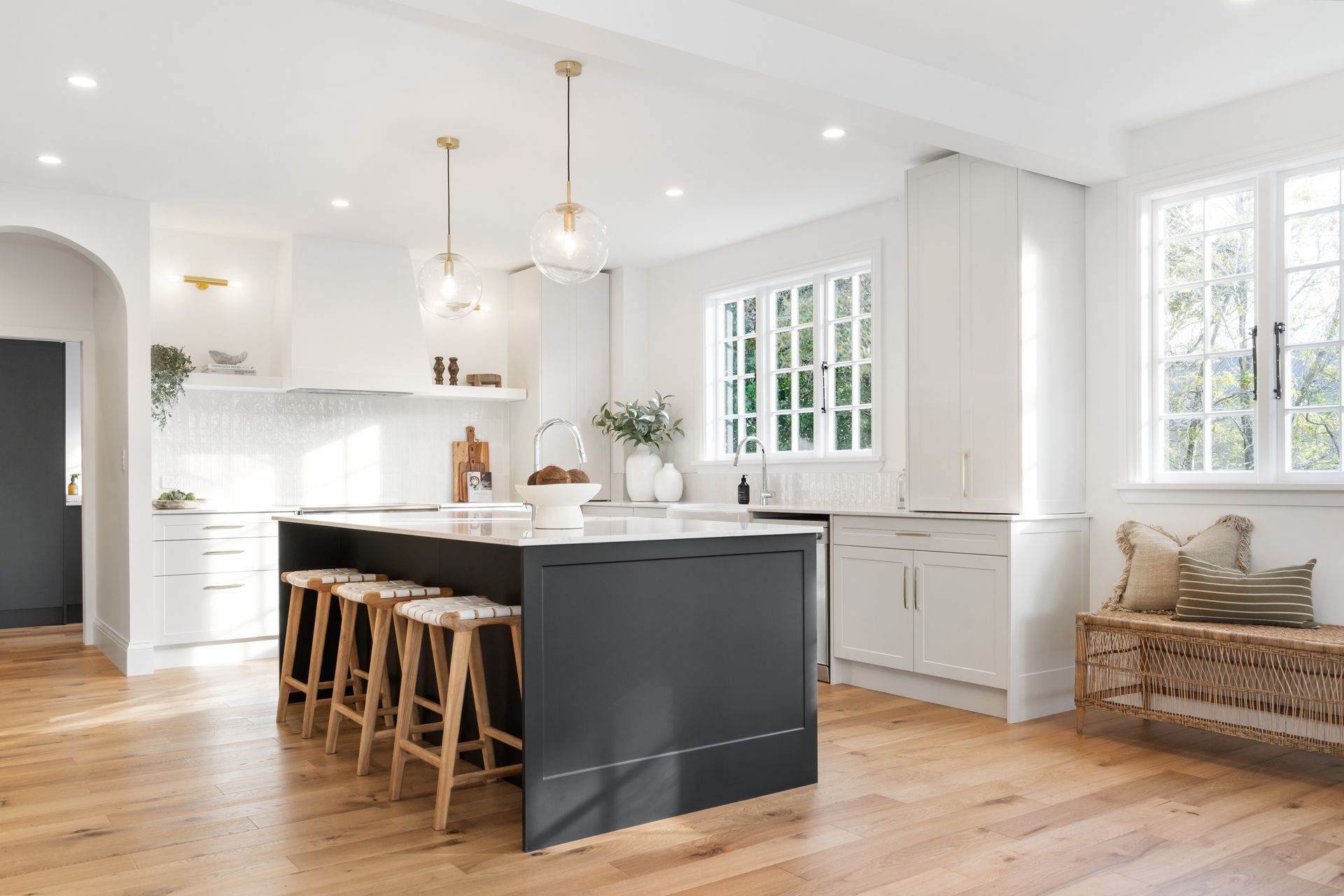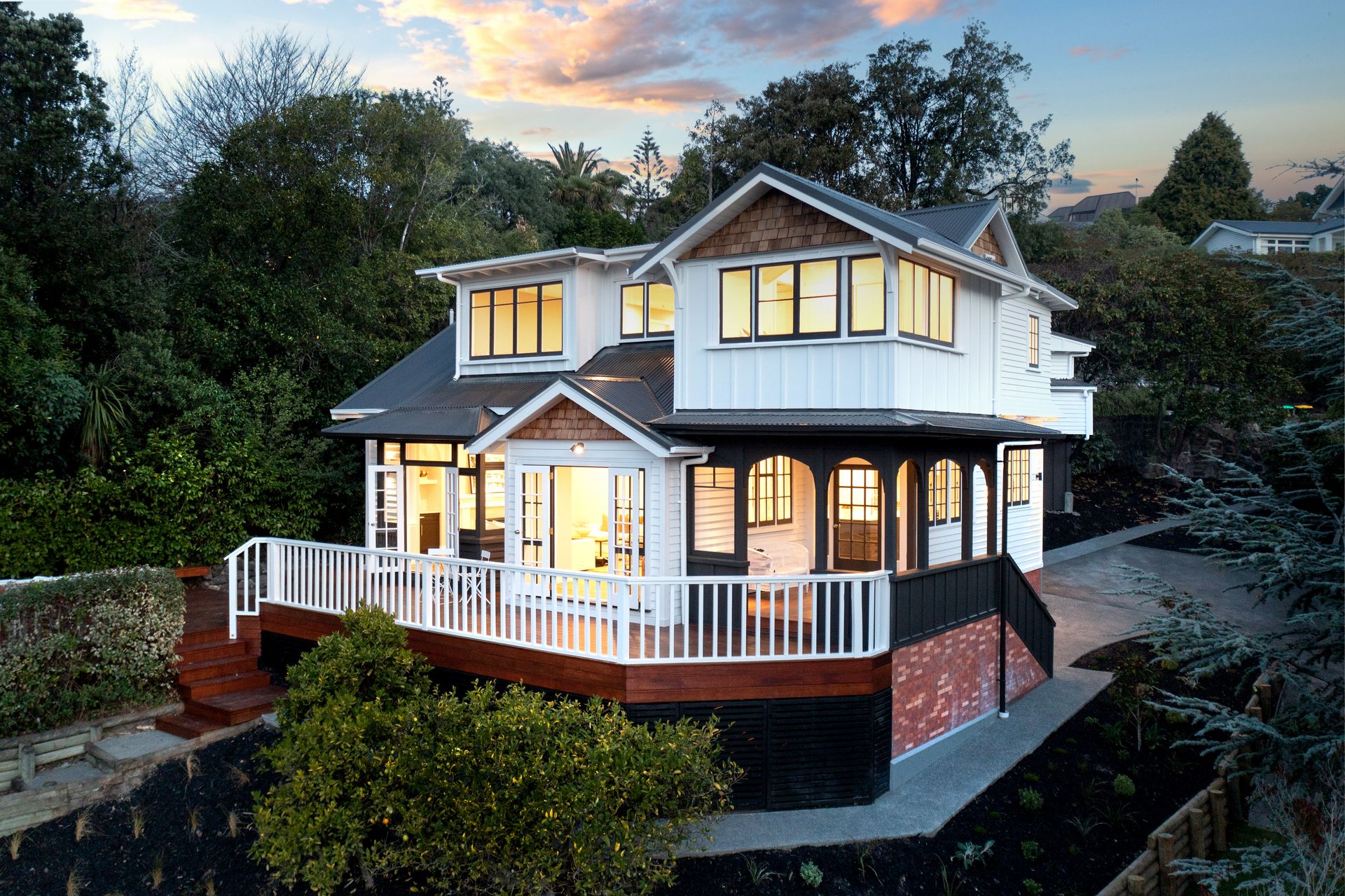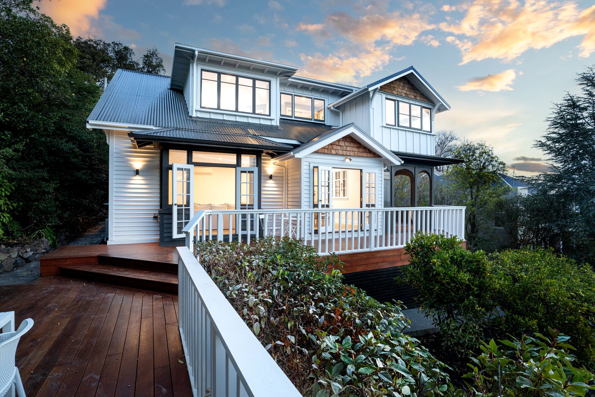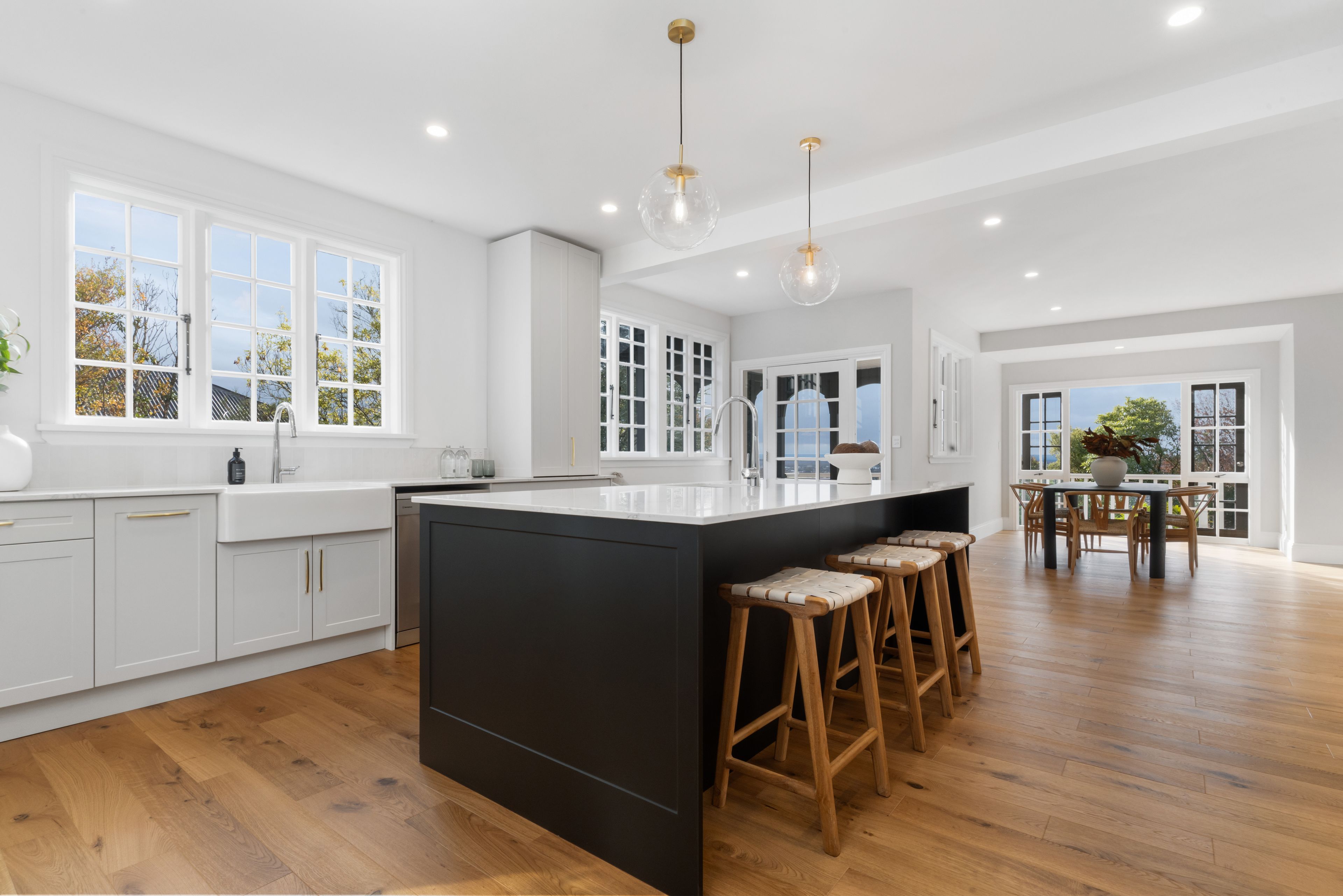 The expansive open-plan living, dining, and kitchen area provides the perfect setting for both everyday living and grand entertaining, seamlessly flowing onto the wrap around Kwila decking, where panoramic views serve as a breathtaking backdrop. Bremworth wool carpets and engineered Oak flooring enhance the space.