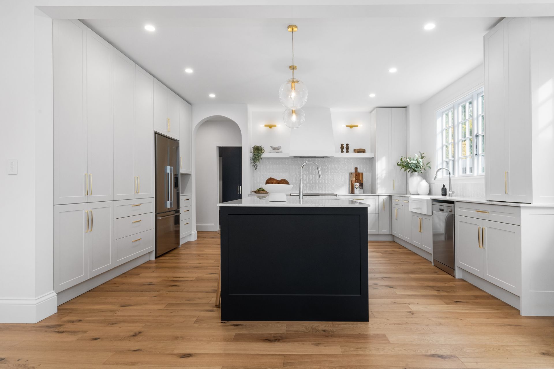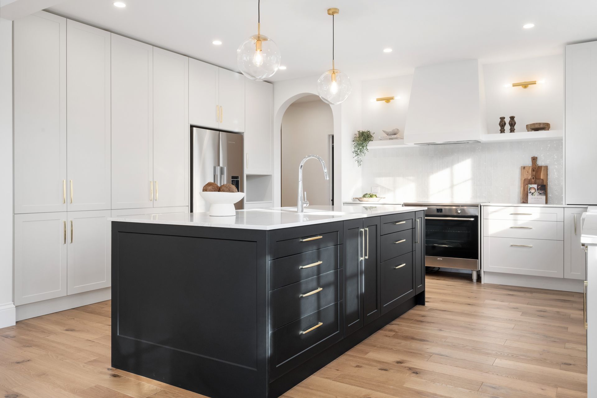The heart of the home is the designer kitchen, featuring sleek composite stone benchtops, dual sinks, thermally wrapped soft-close cabinetry, top-of-the-line appliances including a plumbed-in fridge and Smeg oven - all complemented by a convenient scullery and laundry.