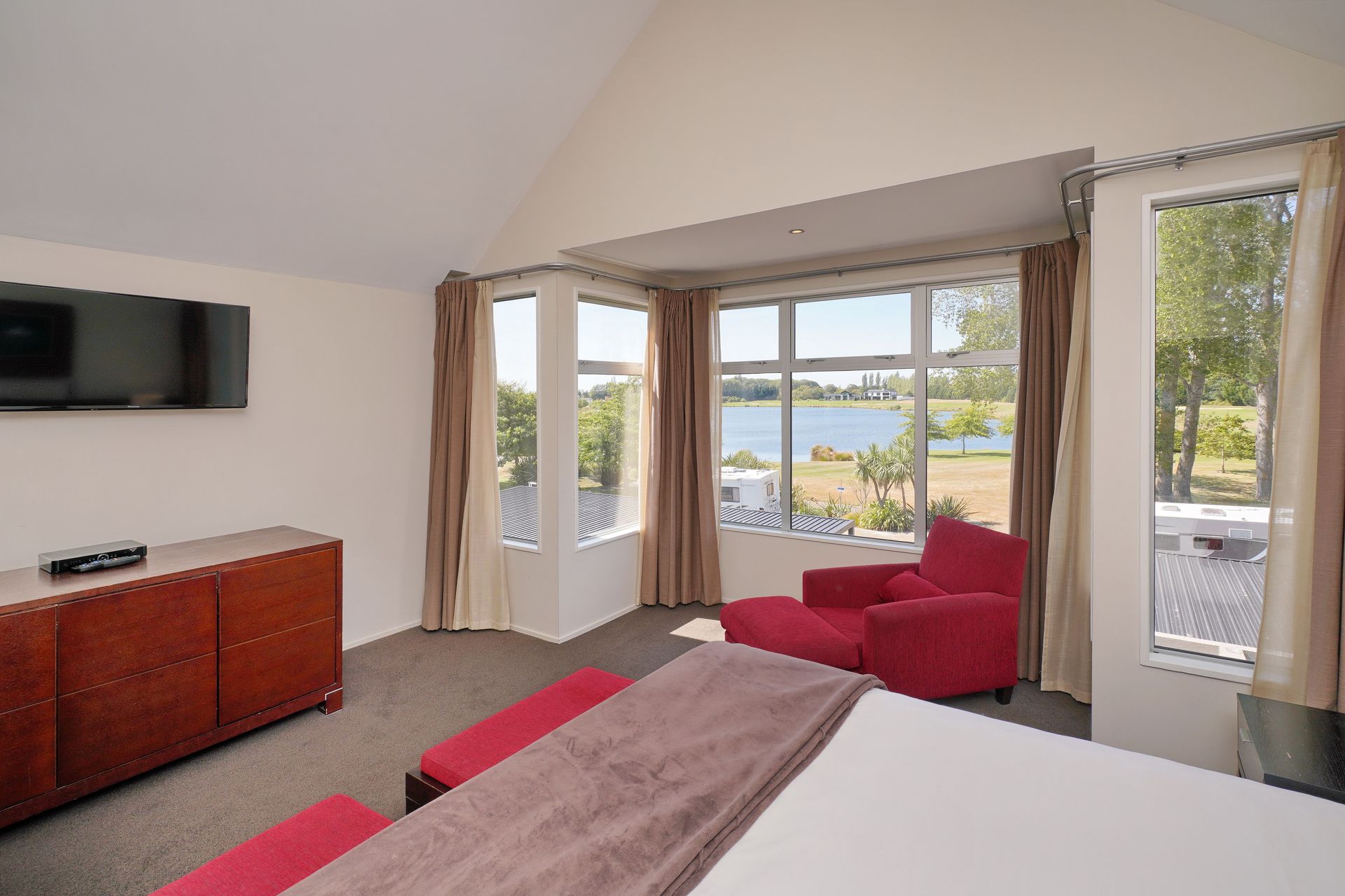 Positioned on the second level, this executive suite offers a spacious bedroom overlooking the 10th hole and adjoining lake, tiled bathroom with separate shower and bath. Full kitchen facilities including gas hob, dishdrawer, fridge/freezer and microwave. Fully furnished with modern fixtures and fittings, cathedral ceiling throughout and bi-folding doors opening out to the west facing balcony so you can relax and enjoy the afternoon and evening sun.