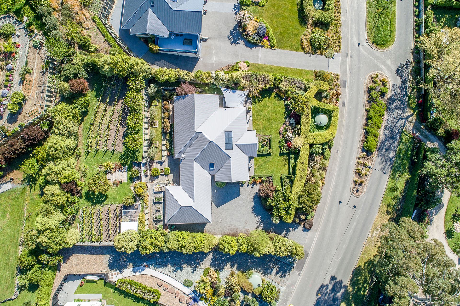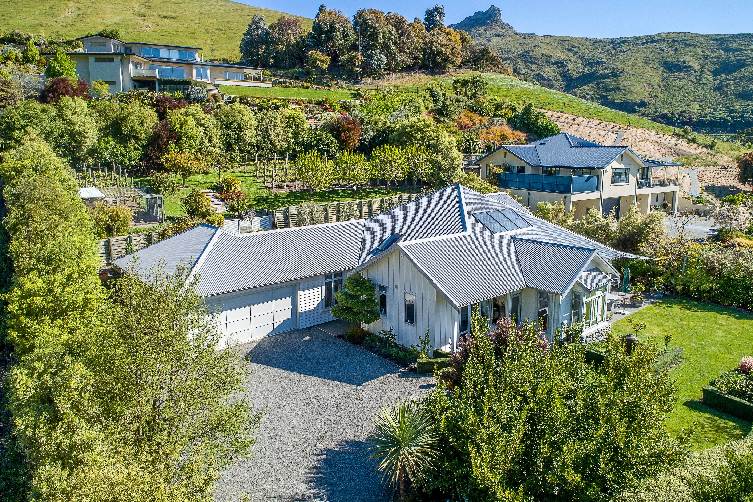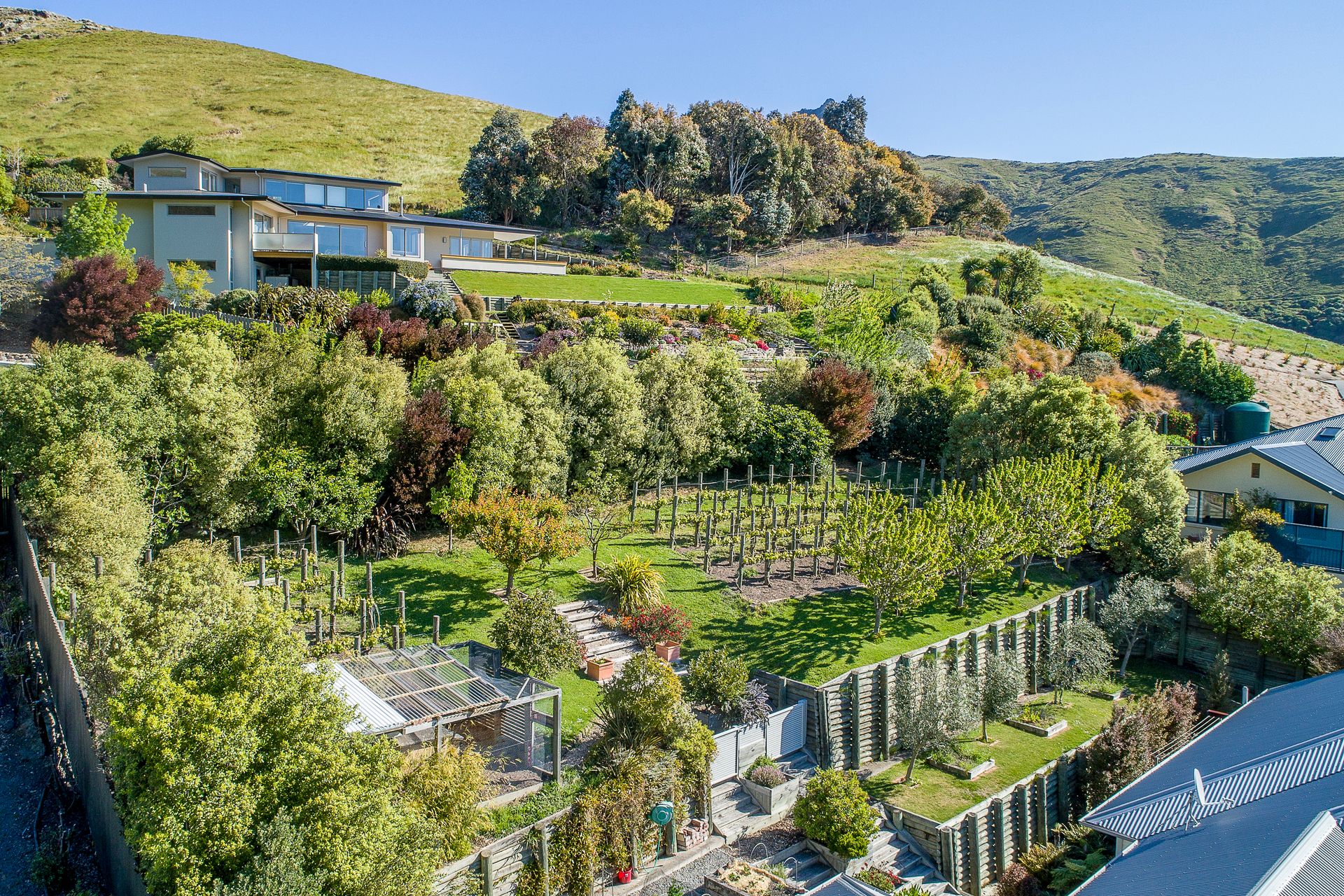 This property has a spectacular botanic backdrop with the front hedges giving privacy and shelter for outdoor entertaining. Behind the house are terraced vegetable and herb gardens as well as a range of productive fruit trees. Pinot Noir vines are flourishing on the top terrace, producing ample bottles of Pinot to be cellared in the dedicated wine making room.