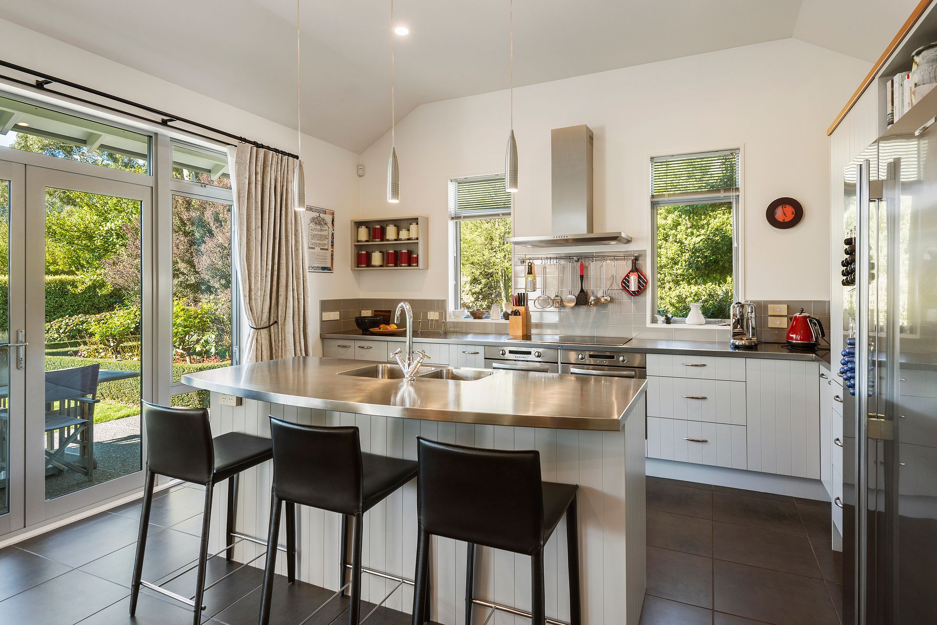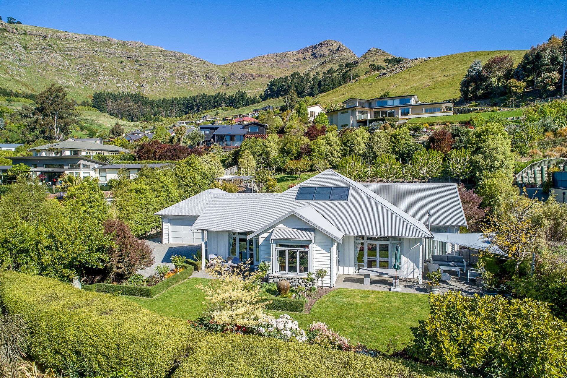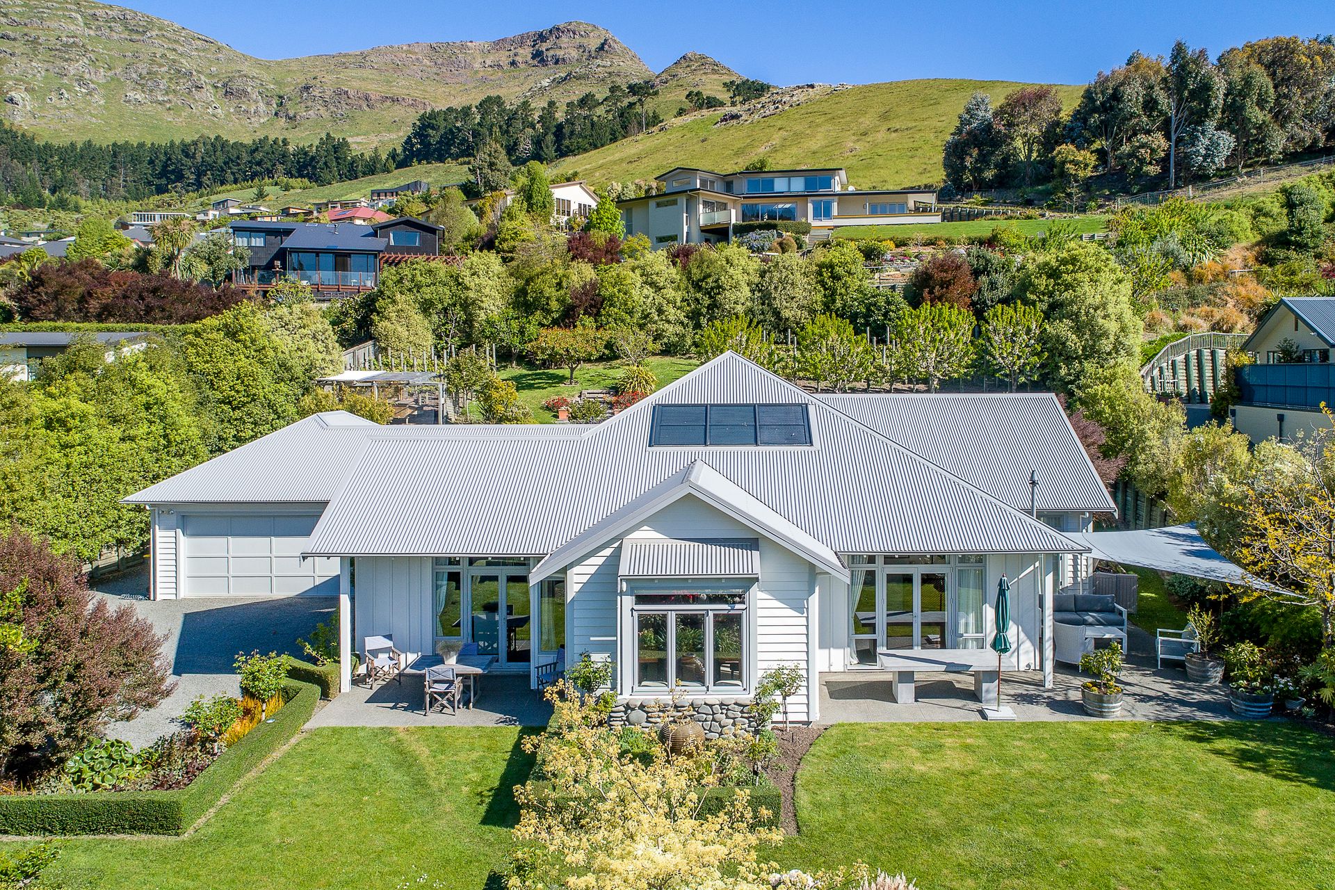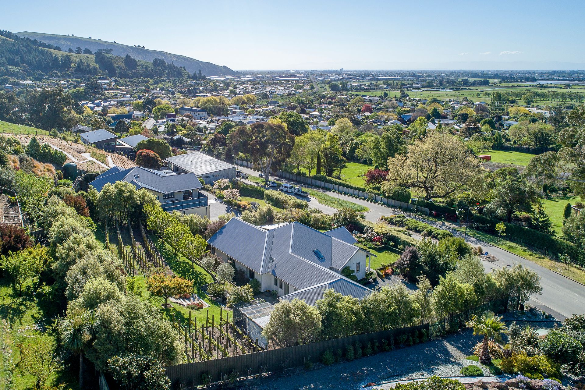This property has a spectacular botanic backdrop with the front hedges giving privacy and shelter for outdoor entertaining. Behind the house are terraced vegetable and herb gardens as well as a range of productive fruit trees. Pinot Noir vines are flourishing on the top terrace, producing ample bottles of Pinot to be cellared in the dedicated wine making room.