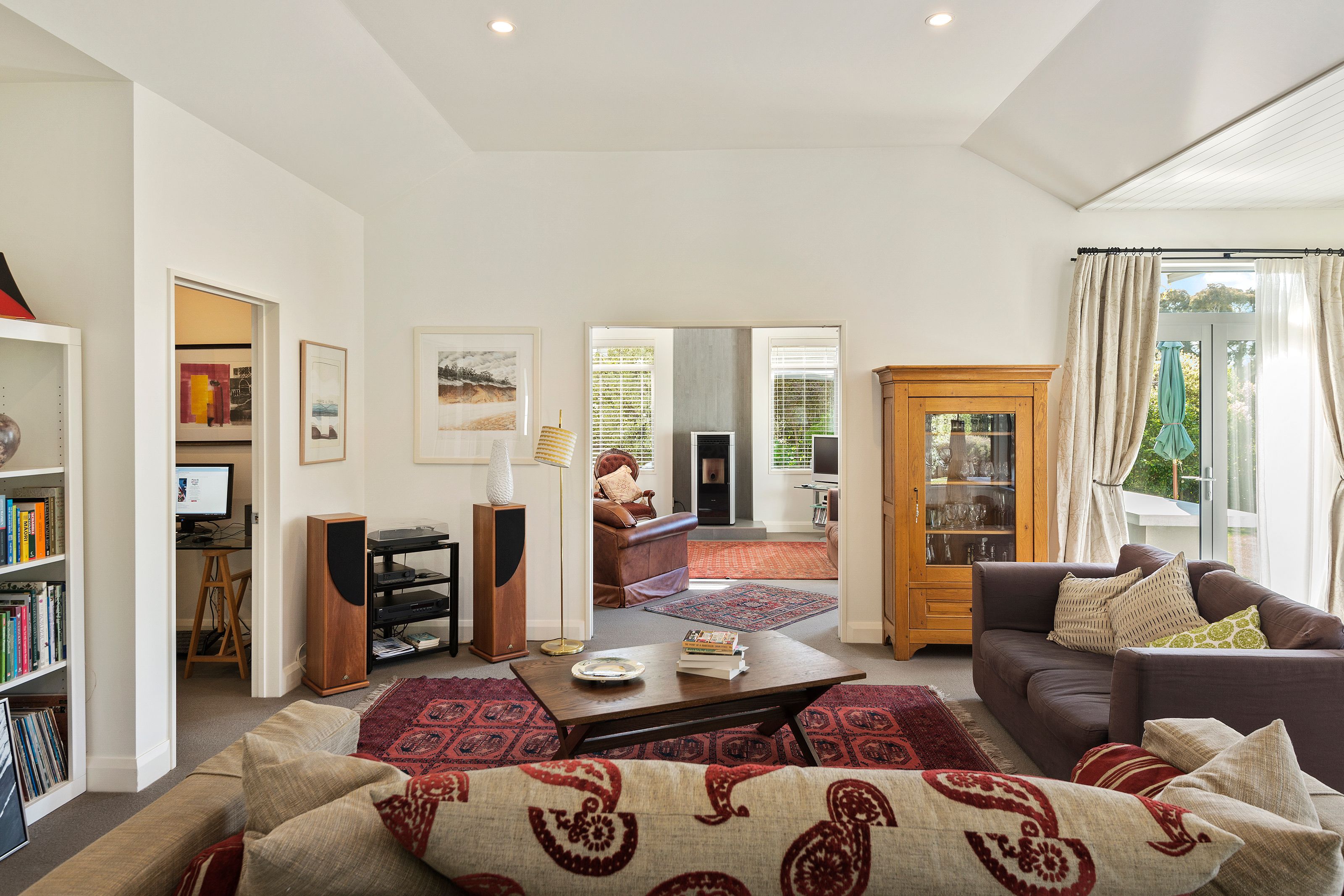 The second living room, like the other living areas opens to a sun-drenched outdoor entertaining area.It has a modern pellet fire that keeps the whole area cozy during cooler months.