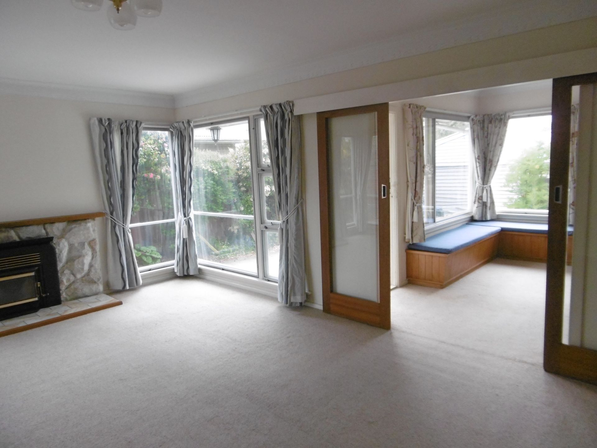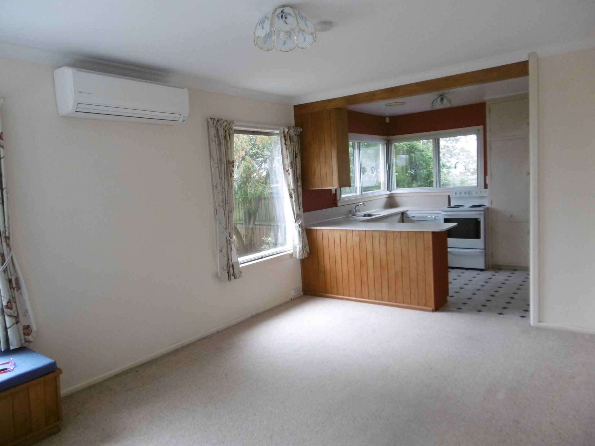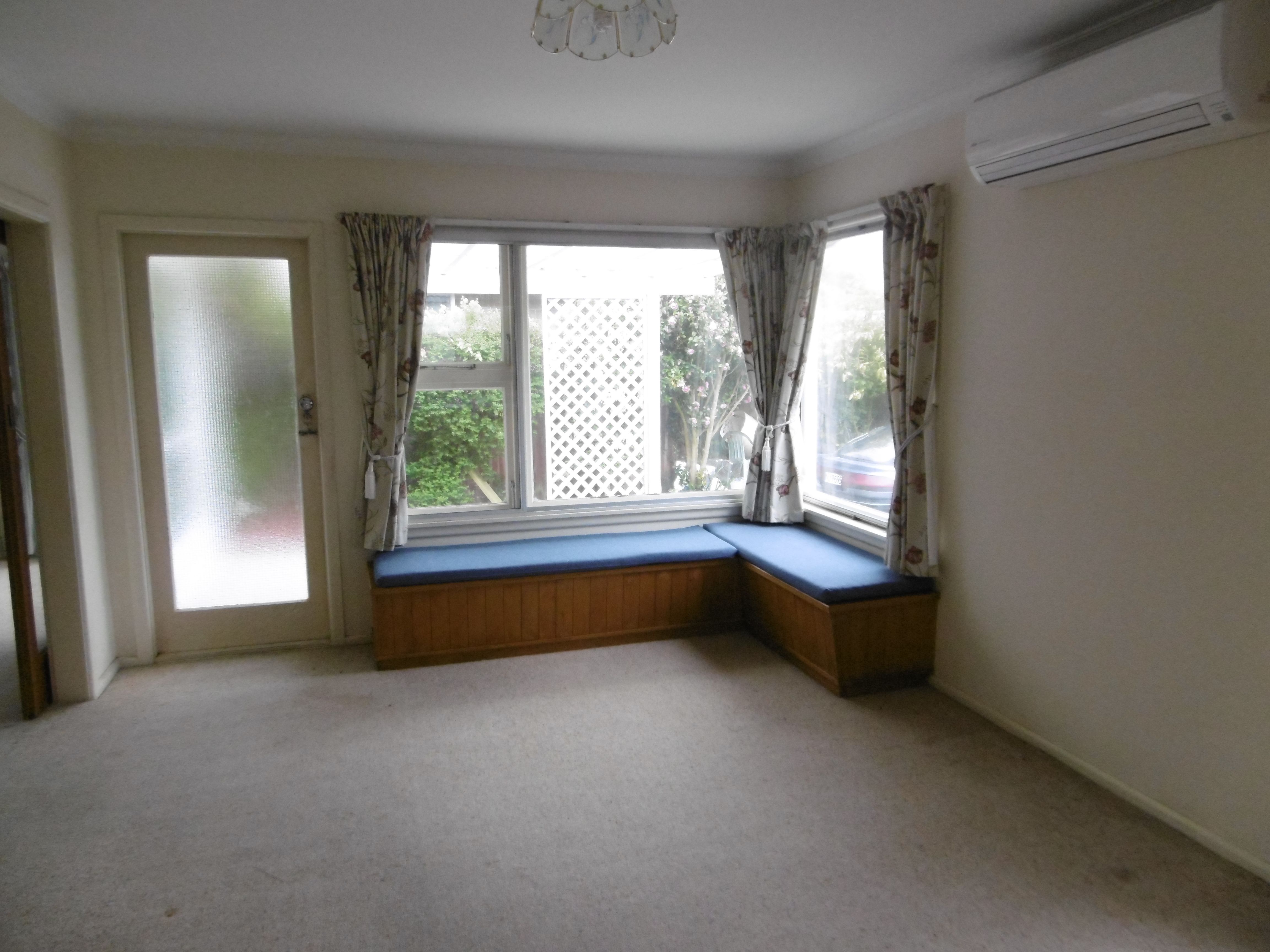 - Spacious, sunny living room with window seat and heat pump, opening to rear patio
