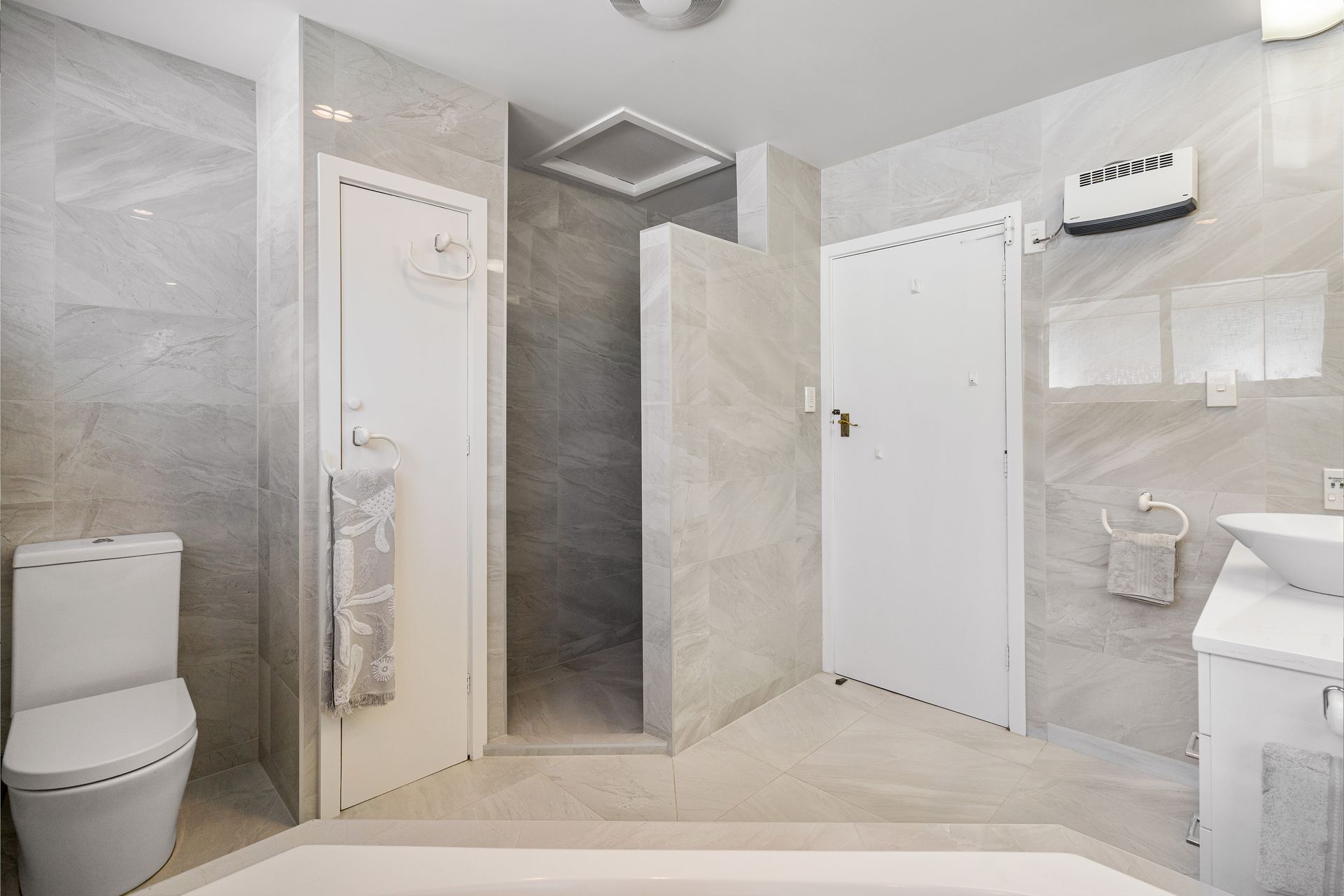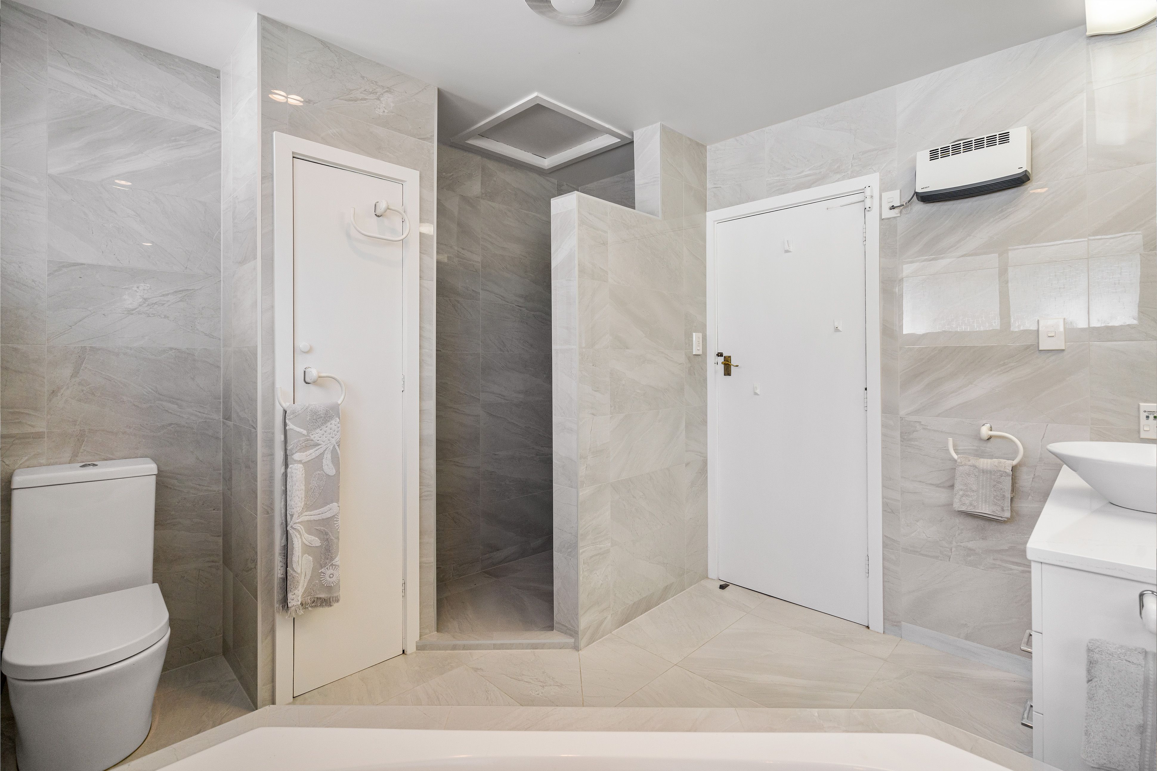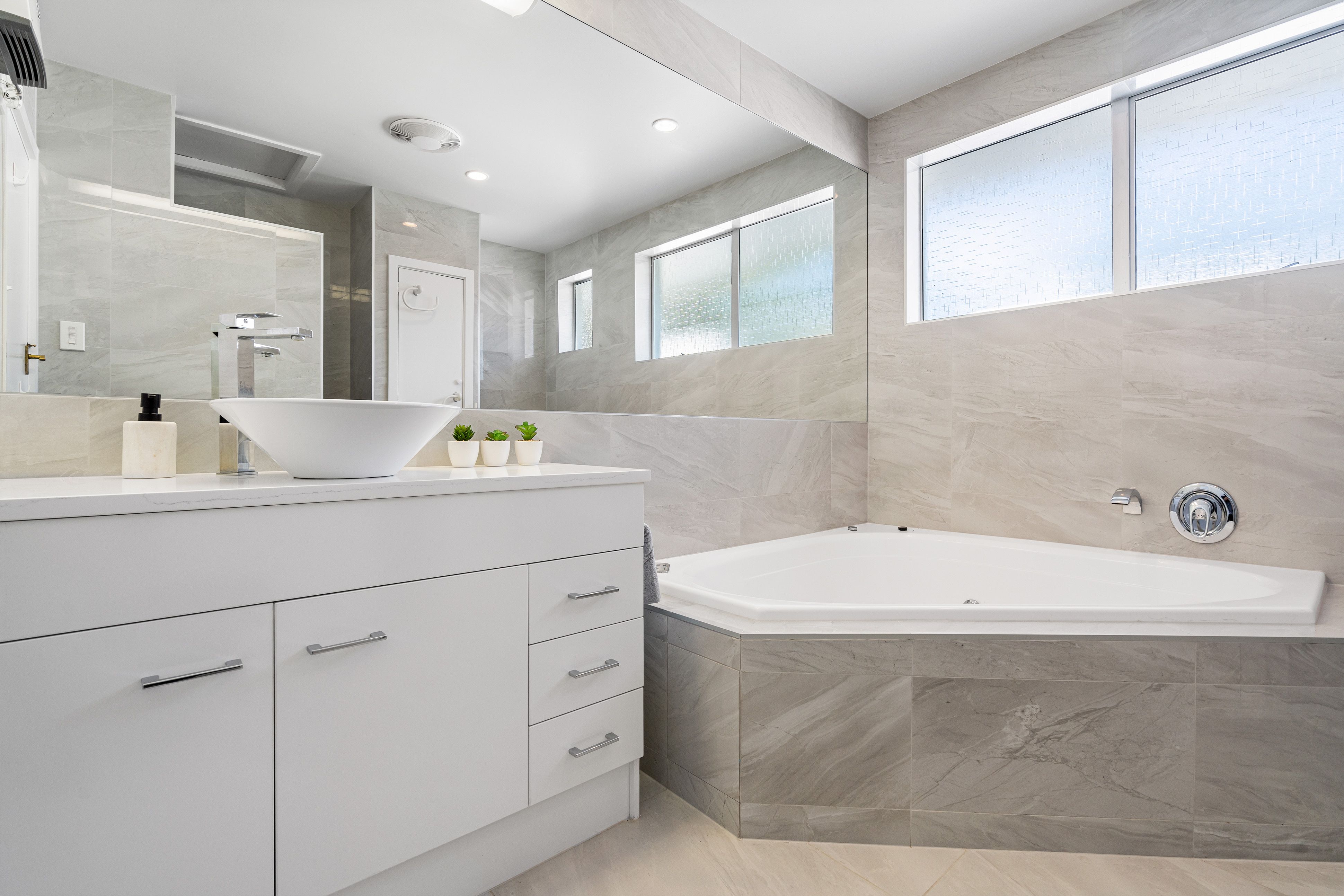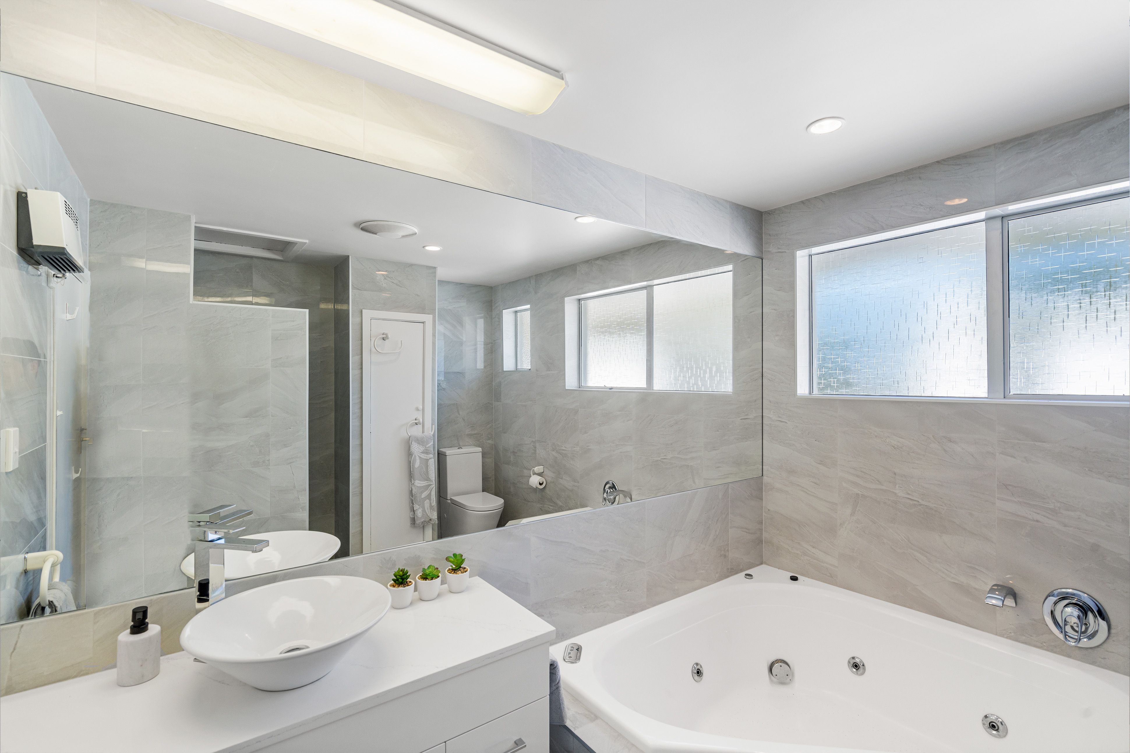 The upper level offers a connected dining room, two generous bedrooms, and two bathrooms with an ensuite for the master, while the lower level has one further bedroom and bathroom and a flexible space that could be a home office, rumpus room, or extra bedroom. The master suite is a stunning space with deck access, and a modernised, tiled ensuite.