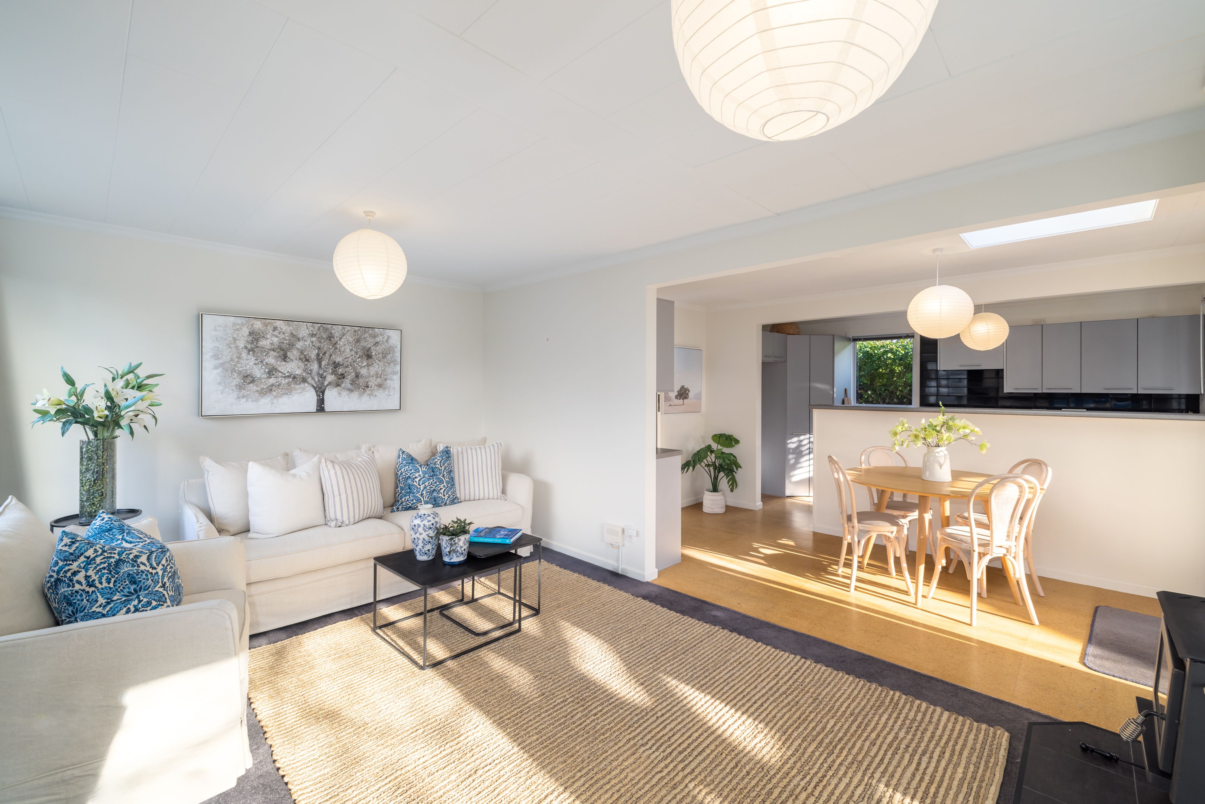 Sunny open plan kitchen, dining and living opens to a north facing deck via bifold doors.