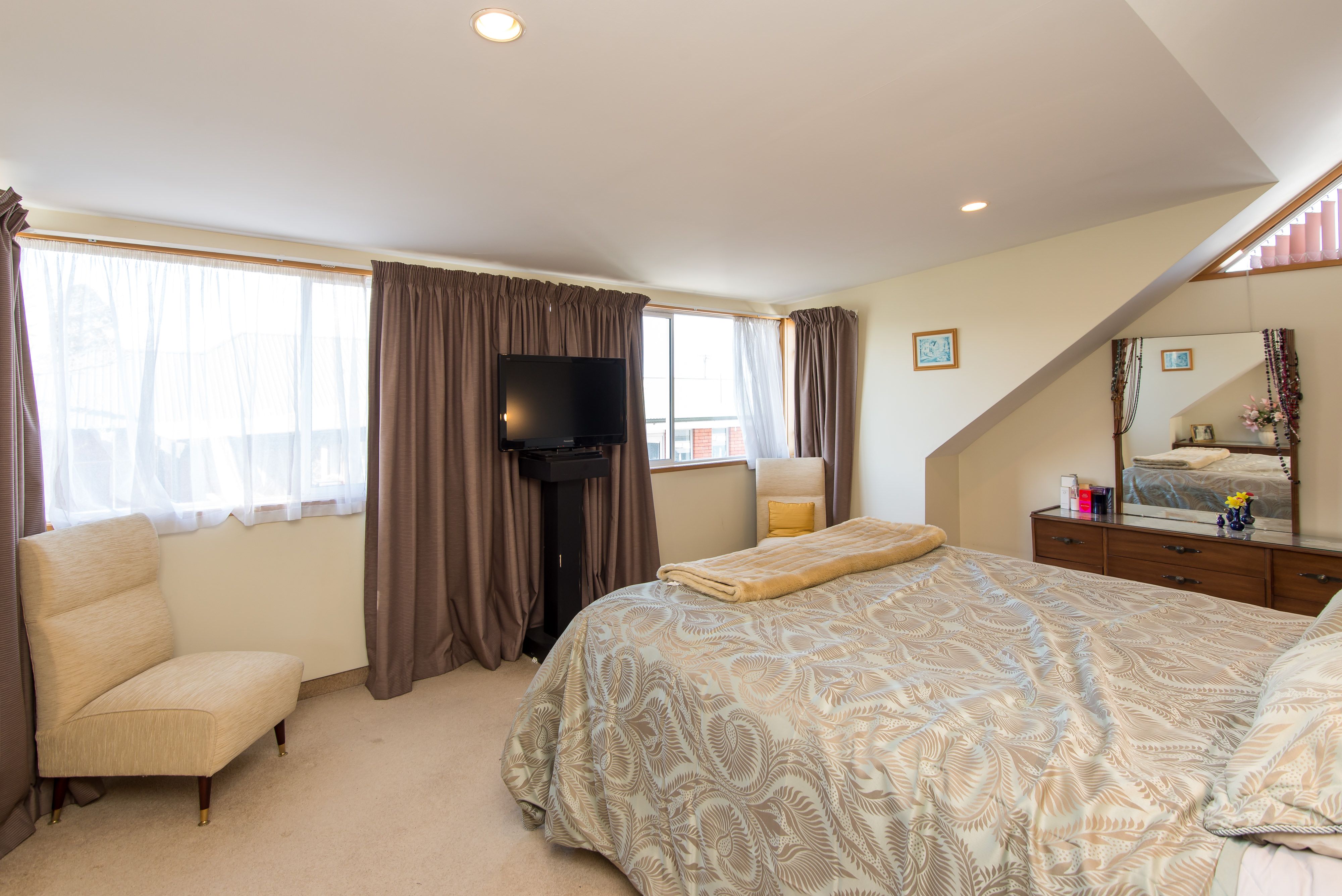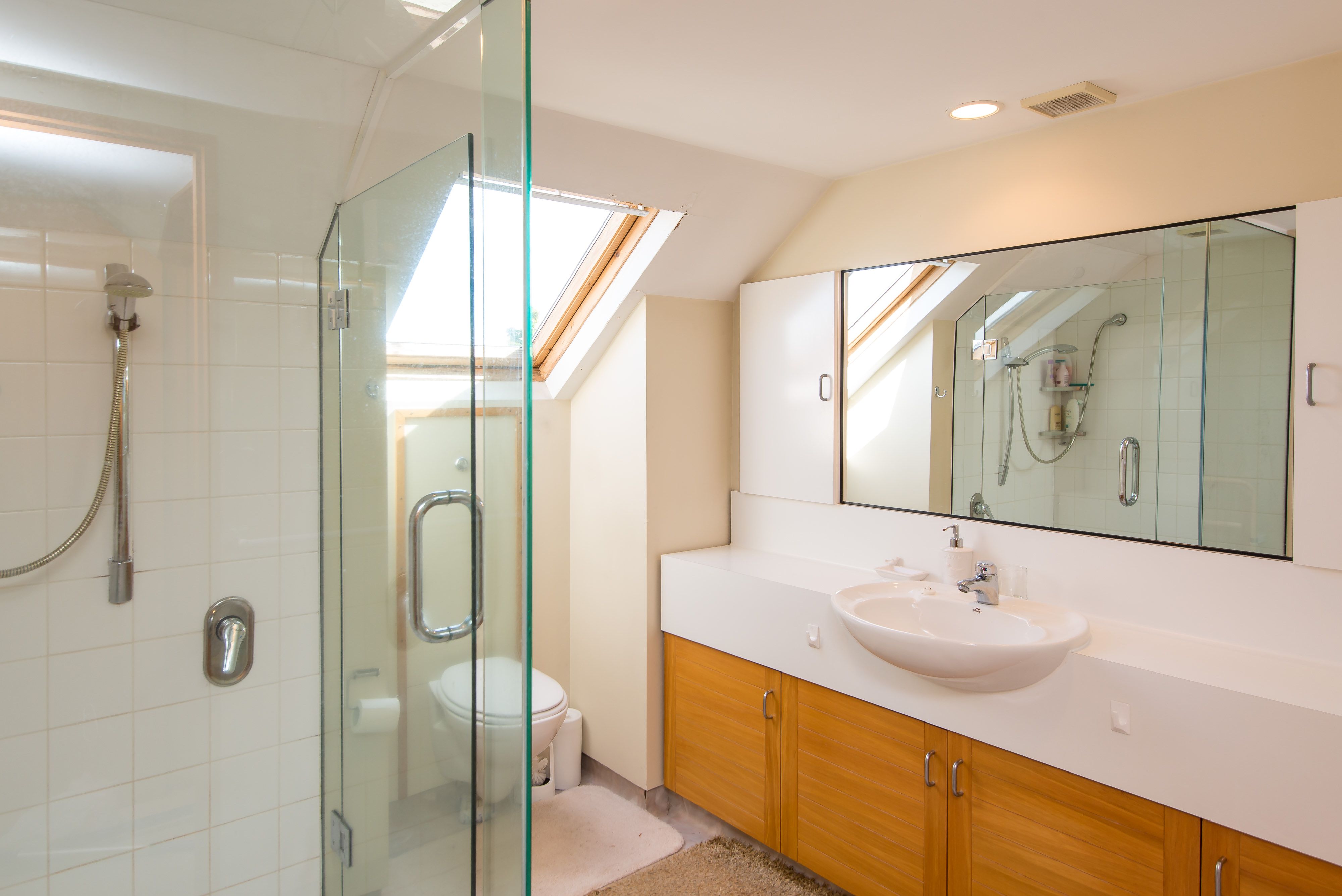 The stairs lead us to a tremendously sized main bedroom floor with its own ensuite. Natural light and fresh air is at your finger tips, with windows framing the master suite and an extensive walk in wardrobe with its own storage/attic area.