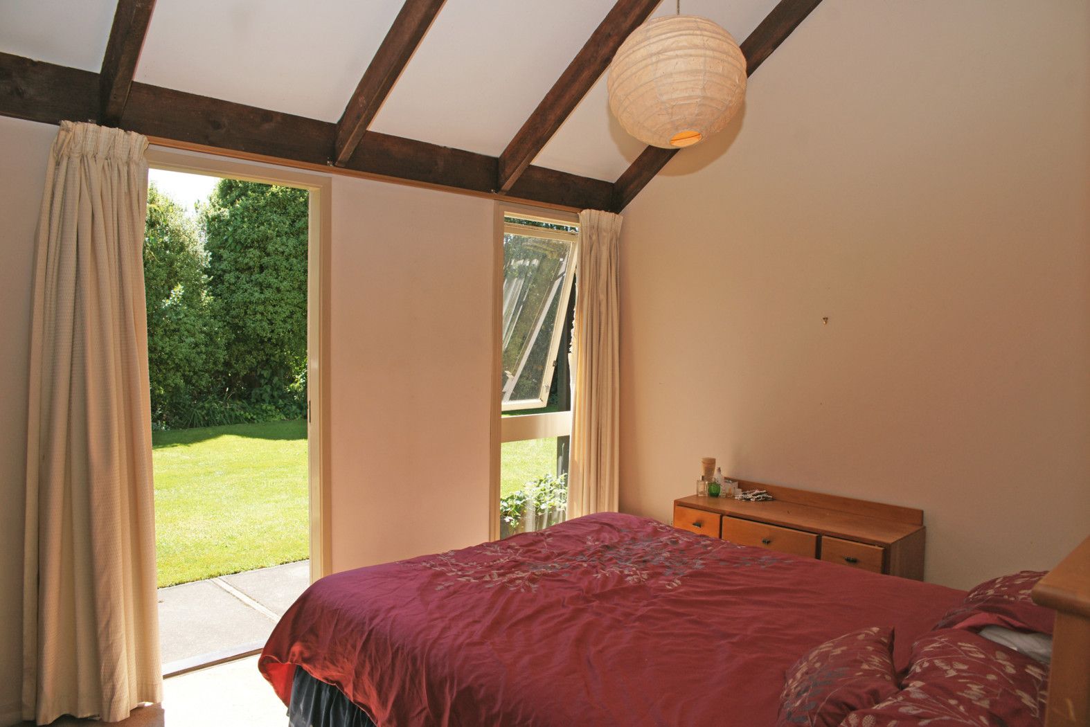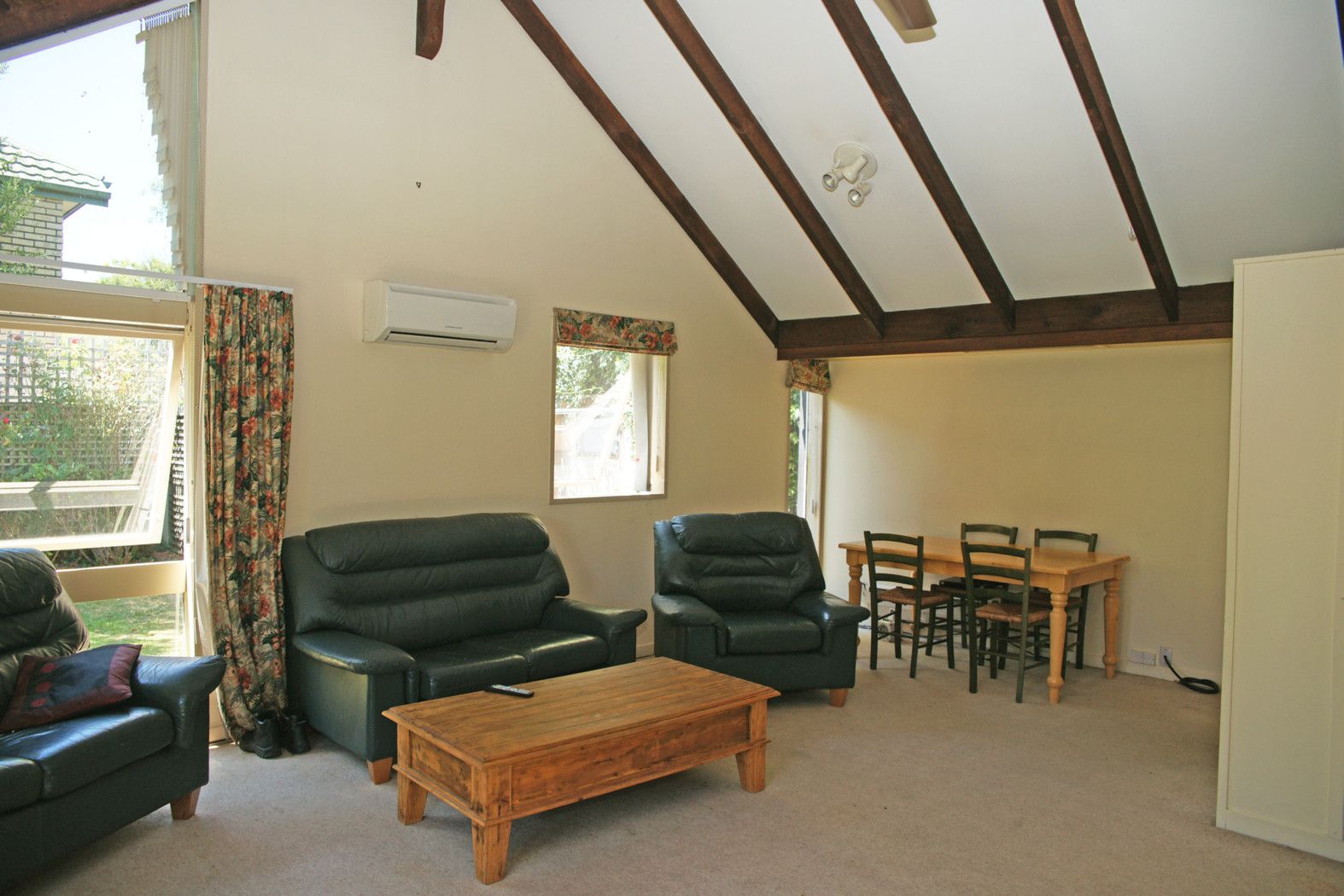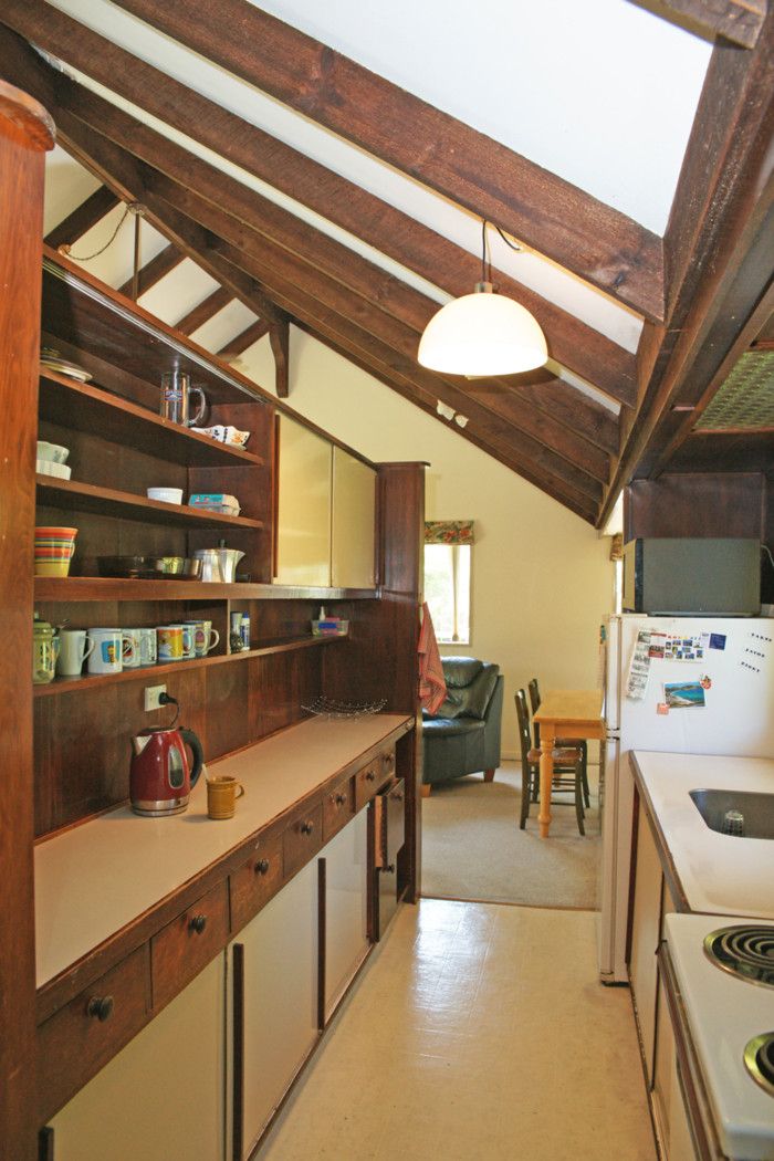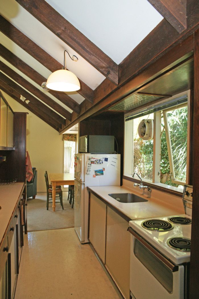 High pitched beamed ceilings and plenty of large windows give a fabulous sense of space and light in the roomy open plan living area. The galley kitchen offers plenty of bench and storage space, and with ceiling fans plus heat pump there will always be perfect temperature control.