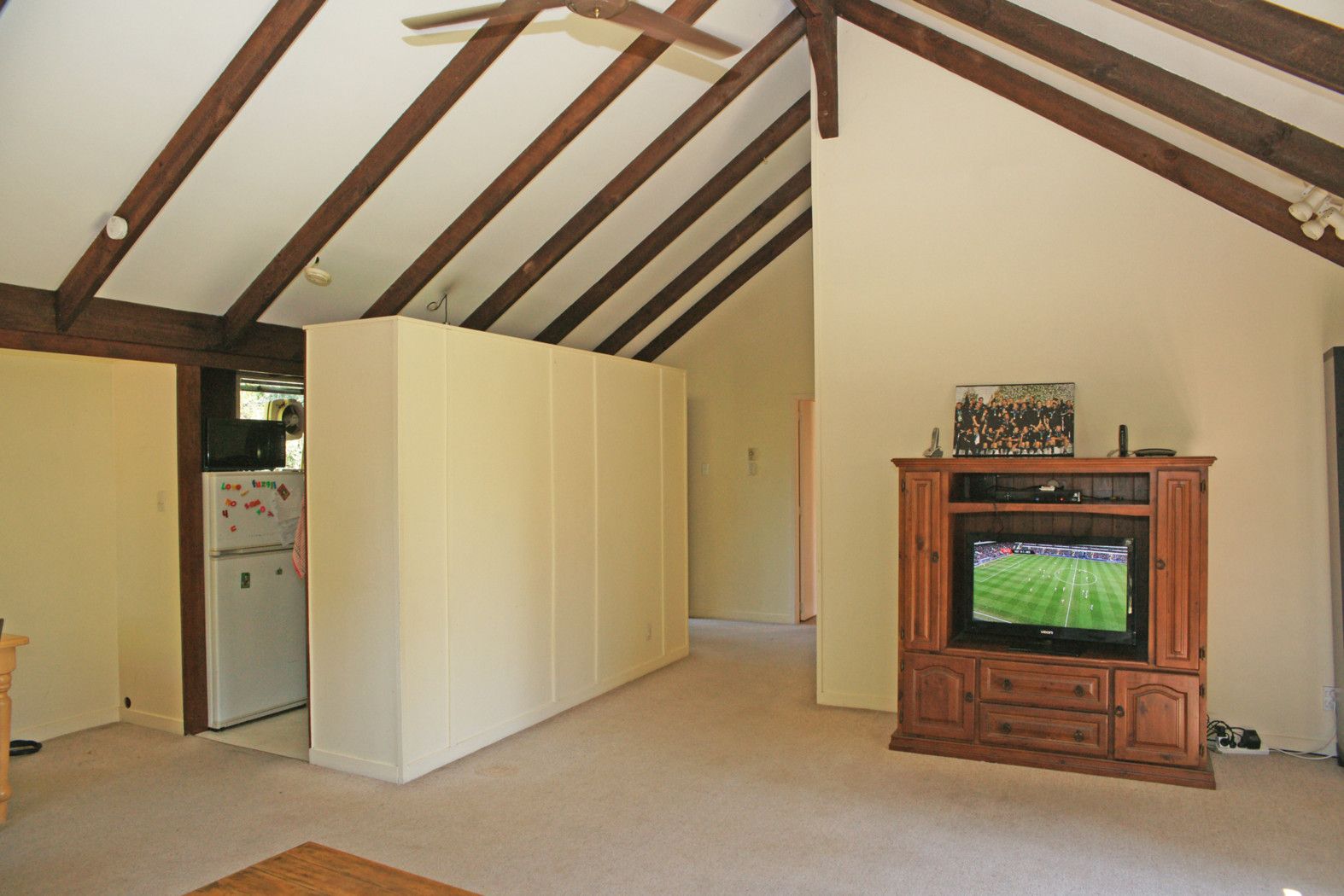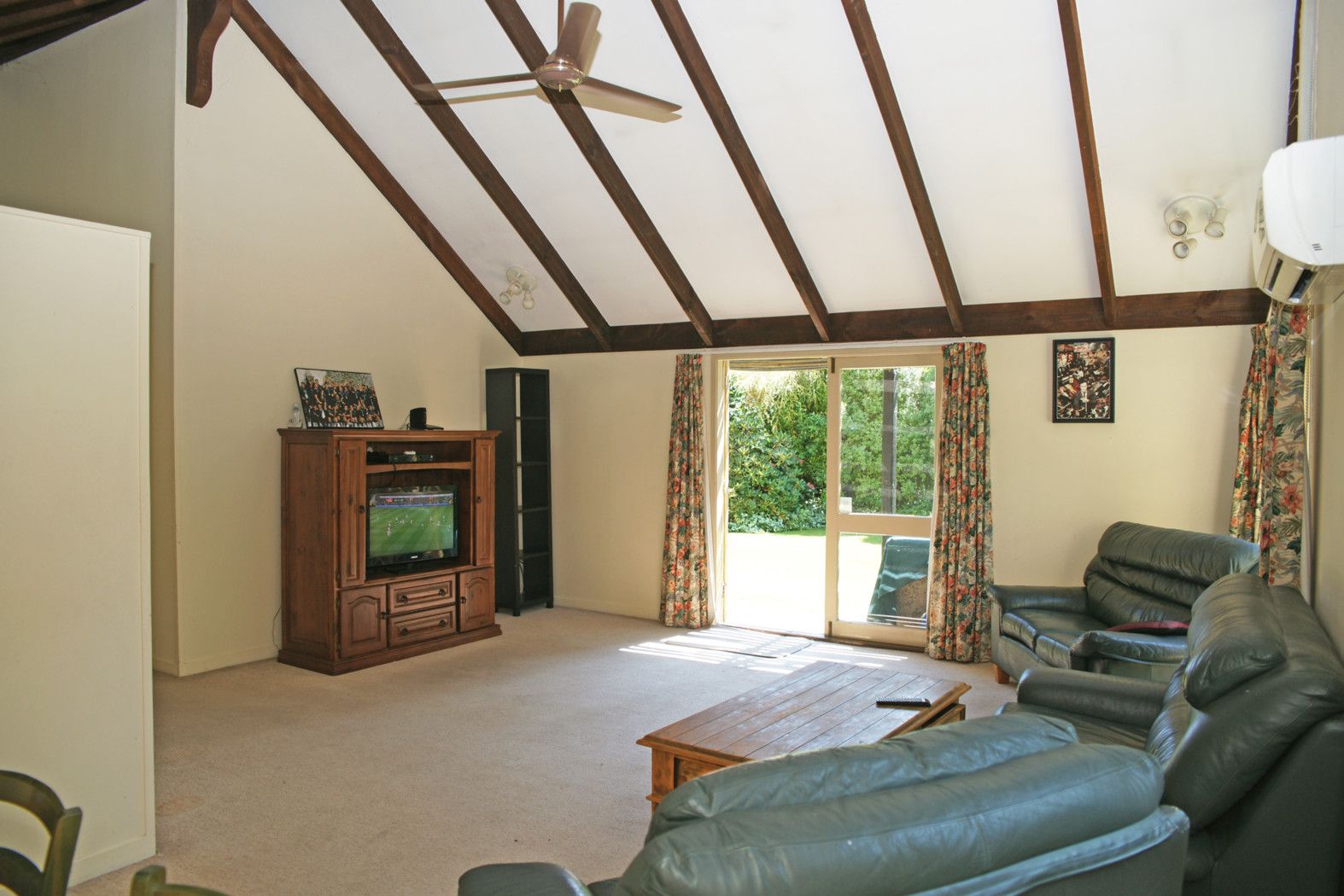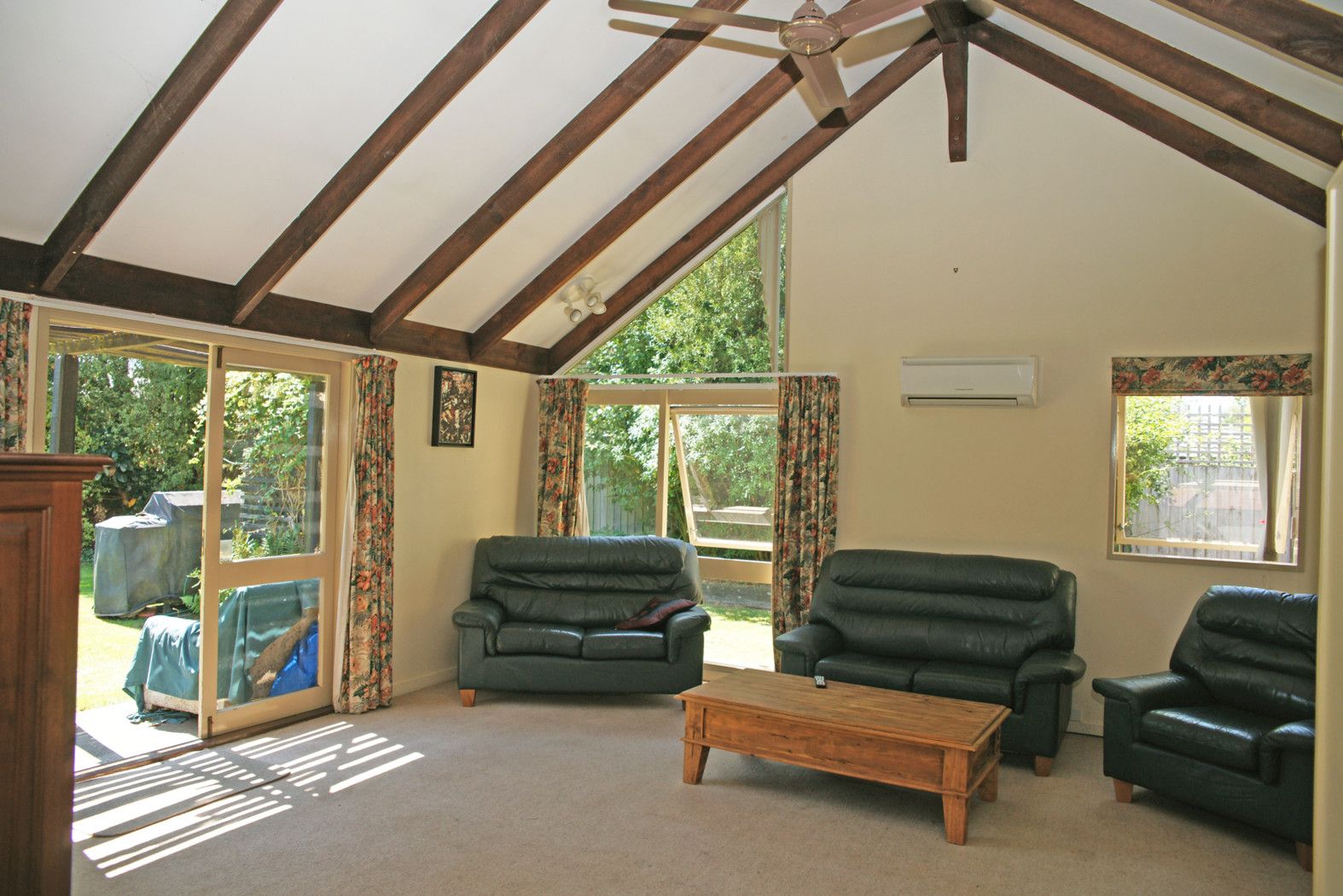 High pitched beamed ceilings and plenty of large windows give a fabulous sense of space and light in the roomy open plan living area. The galley kitchen offers plenty of bench and storage space, and with ceiling fans plus heat pump there will always be perfect temperature control.