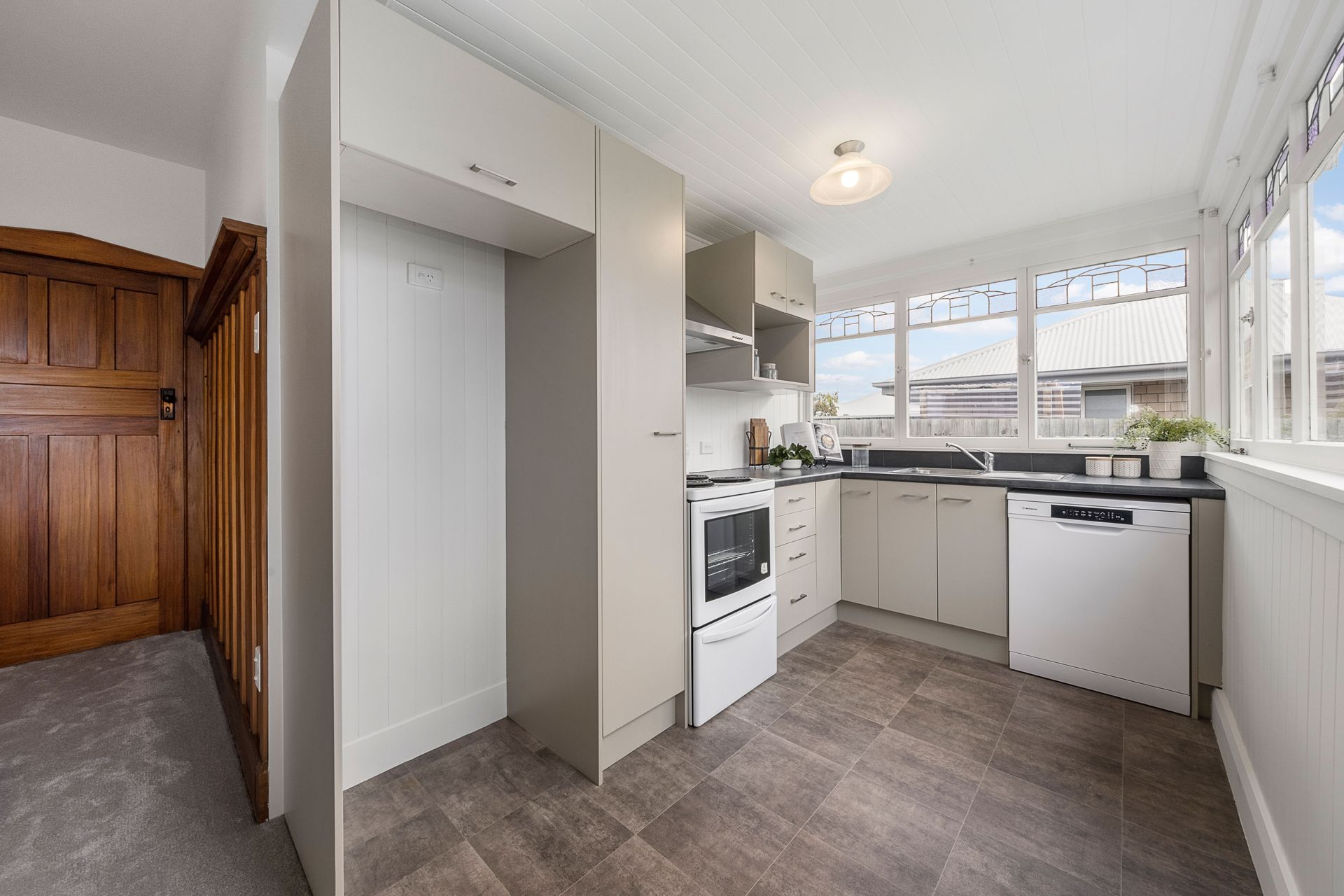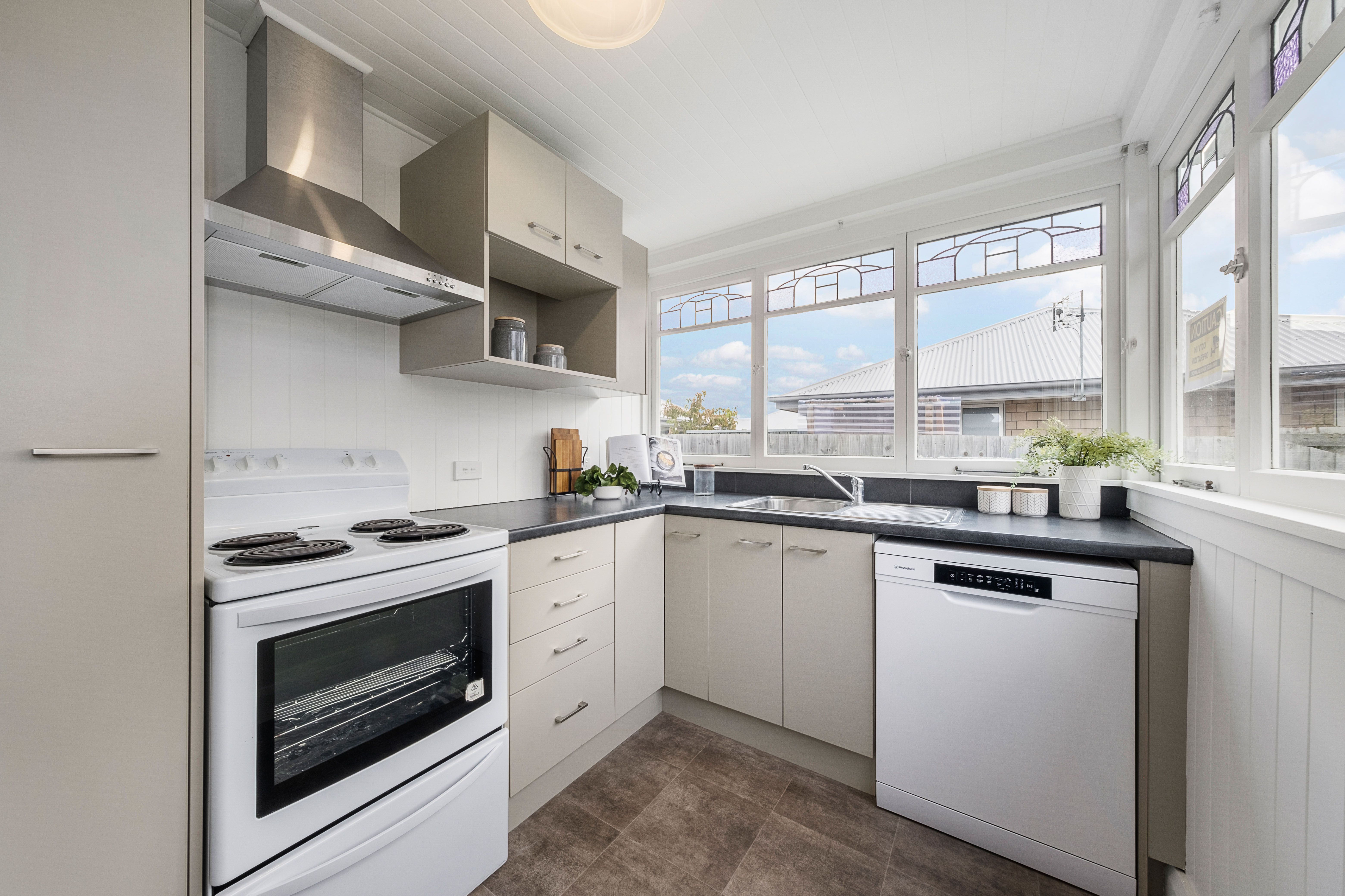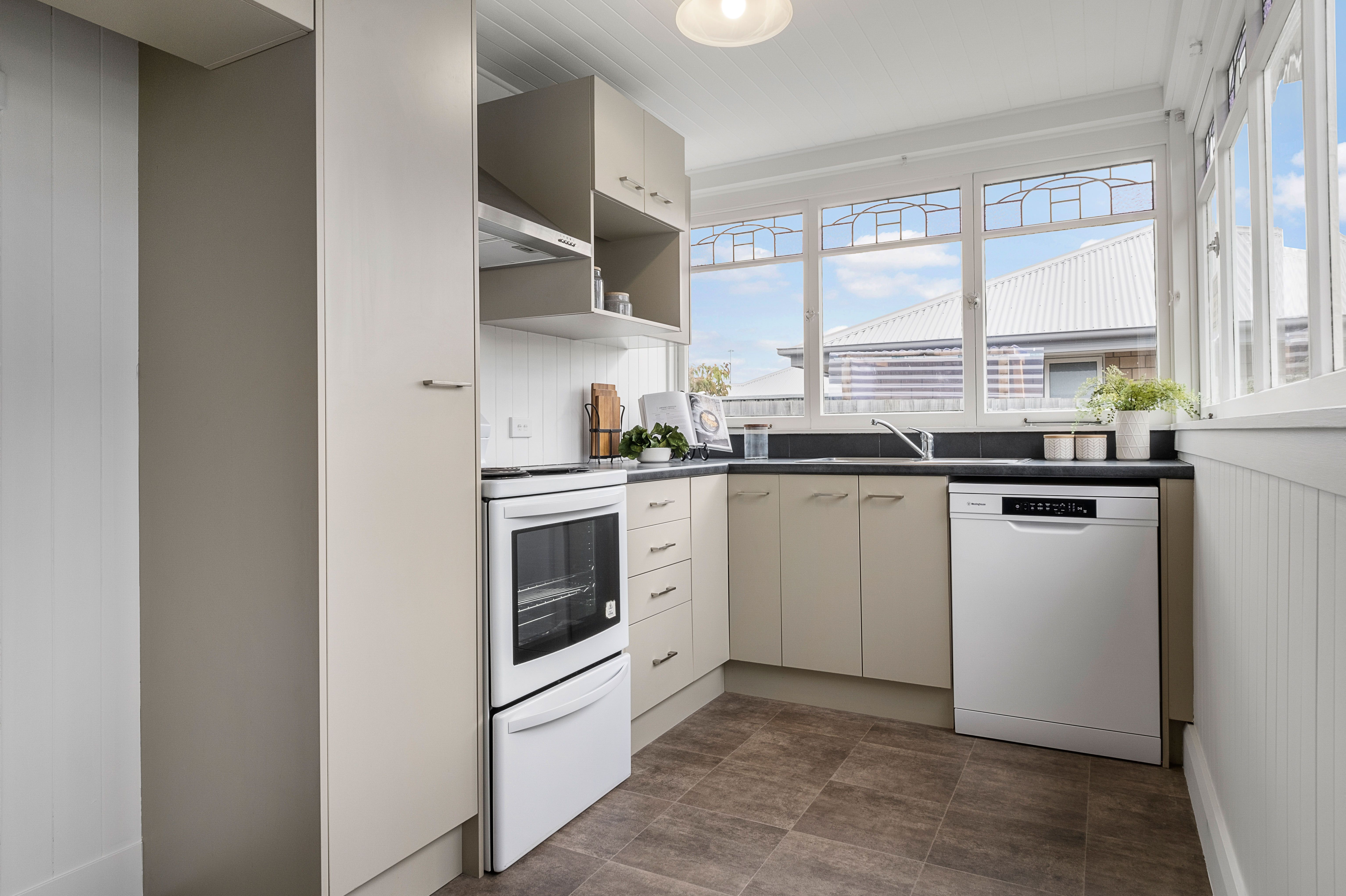 The kitchen is situated at the front of the home, with street views to watch the world go by, and overlooks the fully fenced front lawn, ideal for kids or pets.