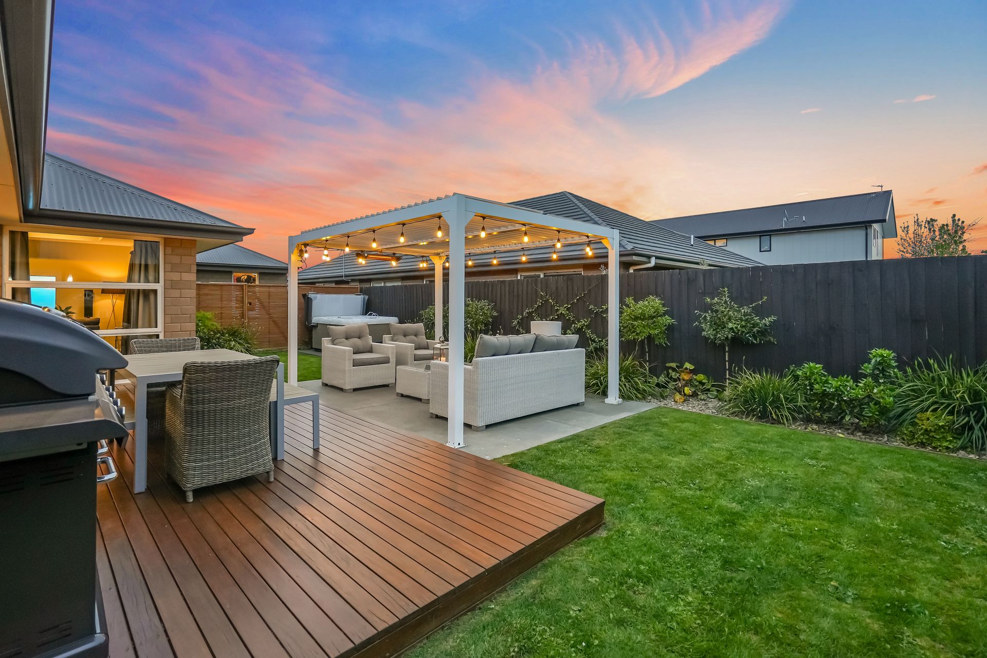 This outdoor oasis is truly enchanting, with a pergola and deck providing the ideal spots to unwind or entertain. The built-in irrigation system ensures that your garden will remain lush and vibrant year-round, making this a picturesque and low-maintenance haven.