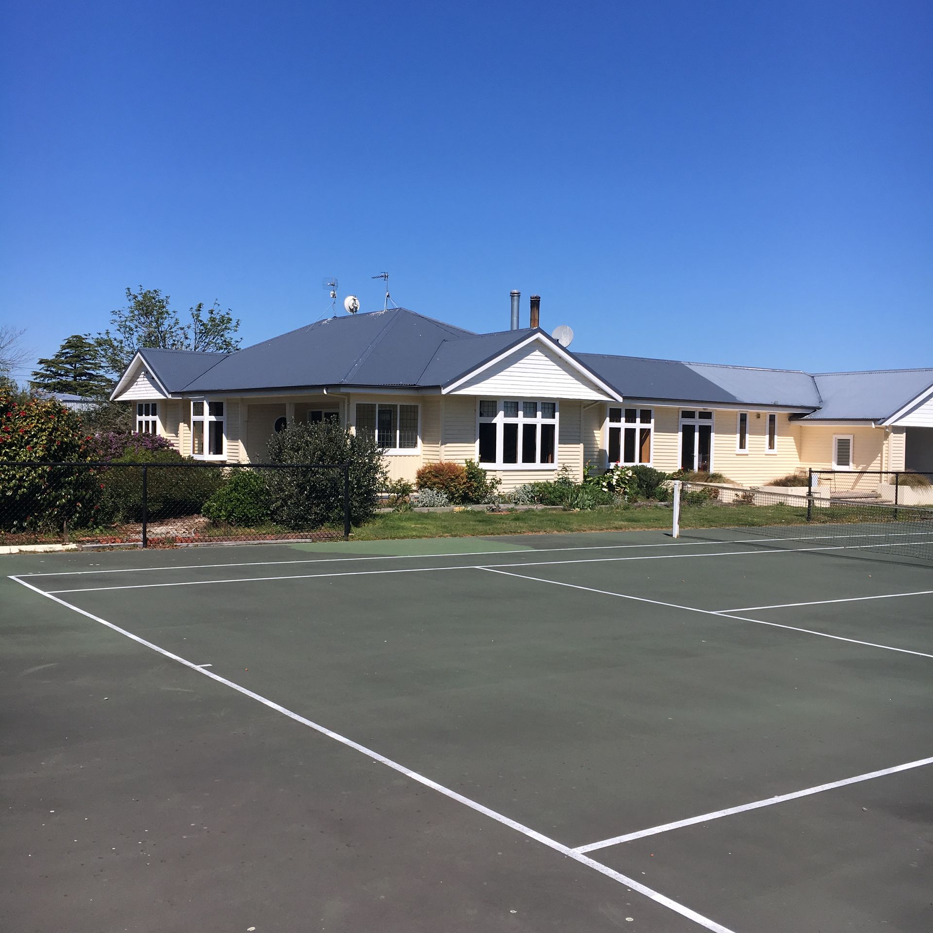 Great outside living with a veranda, a paved area and even a tennis court.