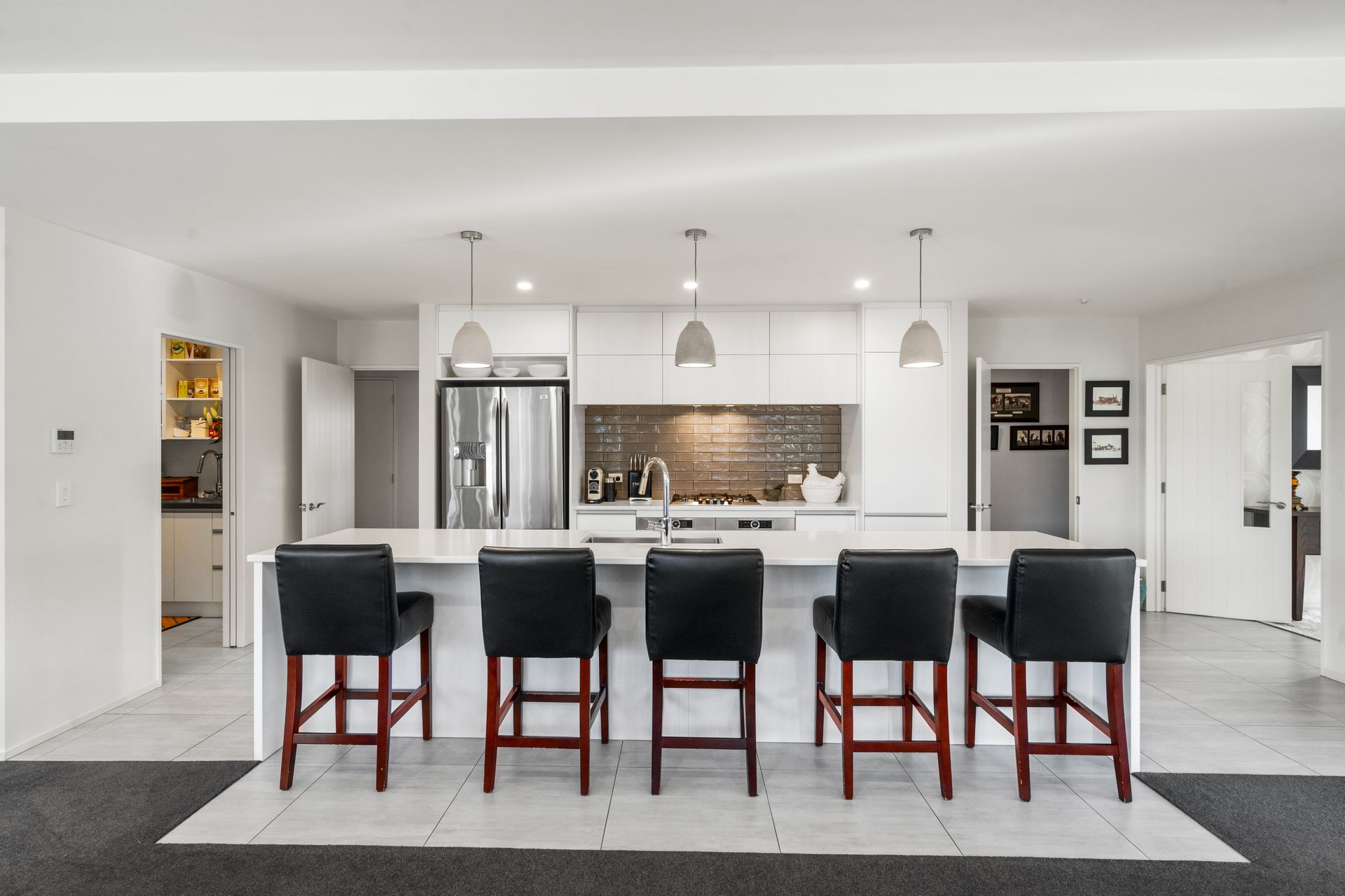 The remaining four bedrooms are generously sized, each featuring built-in double wardrobes. The main bathroom is stylish and practical, equipped with a tiled shower, underfloor heating, and a separate toilet. A dedicated laundry room caters to all your storage needs.