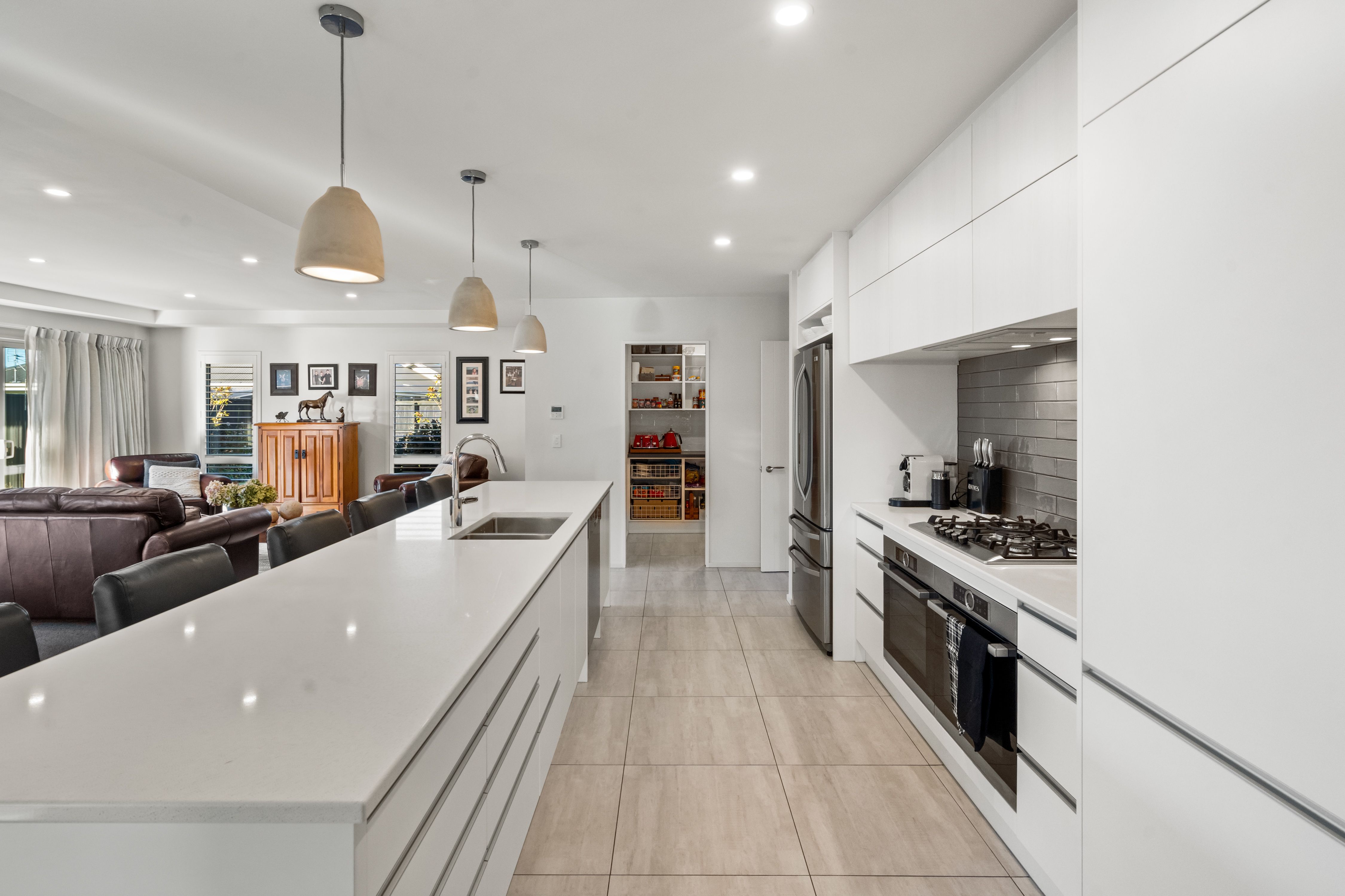 The heart of the home features a beautifully flowing kitchen, dining, and living area, complemented by a separate lounge. These spaces effortlessly open onto a spacious deck, making it the perfect spot for entertaining family and friends. The kitchen is a dream, boasting stone benchtops, ample counter space, a double sink, a gas hob, and a separate scullery for added convenience. The separate lounge, with its cozy gas fireplace, provides an inviting atmosphere for relaxing evenings.
