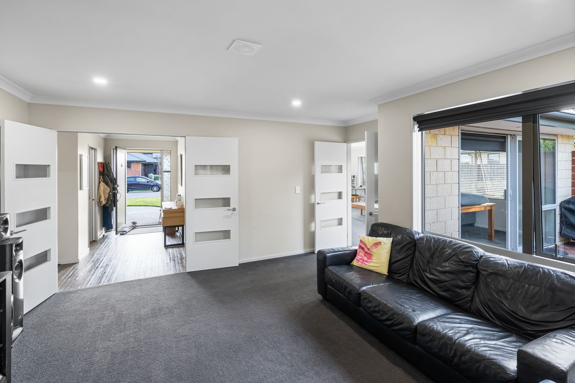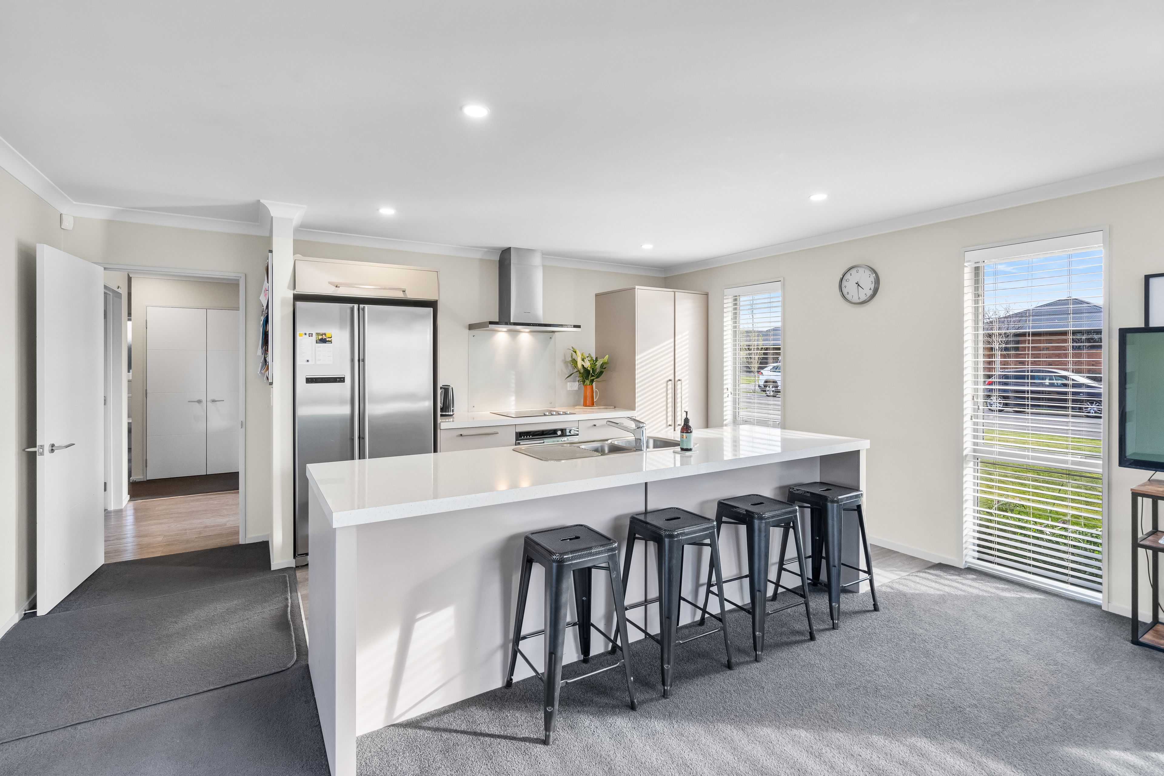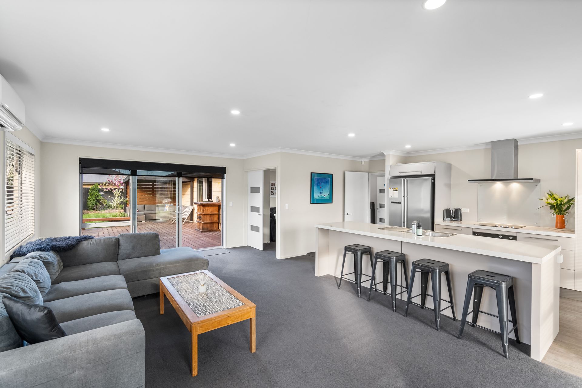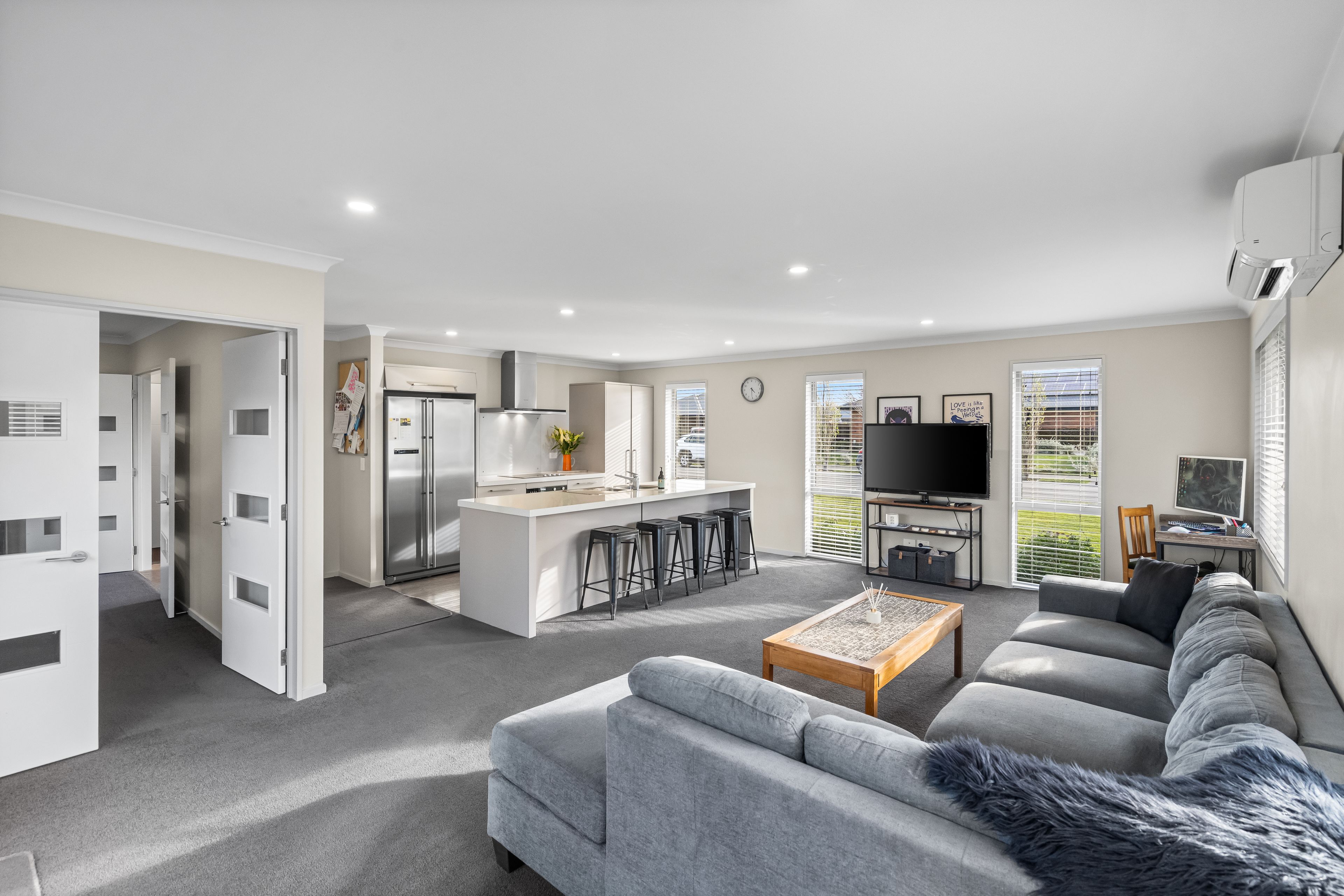 Upon entering the heart of this residence, you'll be welcomed by an expansive open-plan living area. Abundant natural light streams in from all directions, creating a warm and inviting space for hosting family and friends. The modern kitchen is equipped with a double plumbed fridge space, an electric hob, a wall oven, ample storage, and a convenient breakfast bar. The separate lounge offers versatility, serving as a space to keep the kids entertained or as a cozy family media room. Ensuring year-round comfort is a breeze thanks to the heat pump, wood burner, and heat transfer system.