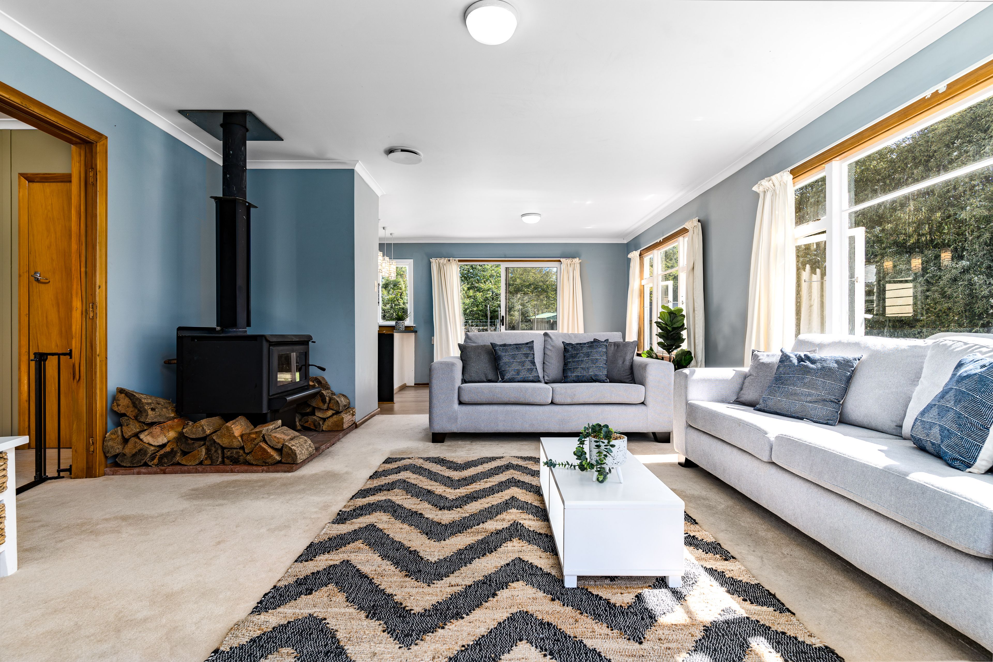 The spacious open plan living with French doors opening to the front deck and a slider leading to the backyard present excellent indoor / outdoor living options. Bathed in light, the open and airy living quarters will not disappoint. The extra-large wood burner with wet back completes this space.