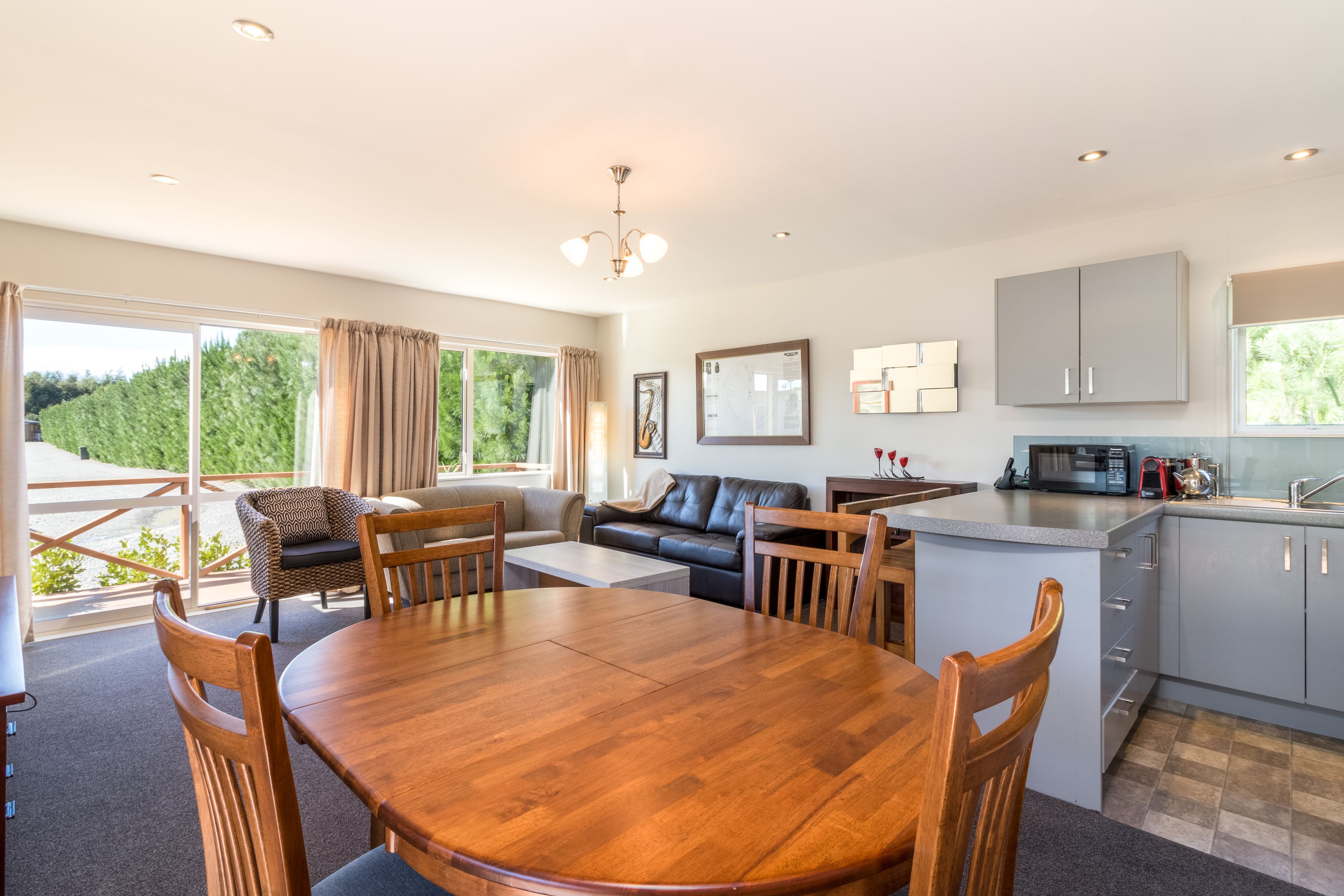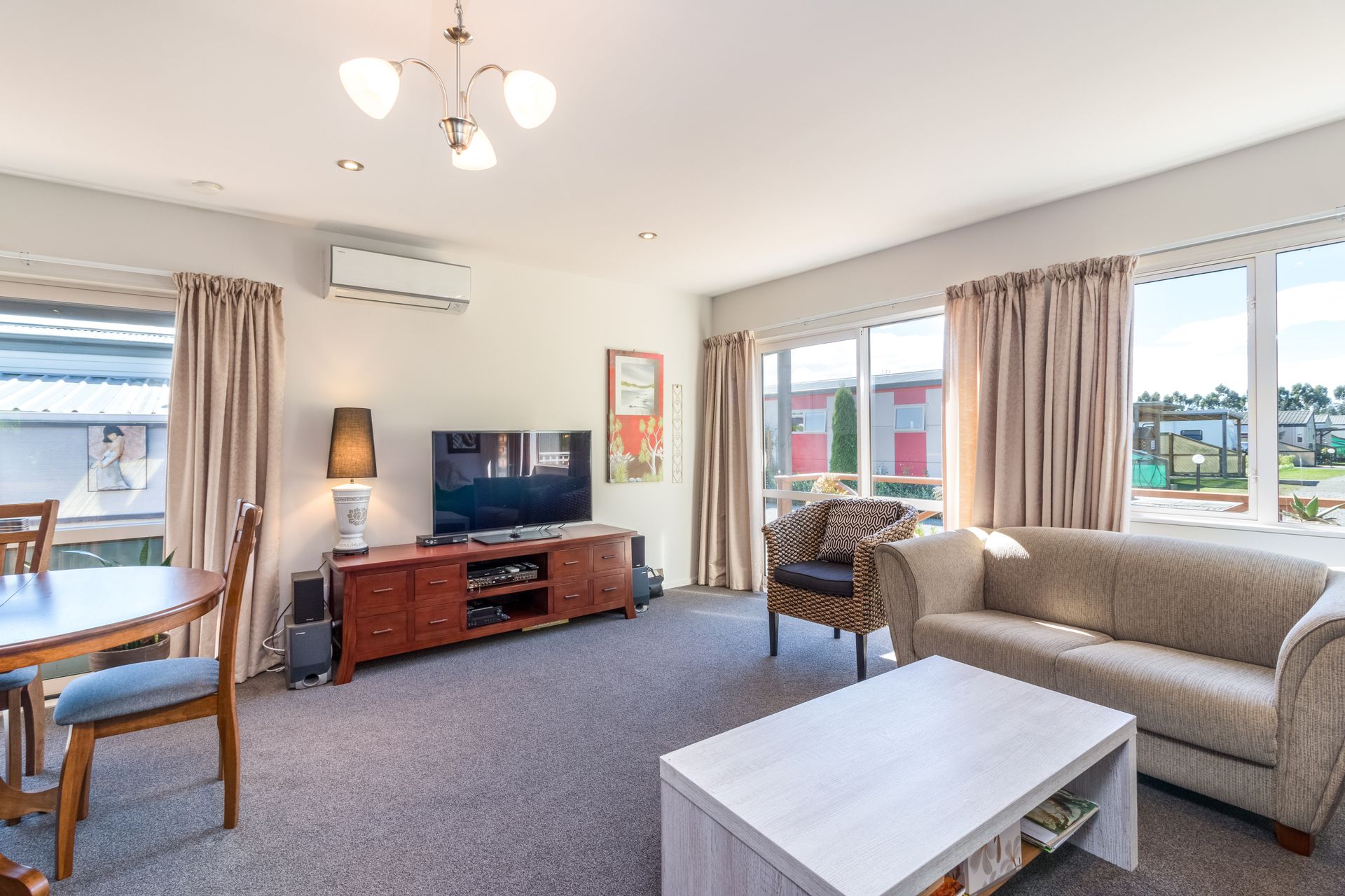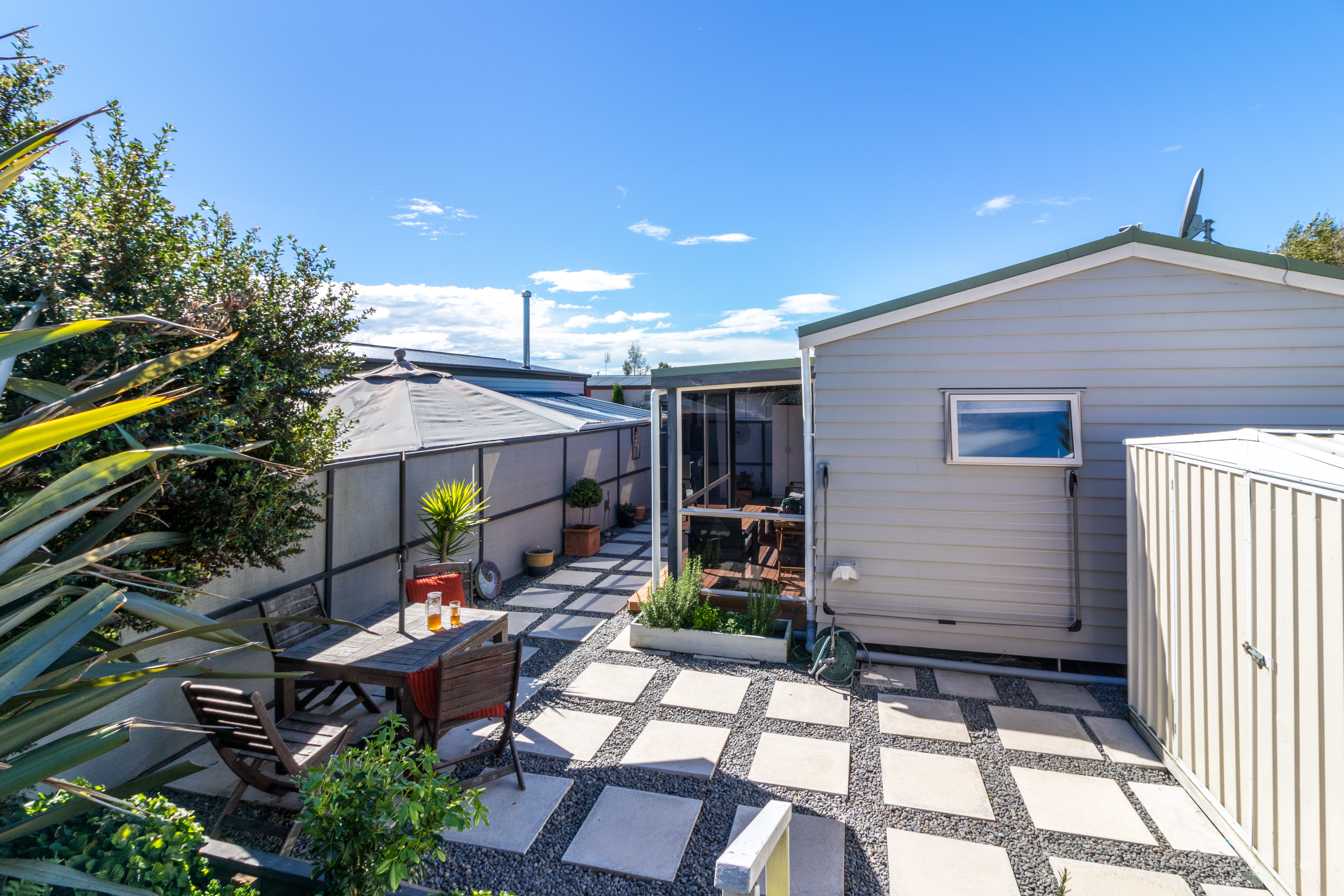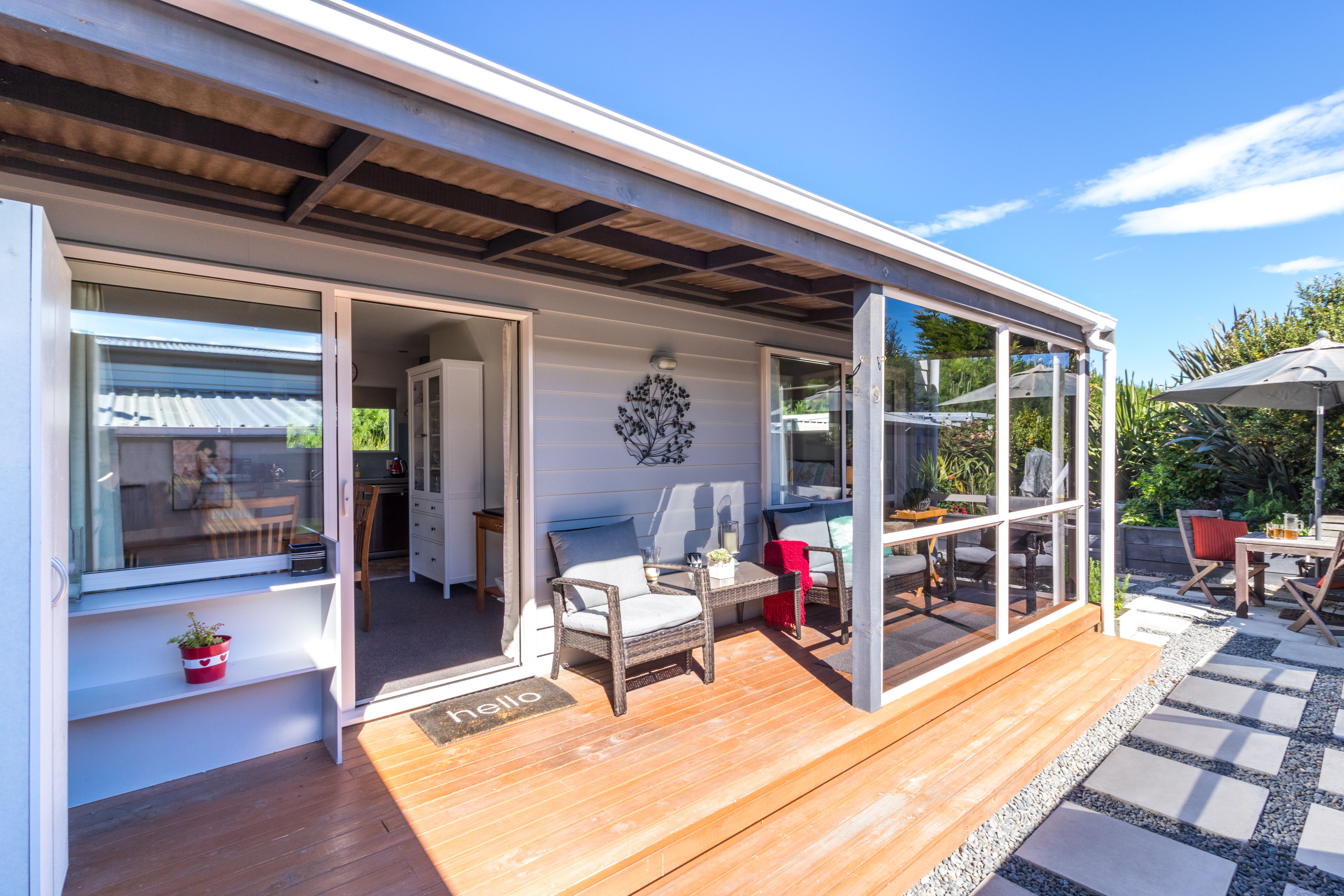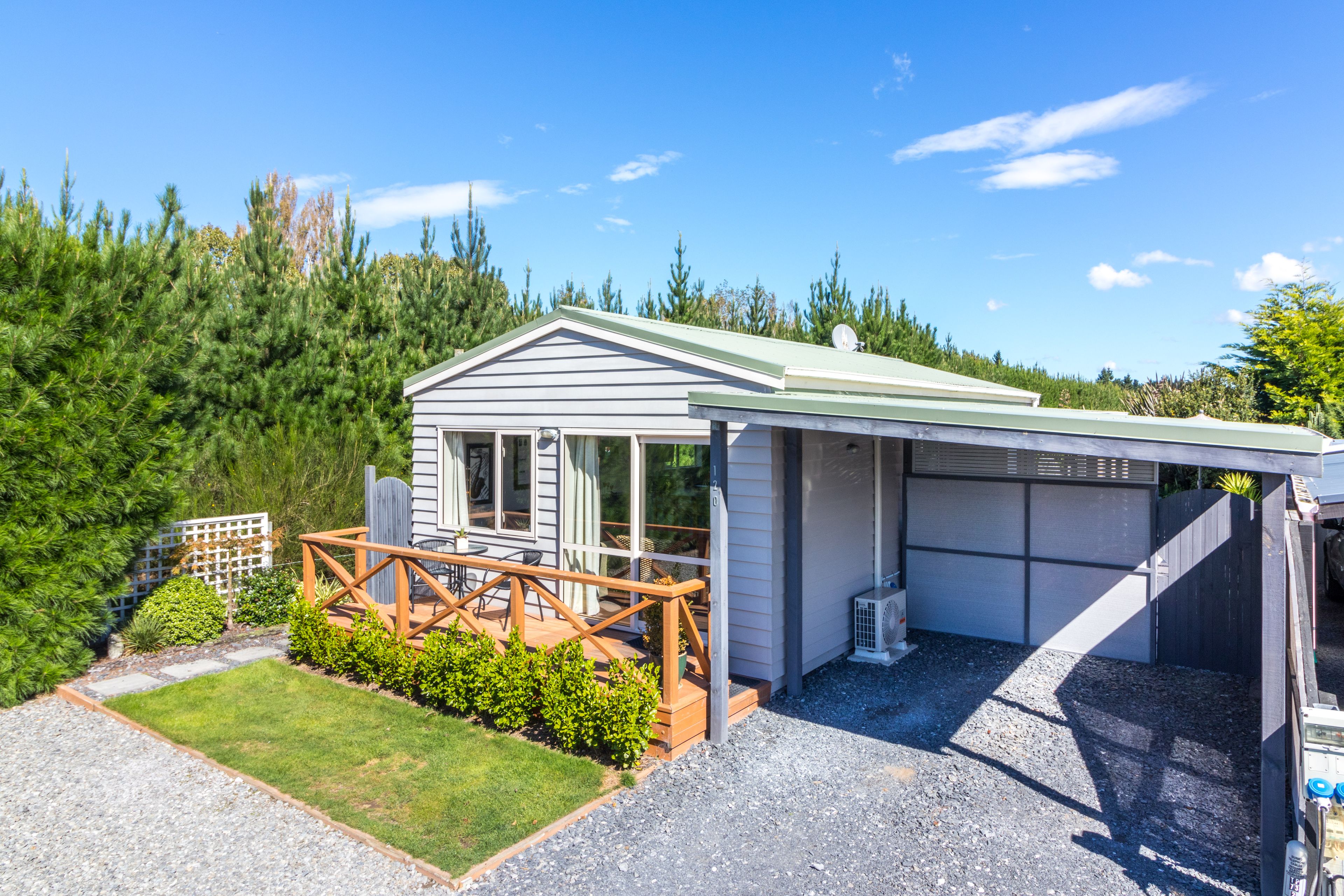 Retiring or Downsizing? Holiday Bach or Rental investment? Consider these wise options of living in the serenity of the increasingly popular Riverlands Holiday Park. The new trend of 'less is more' needs to be appreciated in this stunning modern, double glazed transportable cottage, designed for permanent living and comfortably nestled at the end of a row on a secluded, private leasehold site. Glass sliders open from the double bedroom and spacious open plan living area onto a lovely sunny, partially enclosed deck and paved courtyard. The established landscaped garden further entices you up a short pathway leading through to the golf course. Warm neutral tones; heat pump; gas hot water; kitchen with gas cooking hob and electric oven; bathroom with shower; basin and flushable toilet connected to the holiday park sewerage system; separate laundry shed; covered carport and additional parking bay makes this home everything you'll ever need.