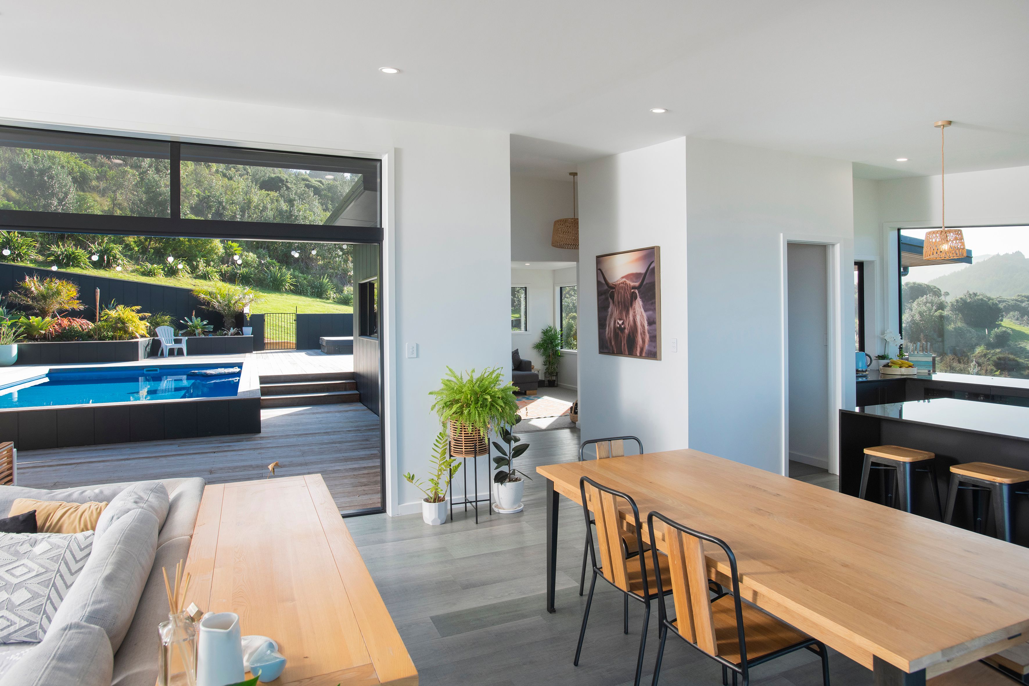 The main living level offers a bespoke kitchen paired with colour match appliances, open plan dining and living area while stacking doors create flow to the front and back decks. Admire the ever changing Pacific Ocean at the front while the back opens to your own private oasis with a pool, built in spa and covered outdoor kitchen. A separate lounge off the main entrance adds functionality to family life and a space to retreat and relax.