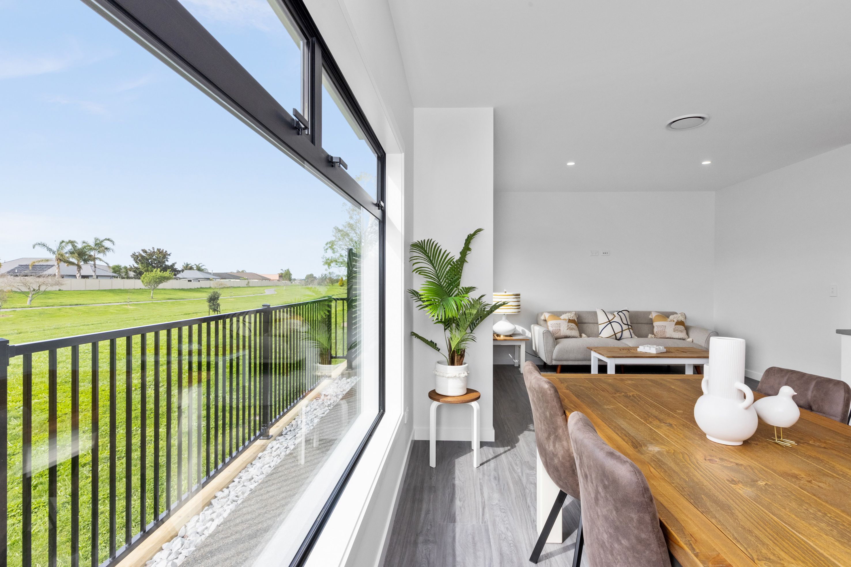 The spacious open plan living area perfectly orientated for all day sun and capturing wide views across the green reserve and Taipo stream to the hills beyond makes this home exceptional.
